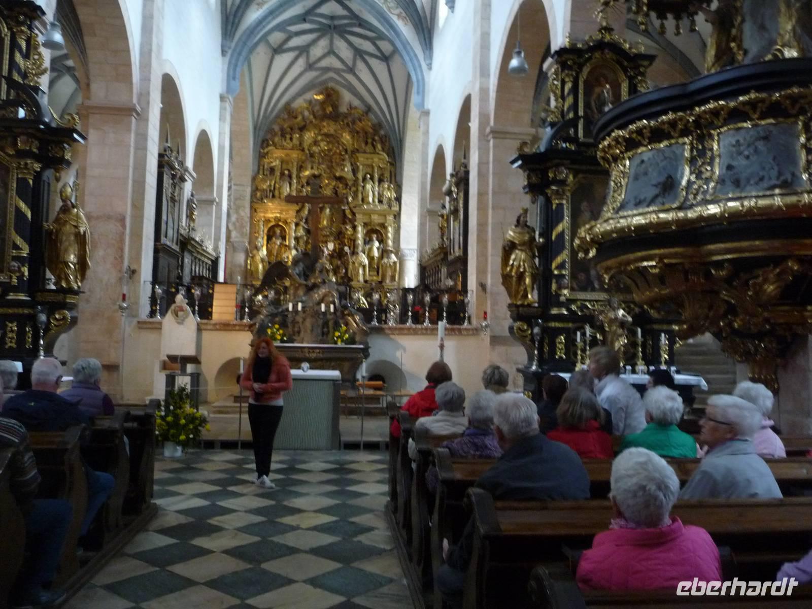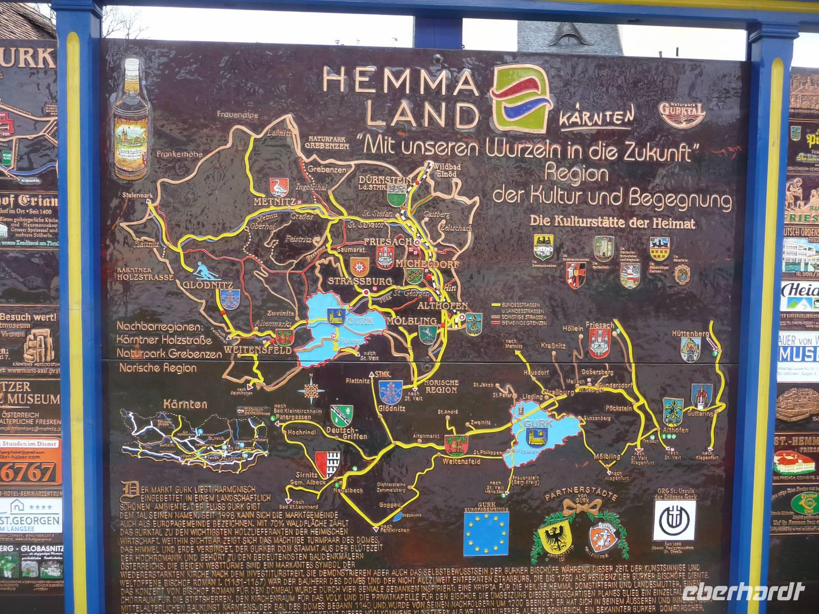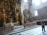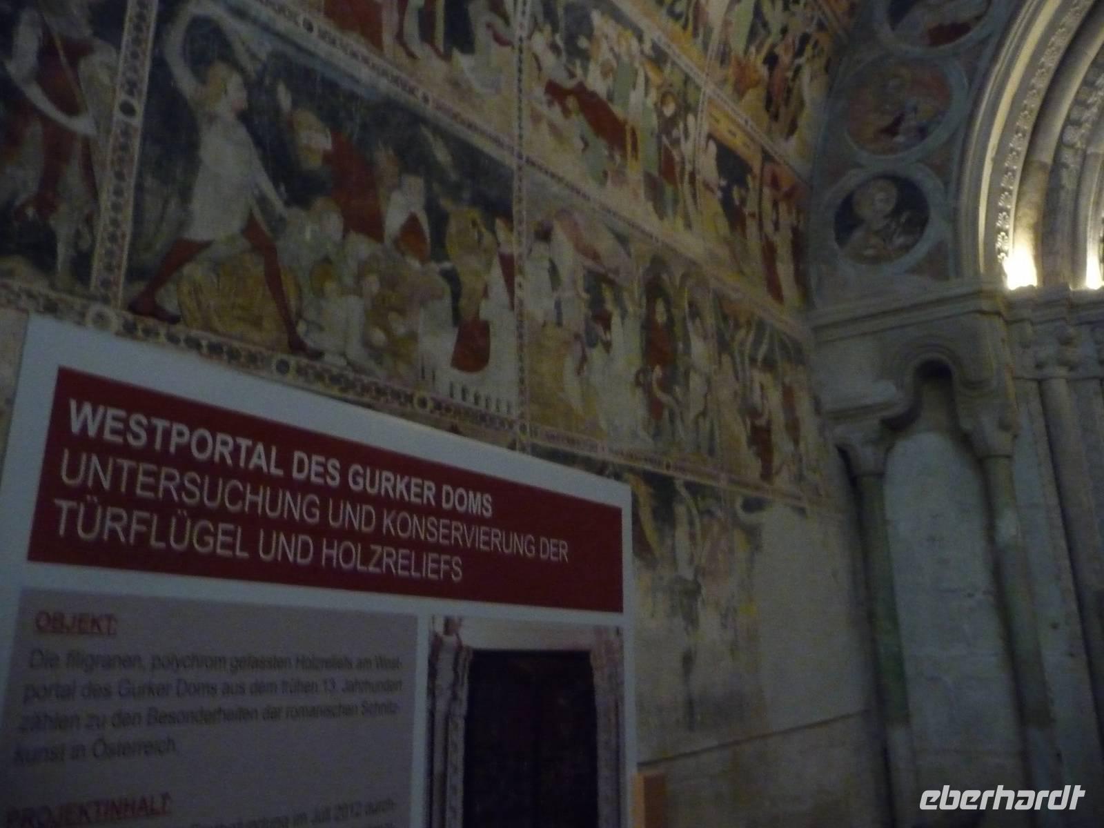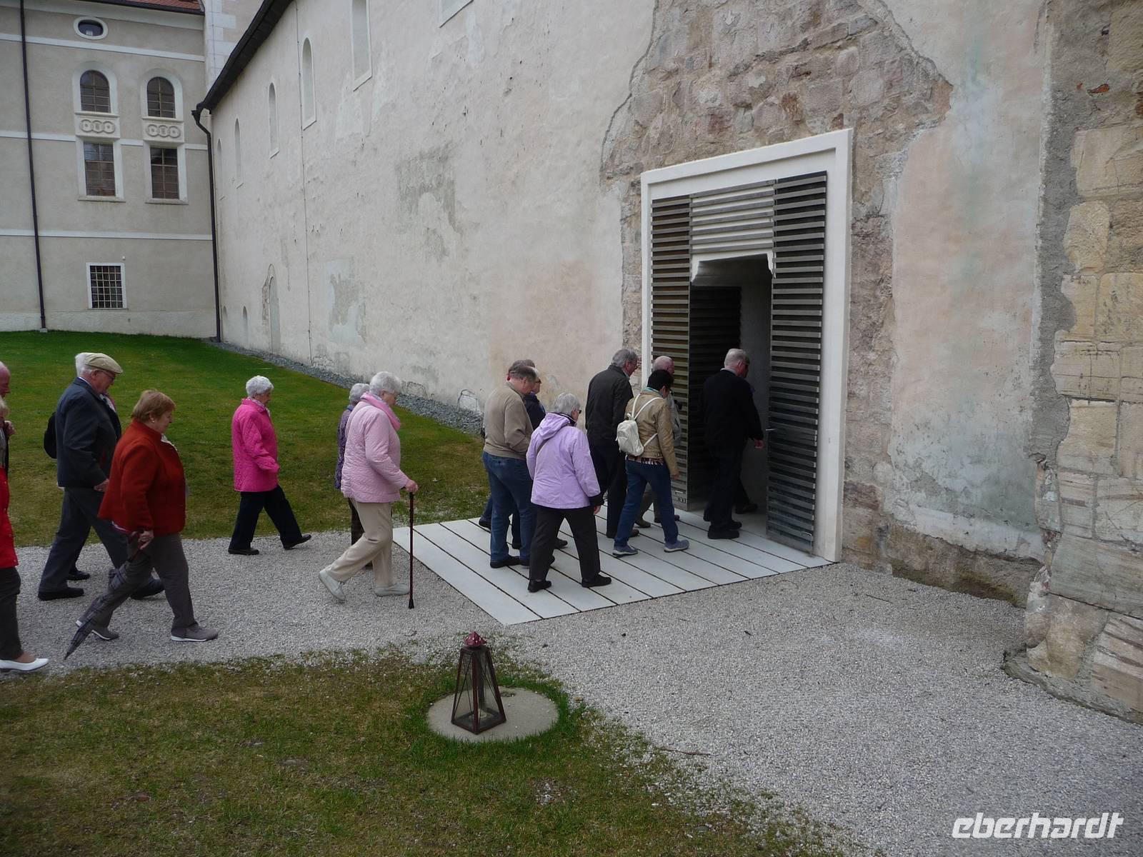 Heute sind wir, wieder bei schönstem Kärntner Sonnenschein, mit dem Bus durch das wunderschöne sanfte Gurktal bis nach Gurk gefahren, wo wir eines der bedeutenden romanischen Bauwerke in Europa, den Dom zu Gurk besichtigen. Die im hochromanischen Stil erbaute Pfeilerbasilika aus dem 12.Jh. ist, nicht zuletzt durch die 60m hohen Doppeltürme, schon von Weitem gut sichtbar. Cecilia heißt die junge Dame, die uns höchst sachkundig den Dom und das sich daran anschließende Stift Gurk nahe bringt. Besonders beeindruckend sind ihre Ausführungen zum historisch wechselseitigen Bezug zwischen kirchlichen und weltlichen Geschehnissen. Besonders beeindruckend die mit 100 Säulen gestaltete Krypta mit dem Grab der heiligen Hemma, der Stifterin des Gurker Doms.
