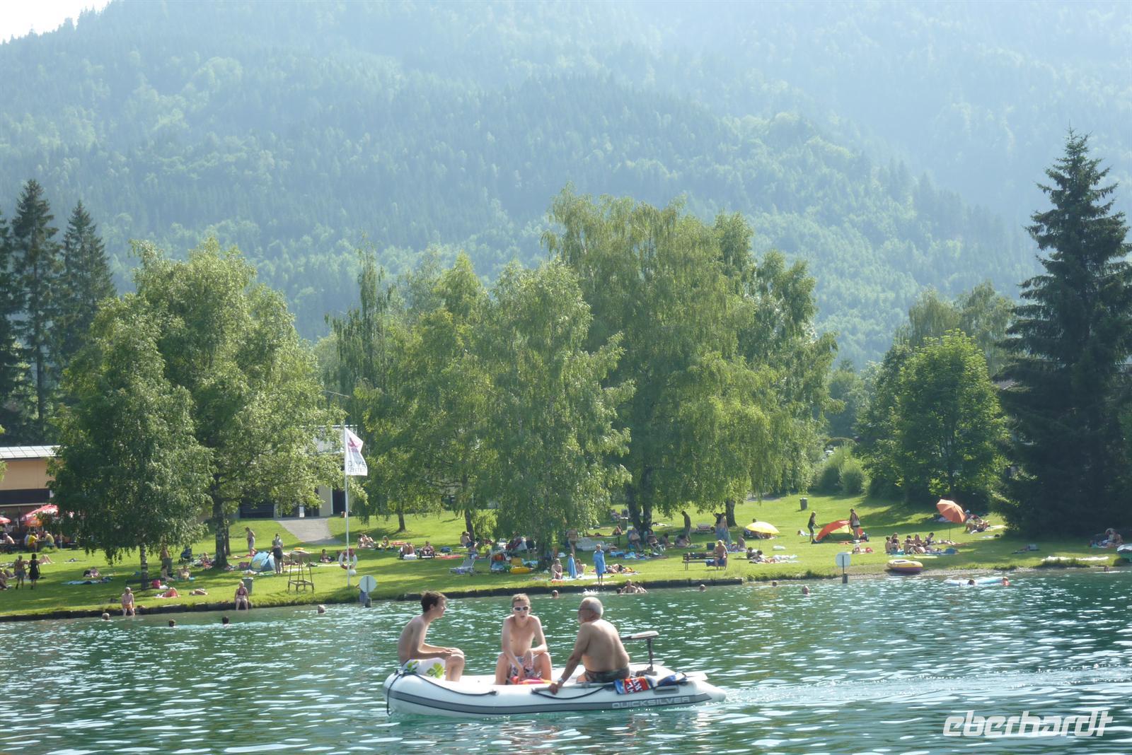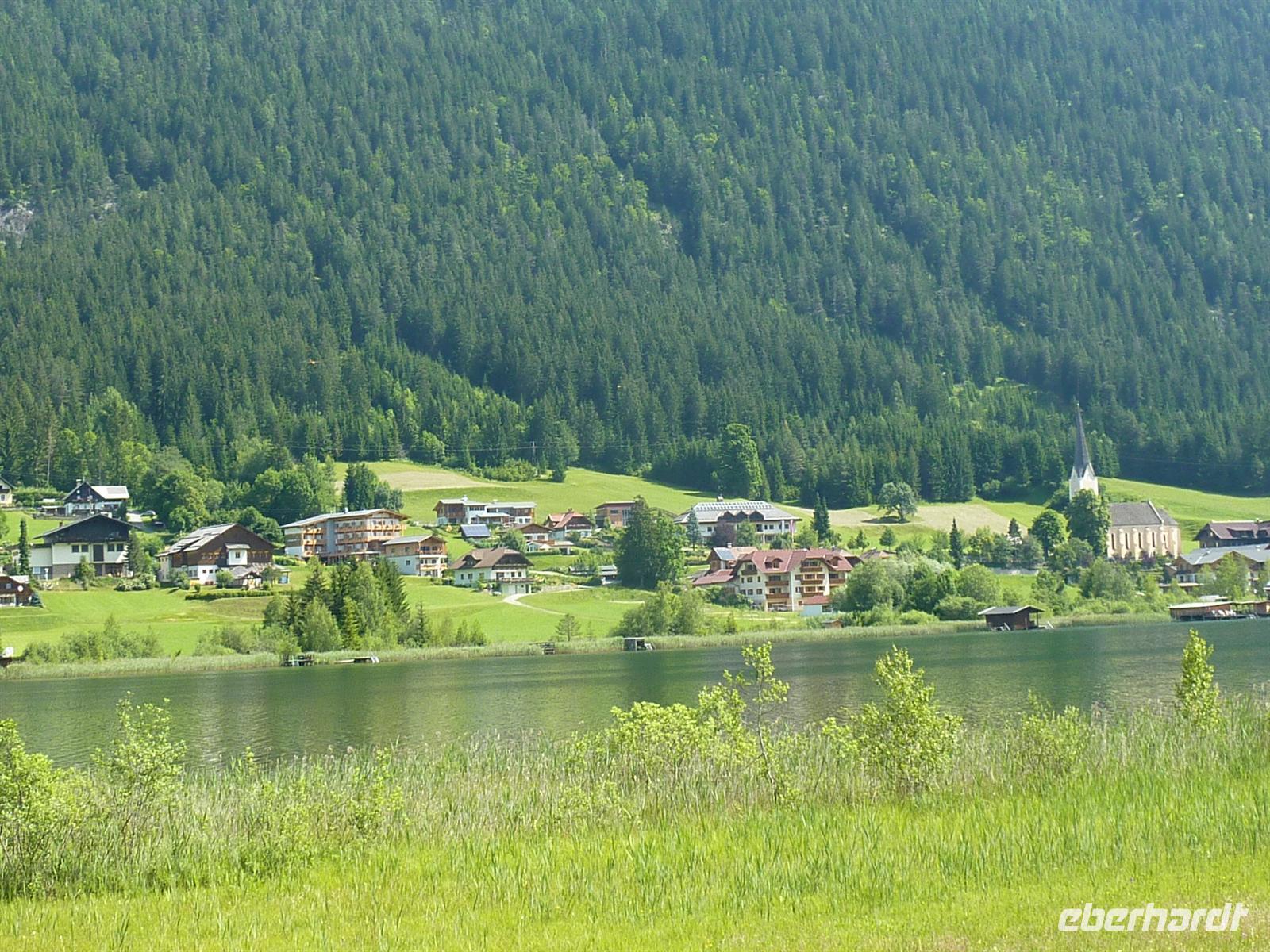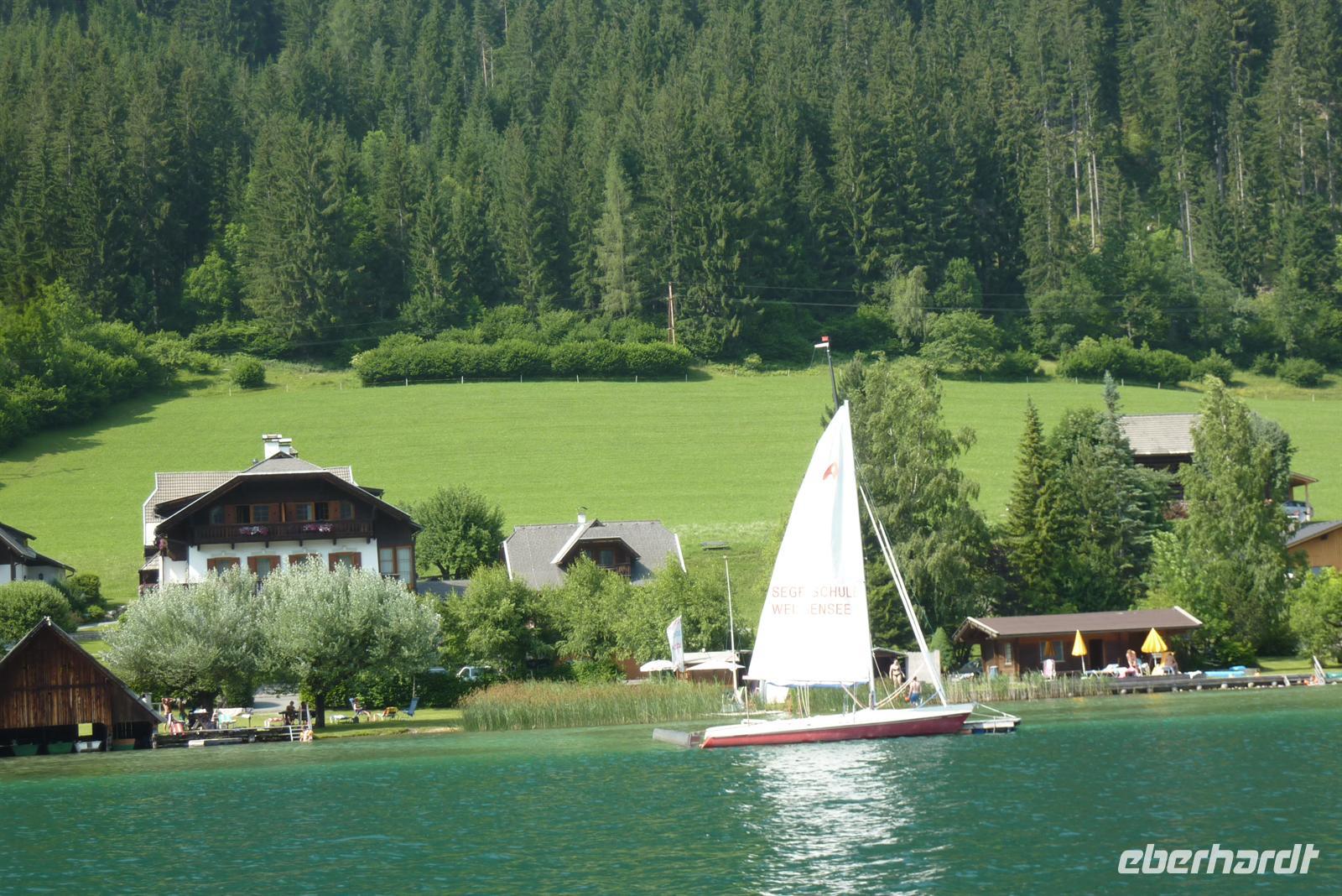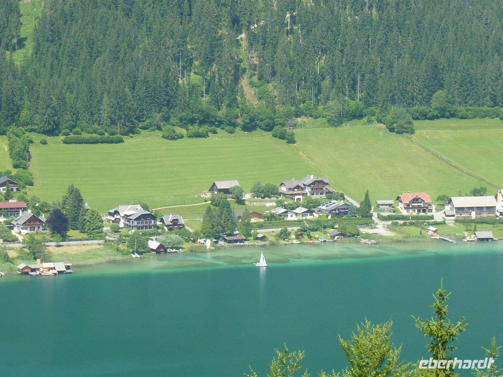 Heute fuhren wir zum Nassfeld. Nach einem kurzer Abstecher zum Presseger See erreichten wir über die Paßstraße das Nassfeld und besuchten dort eine Käserei. Nach den interessanten Ausführungen de Senners verkosteten die wir in der Hütte die verschiedenen Käsesorten. Zurück am Weissensee wartete schon ein Schiff auf uns. Die Sonne lacht und wir besteigen das Schiff für unsere Rundfahrt auf dem Weissensee. In einer Seehöhe von 930 m erstreckt sich der Weissensee im Gebiet der Gailtaler Alpen zwischen dem Drau- und dem Gailtal. Mit einer Länge von 11,6 km, der größten Breite von 960m, der tiefsten Stelle mit 99m und einer Fläche von 6,5 km² ist der Weissensee der viertgrößte Kärntner See. Das günstige Klima unterstützt eine einzigartige und reichhaltige Flora. Zwei Drittel des Seeufers sind vor allem im Ostteil des Sees unverbaut und naturbelassen. Im Jahr 2007 wurde der Weissensee zum Naturpark erklärt. Zu einer Besonderheit zählt, dass es keine Straßenverbindung zwischen dem West- und dem Ostufer und somit zwischen den beiden Naturparkgemeinden gibt. Der Kapitän gab uns Informationen und so erfuhren wir auch wie der See zu seinem Namen kam. Er leitet sich von seinem weißen, hellen Rand ab, der ihn umgibt. Der Kalkuntergrund schimmert in Ufernähe bis an die Oberfläche durch. Der Weissensee wurde auch als einer der ersten Kärntner Seen ringkanalisiert. Seit dem Jahre 1957 besteht ein generelles Motorbootfahrverbot. Über 2000 Sonnenstunden sowie Wassertemperaturen von bis zu 24°C laden zum Baden ein.