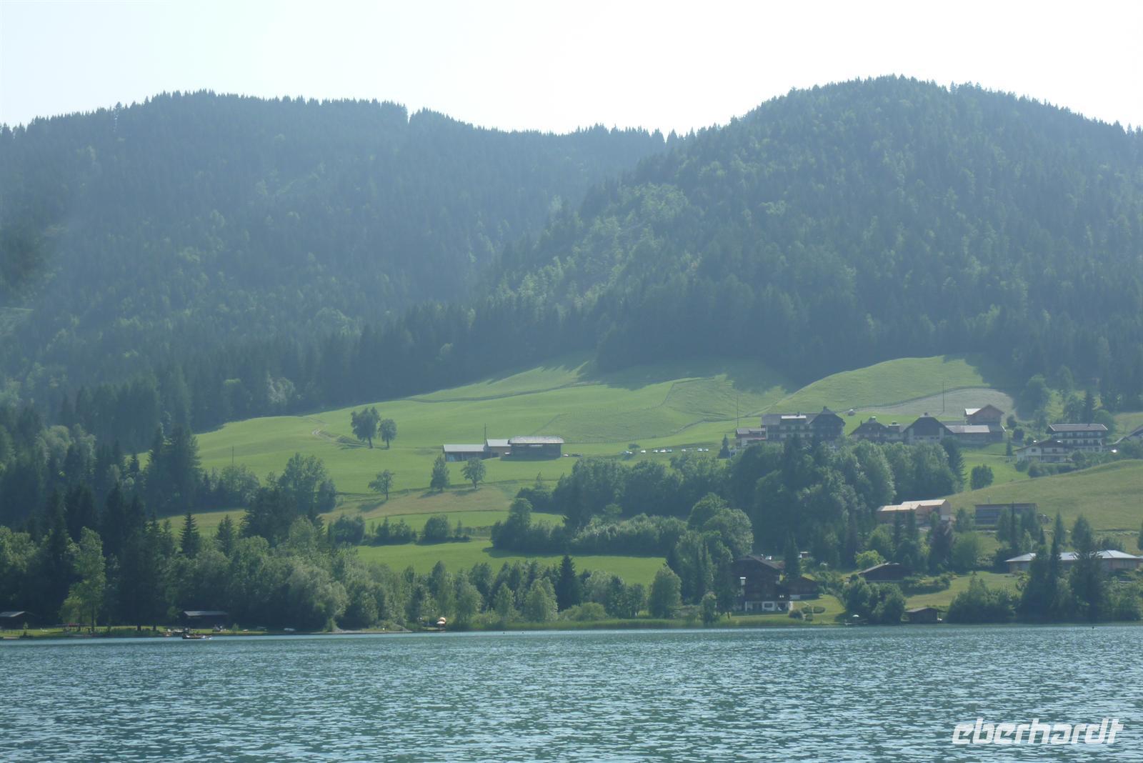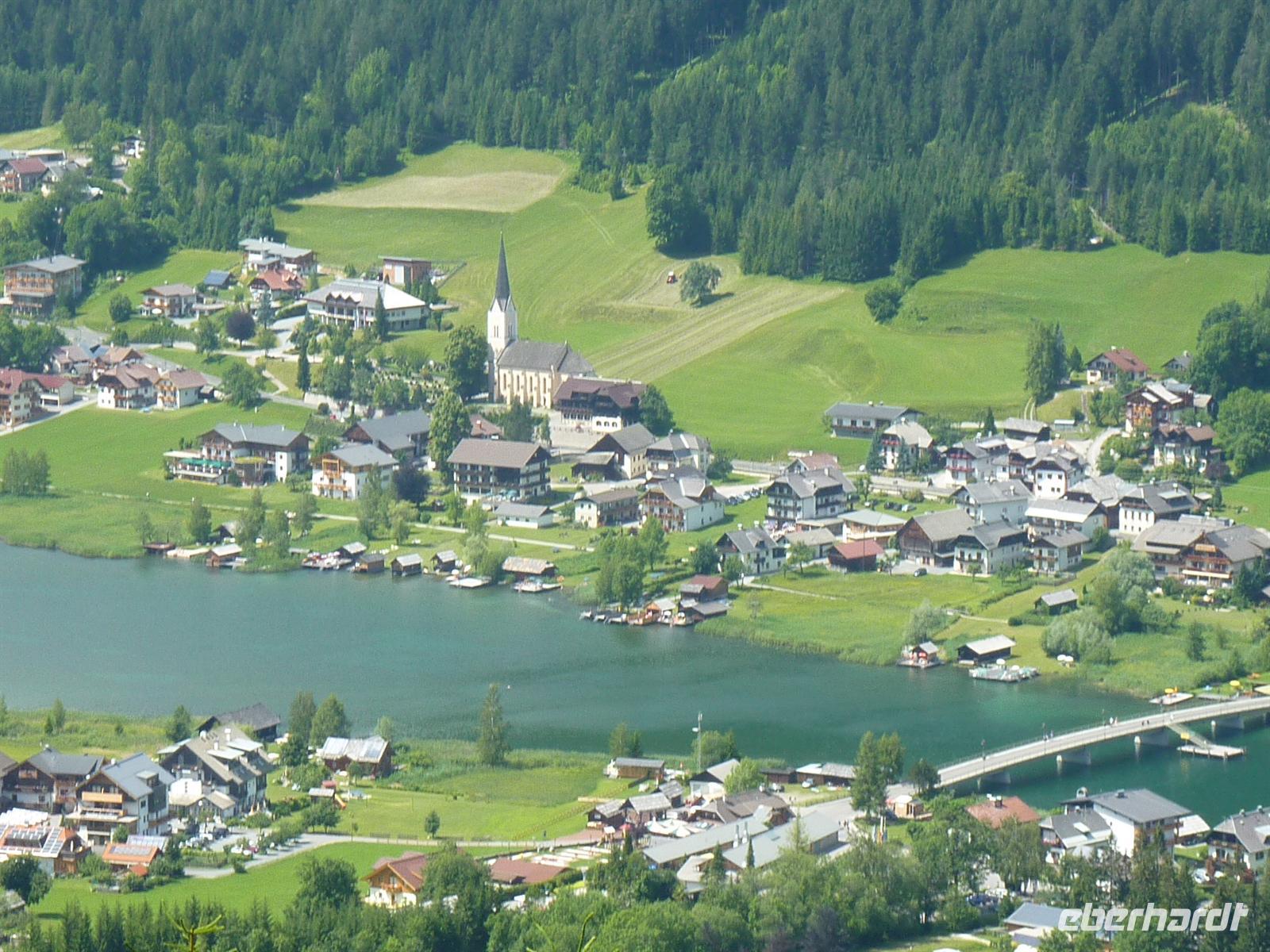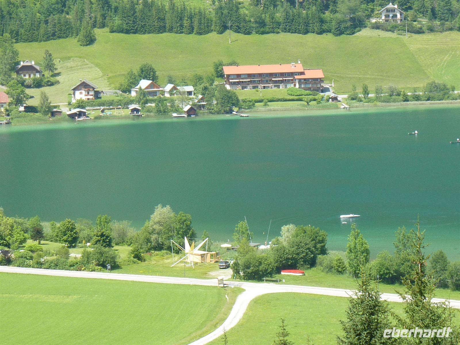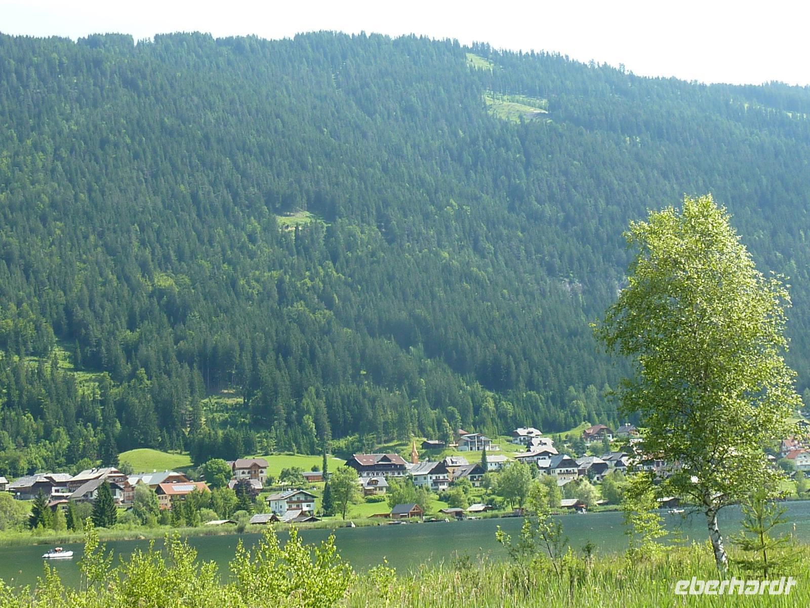 Heute fuhren wir zum Nassfeld. Nach einem kurzer Abstecher zum Presseger See erreichten wir über die Paßstraße das Nassfeld und besuchten dort eine Käserei. Nach den interessanten Ausführungen de Senners verkosteten die wir in der Hütte die verschiedenen Käsesorten. Zurück am Weissensee wartete schon ein Schiff auf uns. Die Sonne lacht und wir besteigen das Schiff für unsere Rundfahrt auf dem Weissensee. In einer Seehöhe von 930 m erstreckt sich der Weissensee im Gebiet der Gailtaler Alpen zwischen dem Drau- und dem Gailtal. Mit einer Länge von 11,6 km, der größten Breite von 960m, der tiefsten Stelle mit 99m und einer Fläche von 6,5 km² ist der Weissensee der viertgrößte Kärntner See. Das günstige Klima unterstützt eine einzigartige und reichhaltige Flora. Zwei Drittel des Seeufers sind vor allem im Ostteil des Sees unverbaut und naturbelassen. Im Jahr 2007 wurde der Weissensee zum Naturpark erklärt. Zu einer Besonderheit zählt, dass es keine Straßenverbindung zwischen dem West- und dem Ostufer und somit zwischen den beiden Naturparkgemeinden gibt. Der Kapitän gab uns Informationen und so erfuhren wir auch wie der See zu seinem Namen kam. Er leitet sich von seinem weißen, hellen Rand ab, der ihn umgibt. Der Kalkuntergrund schimmert in Ufernähe bis an die Oberfläche durch. Der Weissensee wurde auch als einer der ersten Kärntner Seen ringkanalisiert. Seit dem Jahre 1957 besteht ein generelles Motorbootfahrverbot. Über 2000 Sonnenstunden sowie Wassertemperaturen von bis zu 24°C laden zum Baden ein.