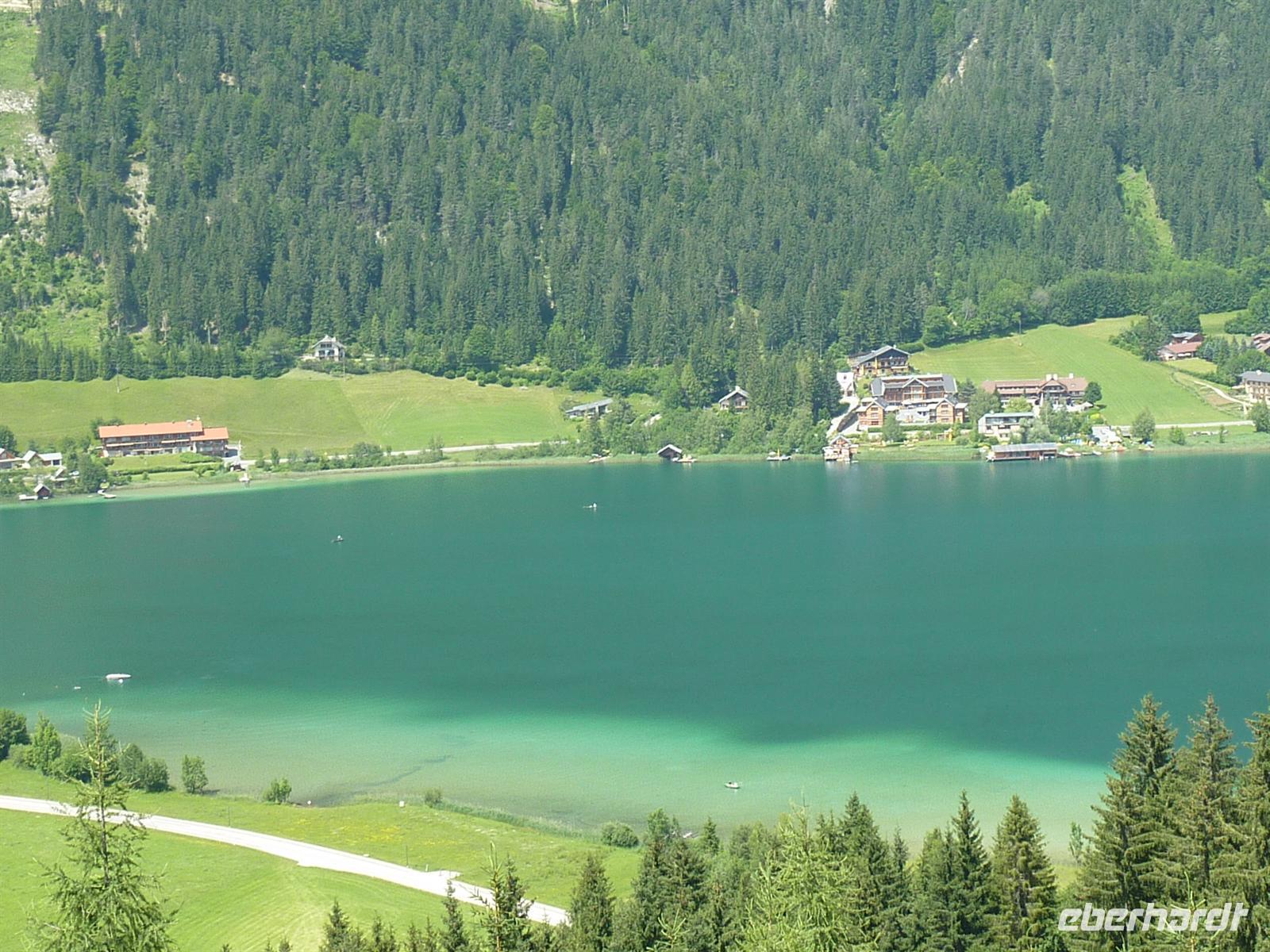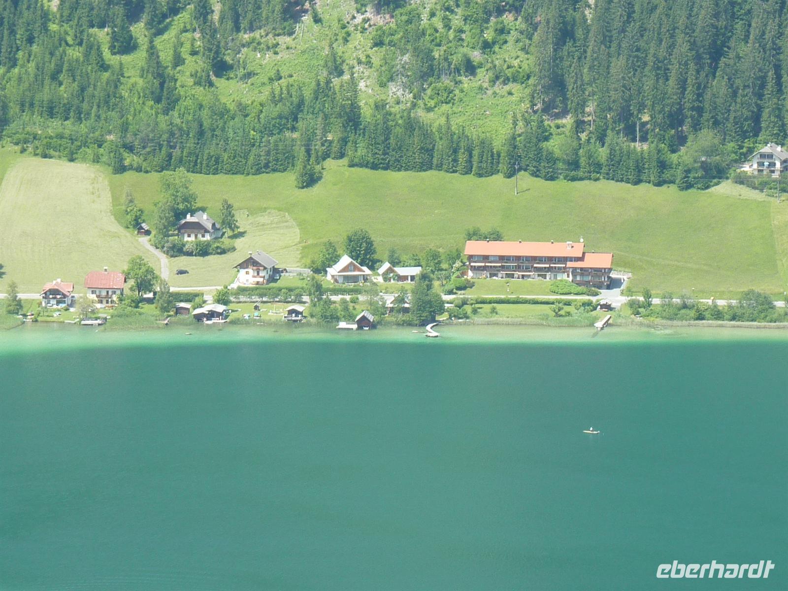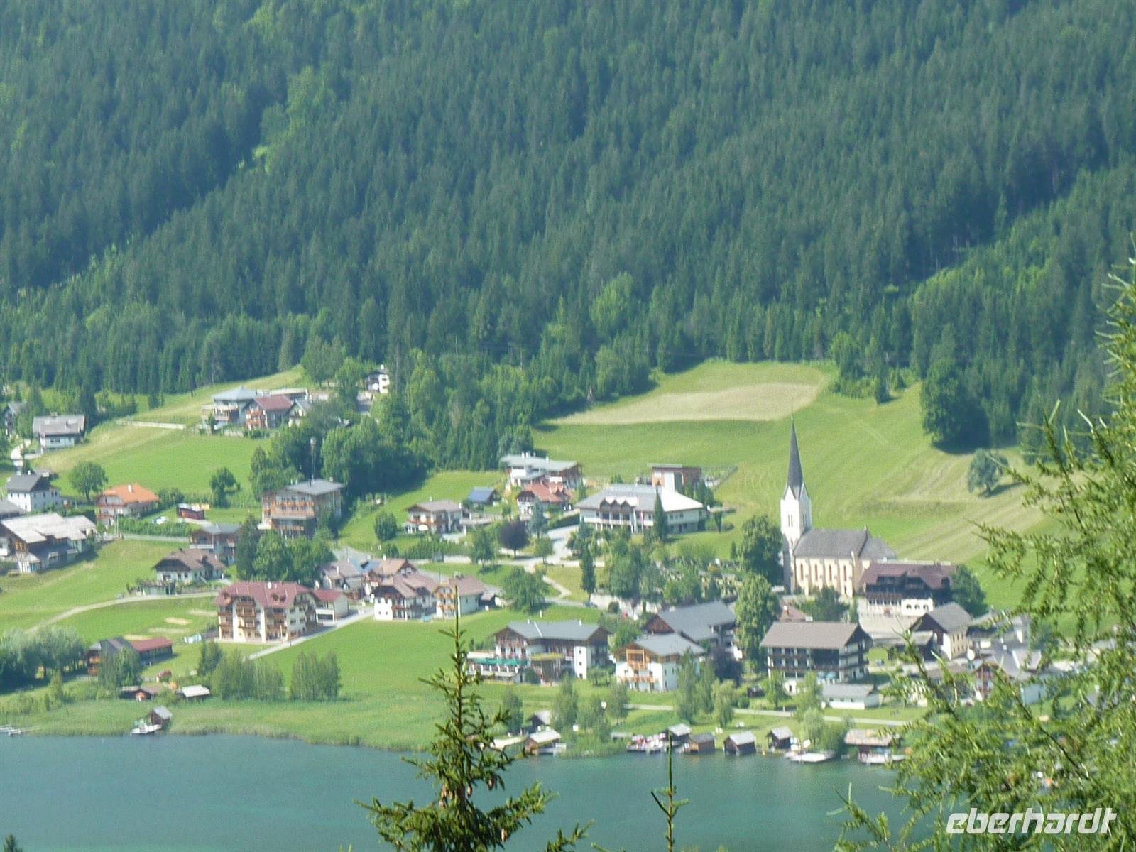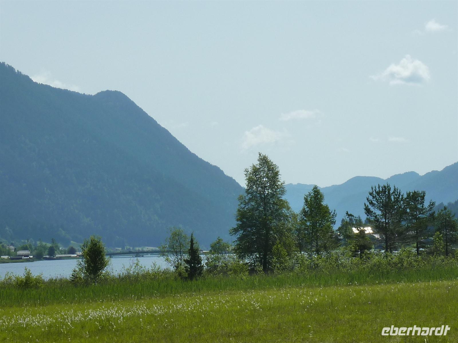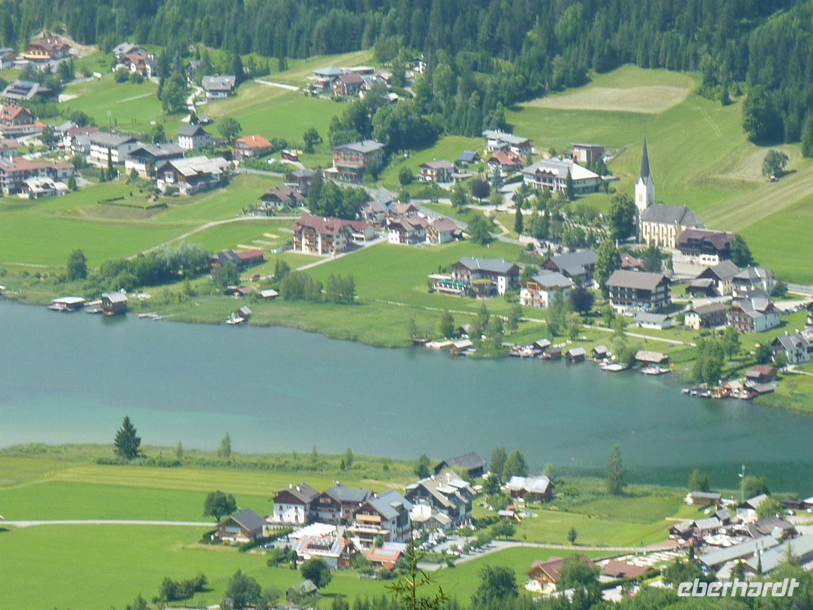 Heute fuhren wir zum Nassfeld. Nach einem kurzer Abstecher zum Presseger See erreichten wir über die Paßstraße das Nassfeld und besuchten dort eine Käserei. Nach den interessanten Ausführungen de Senners verkosteten die wir in der Hütte die verschiedenen Käsesorten. Zurück am Weissensee wartete schon ein Schiff auf uns. Die Sonne lacht und wir besteigen das Schiff für unsere Rundfahrt auf dem Weissensee. In einer Seehöhe von 930 m erstreckt sich der Weissensee im Gebiet der Gailtaler Alpen zwischen dem Drau- und dem Gailtal. Mit einer Länge von 11,6 km, der größten Breite von 960m, der tiefsten Stelle mit 99m und einer Fläche von 6,5 km² ist der Weissensee der viertgrößte Kärntner See. Das günstige Klima unterstützt eine einzigartige und reichhaltige Flora. Zwei Drittel des Seeufers sind vor allem im Ostteil des Sees unverbaut und naturbelassen. Im Jahr 2007 wurde der Weissensee zum Naturpark erklärt. Zu einer Besonderheit zählt, dass es keine Straßenverbindung zwischen dem West- und dem Ostufer und somit zwischen den beiden Naturparkgemeinden gibt. Der Kapitän gab uns Informationen und so erfuhren wir auch wie der See zu seinem Namen kam. Er leitet sich von seinem weißen, hellen Rand ab, der ihn umgibt. Der Kalkuntergrund schimmert in Ufernähe bis an die Oberfläche durch. Der Weissensee wurde auch als einer der ersten Kärntner Seen ringkanalisiert. Seit dem Jahre 1957 besteht ein generelles Motorbootfahrverbot. Über 2000 Sonnenstunden sowie Wassertemperaturen von bis zu 24°C laden zum Baden ein.