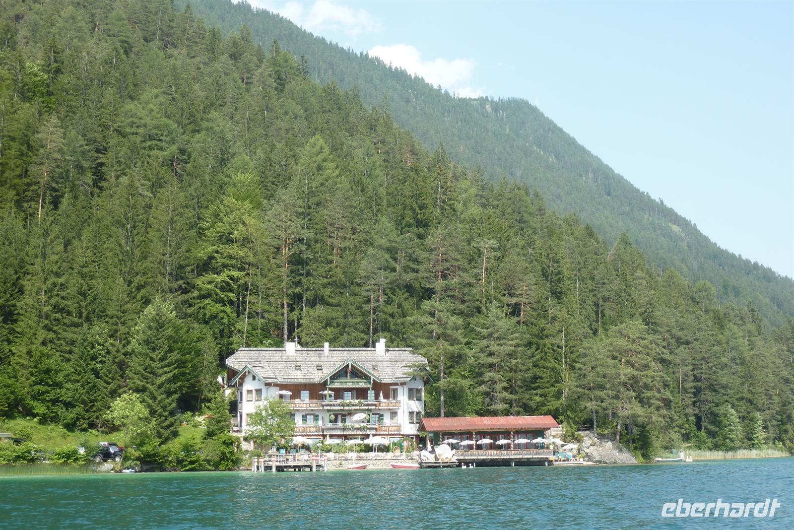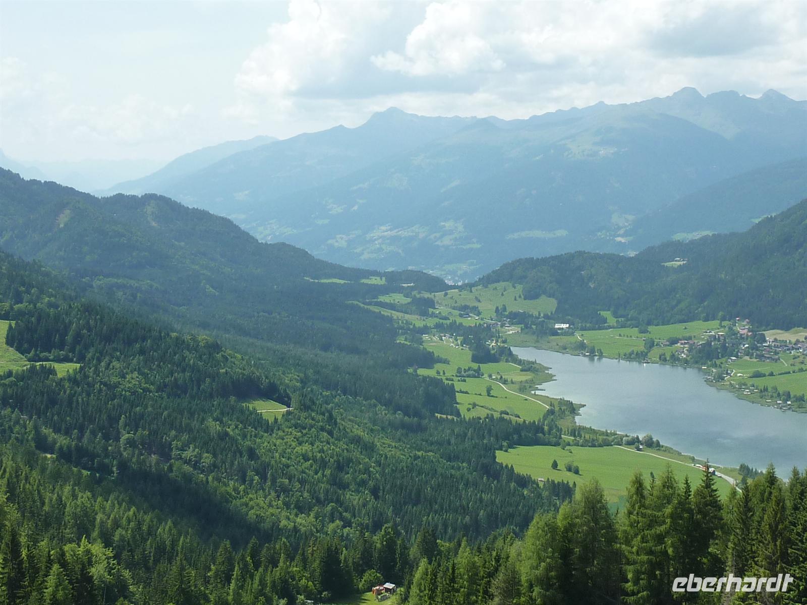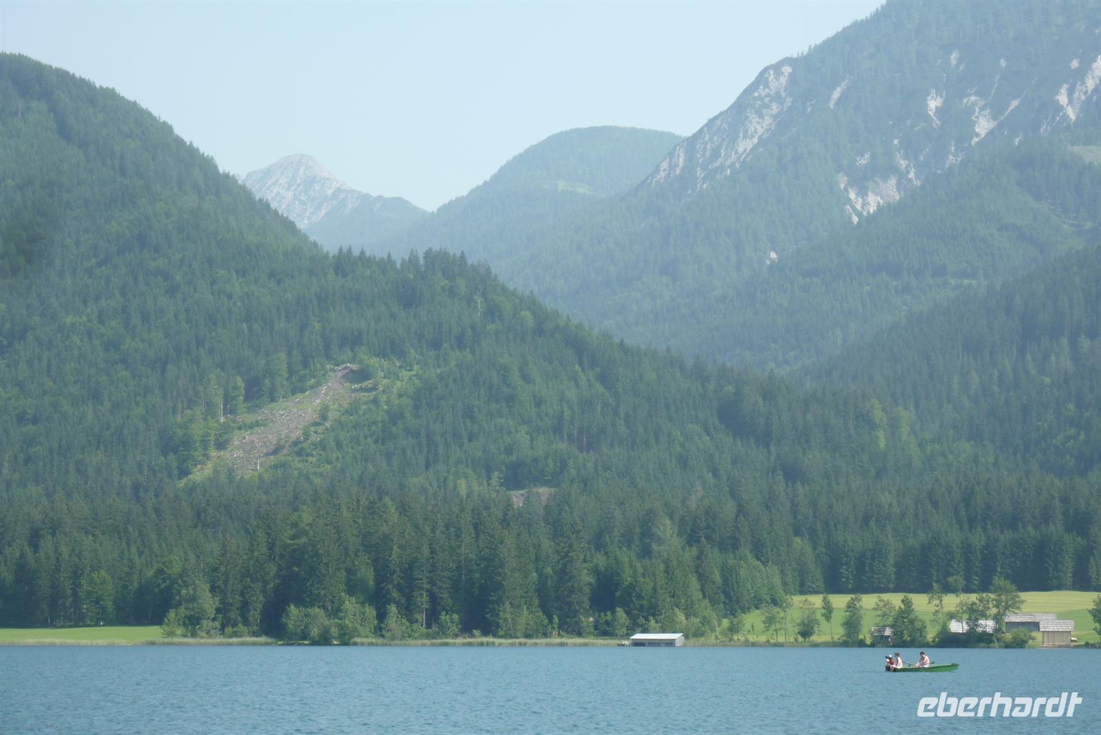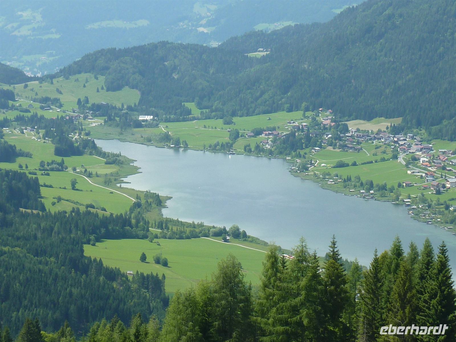 Heute fuhren wir zum Nassfeld. Nach einem kurzer Abstecher zum Presseger See erreichten wir über die Paßstraße das Nassfeld und besuchten dort eine Käserei. Nach den interessanten Ausführungen de Senners verkosteten die wir in der Hütte die verschiedenen Käsesorten. Zurück am Weissensee wartete schon ein Schiff auf uns. Die Sonne lacht und wir besteigen das Schiff für unsere Rundfahrt auf dem Weissensee. In einer Seehöhe von 930 m erstreckt sich der Weissensee im Gebiet der Gailtaler Alpen zwischen dem Drau- und dem Gailtal. Mit einer Länge von 11,6 km, der größten Breite von 960m, der tiefsten Stelle mit 99m und einer Fläche von 6,5 km² ist der Weissensee der viertgrößte Kärntner See. Das günstige Klima unterstützt eine einzigartige und reichhaltige Flora. Zwei Drittel des Seeufers sind vor allem im Ostteil des Sees unverbaut und naturbelassen. Im Jahr 2007 wurde der Weissensee zum Naturpark erklärt. Zu einer Besonderheit zählt, dass es keine Straßenverbindung zwischen dem West- und dem Ostufer und somit zwischen den beiden Naturparkgemeinden gibt. Der Kapitän gab uns Informationen und so erfuhren wir auch wie der See zu seinem Namen kam. Er leitet sich von seinem weißen, hellen Rand ab, der ihn umgibt. Der Kalkuntergrund schimmert in Ufernähe bis an die Oberfläche durch. Der Weissensee wurde auch als einer der ersten Kärntner Seen ringkanalisiert. Seit dem Jahre 1957 besteht ein generelles Motorbootfahrverbot. Über 2000 Sonnenstunden sowie Wassertemperaturen von bis zu 24°C laden zum Baden ein.