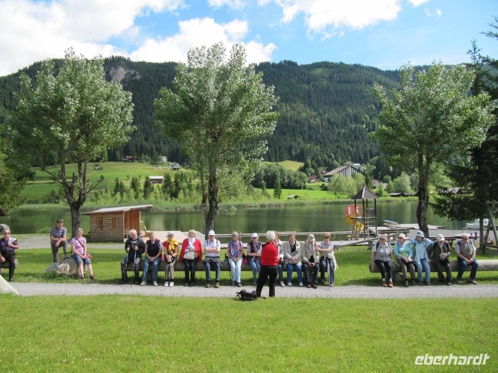 Heute entdeckten wir mit Oma Friedel den Weissensee. Gemeinsam spazierten wir entlang des Sees und Oma Friedel erklärte uns einige Kräuter und ihre Anwendung. Besonders begeistert waren wir von den schönen blühenden Alpenwiesen. Anschließend stiegen wir in einen Kleinbus und fuhren auf die Naggler-Alm. Wir unternahmen noch einen Spaziergang um die Alm. Es erwartet uns ein herrlicher Rundblick auf die umliegende Bergwelt. In der Naggler-Alm erwartet uns schon Heinz der uns während unserer leckeren Brett'l Jause musikalisch unterhielt. Wir hatten sehr viel Spaß und gut gelaunt wanderten wir durch den Wald zurück ins Tal. Am Nachmittag nutzten einige Gäste die Zeit zum Baden im Weissensee. Nur drei Gehminuten vom Hotel entfernt befindet sich der hauseigene Badestrand.