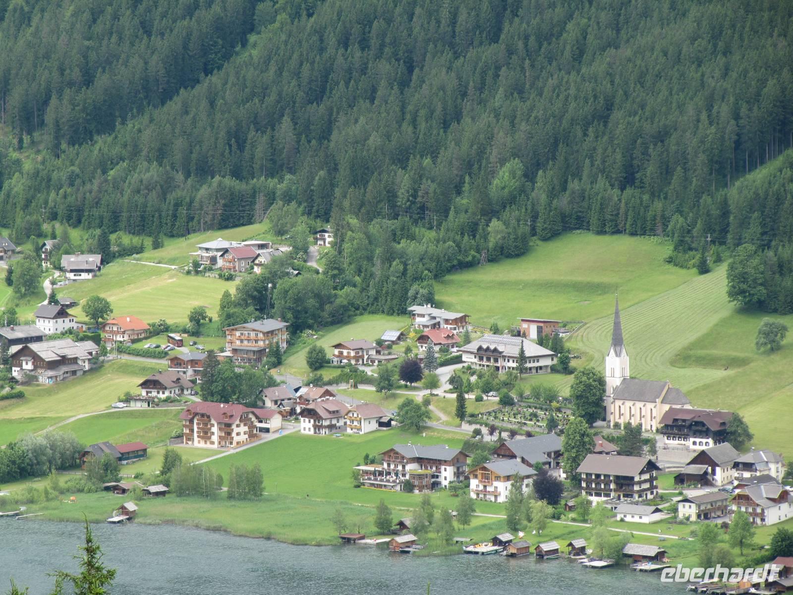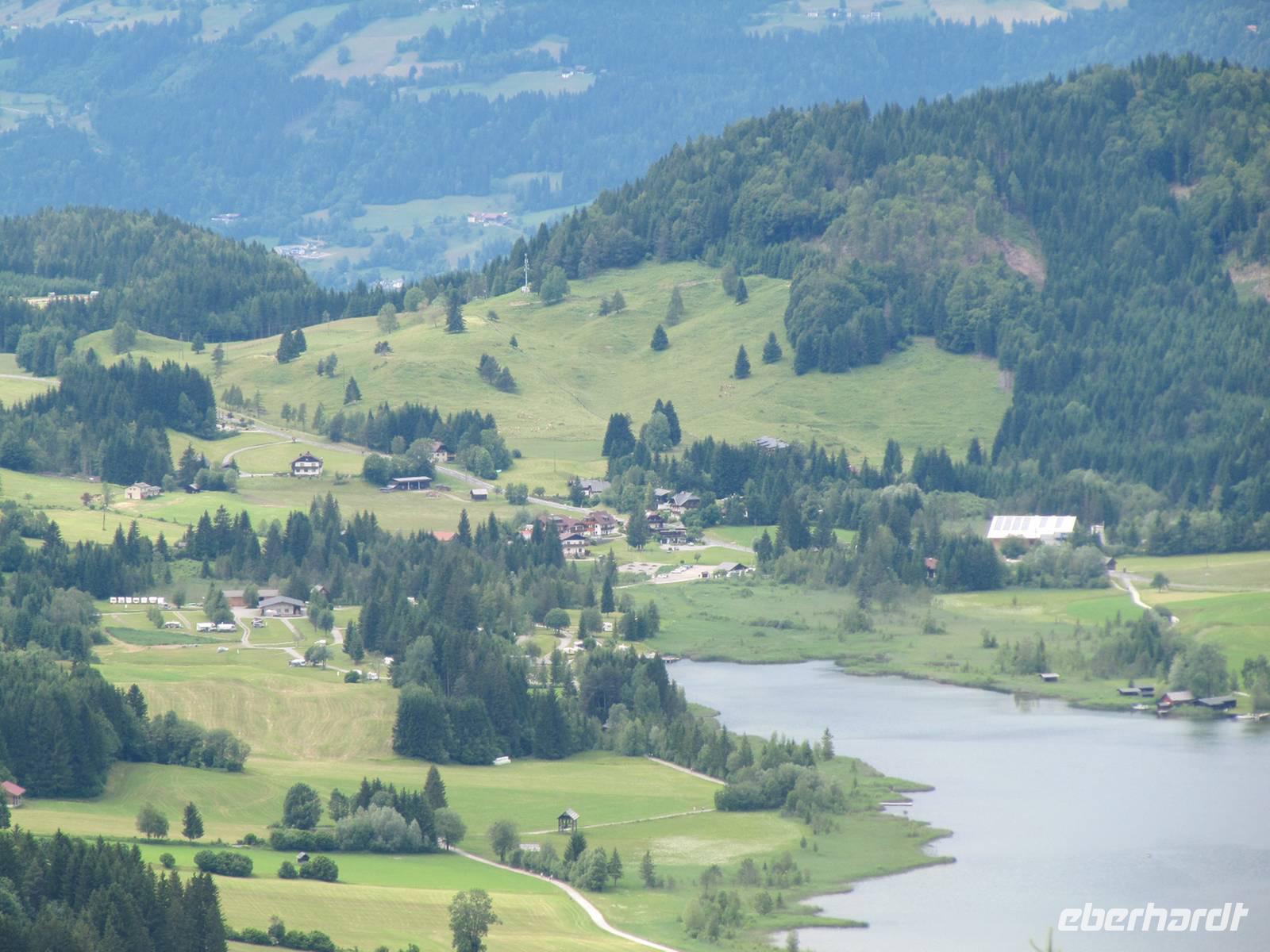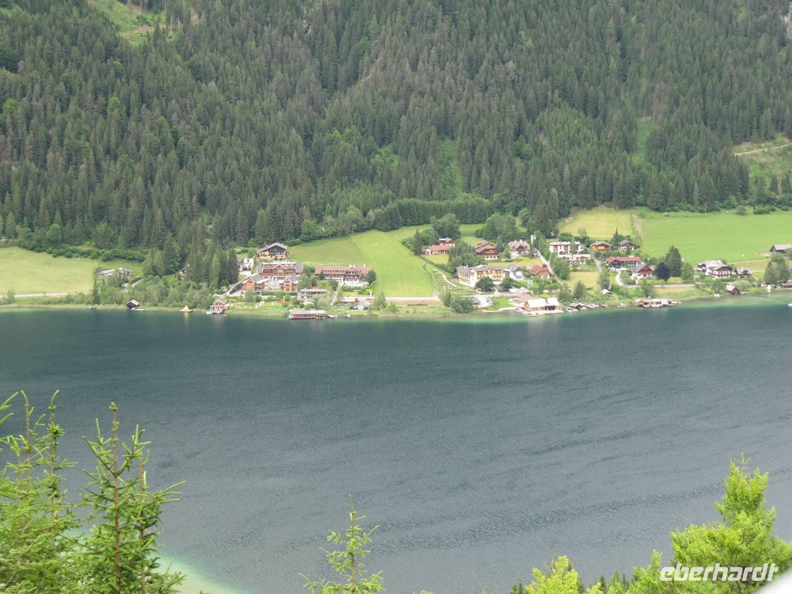 Heute fuhren wir zum Nassfeld. Nach einem kurzer Abstecher zum Presseger See erreichten wir über die Paßstraße das Nassfeld und besuchten dort eine Käserei. Nach den interessanten Ausführungen de Senners verkosteten die wir in der Hütte die verschiedenen Käsesorten. Zurück am Weissensee wartete schon ein Schiff auf uns. Die Sonne lacht und wir besteigen das Schiff für unsere Rundfahrt auf dem Weissensee. In einer Seehöhe von 930 m erstreckt sich der Weissensee im Gebiet der Gailtaler Alpen zwischen dem Drau- und dem Gailtal. Mit einer Länge von 11,6 km, der größten Breite von 960m, der tiefsten Stelle mit 99m und einer Fläche von 6,5 km² ist der Weissensee der viertgrößte Kärntner See. Das günstige Klima unterstützt eine einzigartige und reichhaltige Flora. Zwei Drittel des Seeufers sind vor allem im Ostteil des Sees unverbaut und naturbelassen. Im Jahr 2007 wurde der Weissensee zum Naturpark erklärt. Zu einer Besonderheit zählt, dass es keine Straßenverbindung zwischen dem West- und dem Ostufer und somit zwischen den beiden Naturparkgemeinden gibt. Der Kapitän gab uns Informationen und so erfuhren wir auch wie der See zu seinem Namen kam. Er leitet sich von seinem weißen, hellen Rand ab, der ihn umgibt. Der Kalkuntergrund schimmert in Ufernähe bis an die Oberfläche durch. Der Weissensee wurde auch als einer der ersten Kärntner Seen ringkanalisiert. Seit dem Jahre 1957 besteht ein generelles Motorbootfahrverbot. Über 2000 Sonnenstunden sowie Wassertemperaturen von bis zu 24°C laden zum Baden ein.