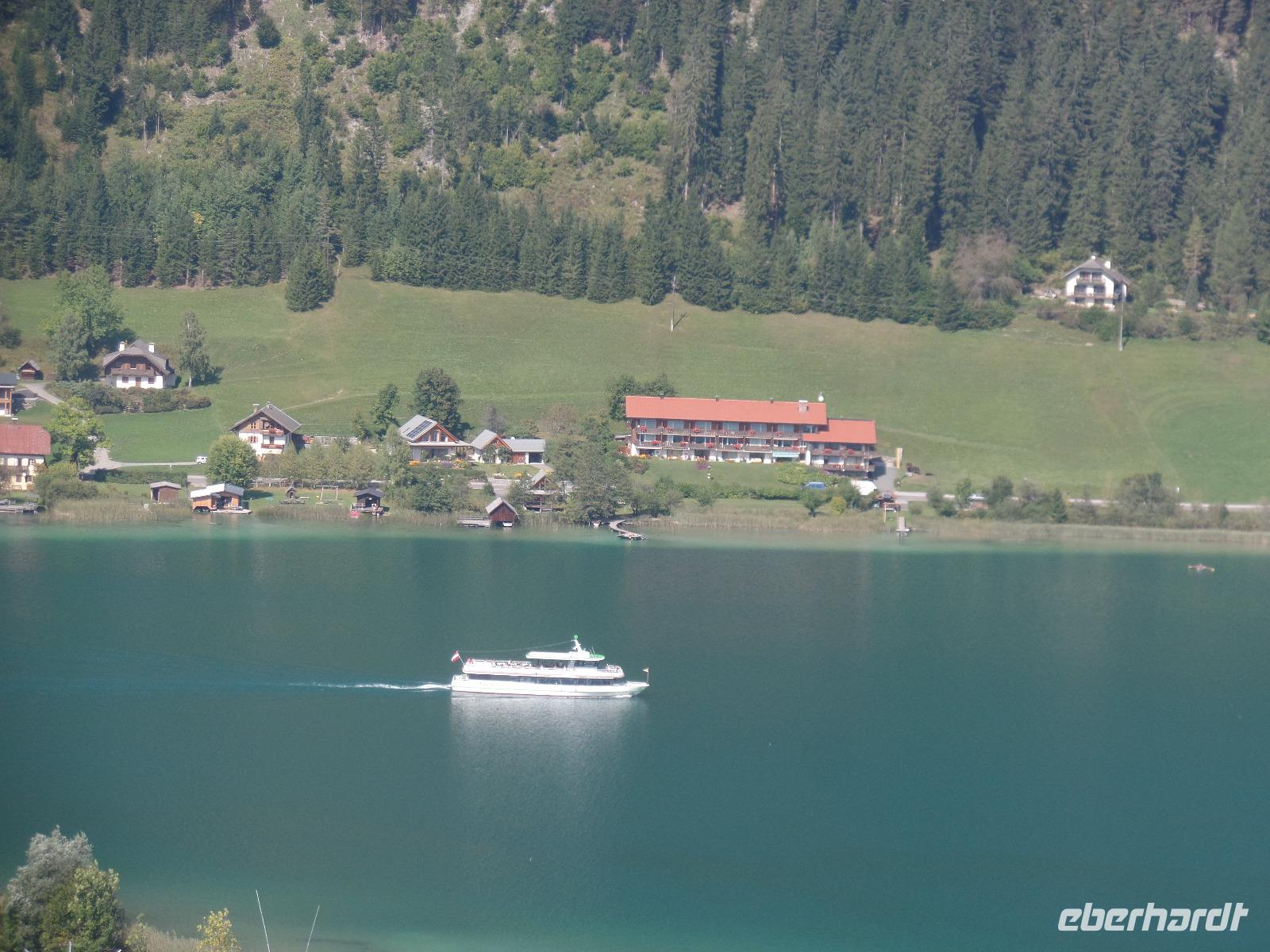 Am Morgen spazierten wir mit Torsten um den Weissensee und lauschten seinen Ausführungen. Auch heute hatten wir wieder Glück und die Sonne lachte. Mit der Weissensee Seilbahn fuhren wir hinauf mit einem schönen Blick über den See und spazierten zur Naggler-Alm. Die Plätze waren für uns reserviert und so konnten wir draußen das schöne Wetter und eine Jause oder einen Kaiserschmarn genießen. Am Nachmittag hieß es „Leinen los". Die meisten Touristen waren schon weg und so hatten alle Platz auf dem Sonnendeck. Während der Rundfahrt gab uns der Kapitän Informationen über die Artenvielfalt der Fische im See und die Umgebung. Dabei erfuhren wir auch wie der See zu seinem Namen kam. Durch die weißen, hellen Ränder entlang des Sees der ihn umgibt. Im Winter friert der See zu und wird zu einer einzigen Eisfläche.