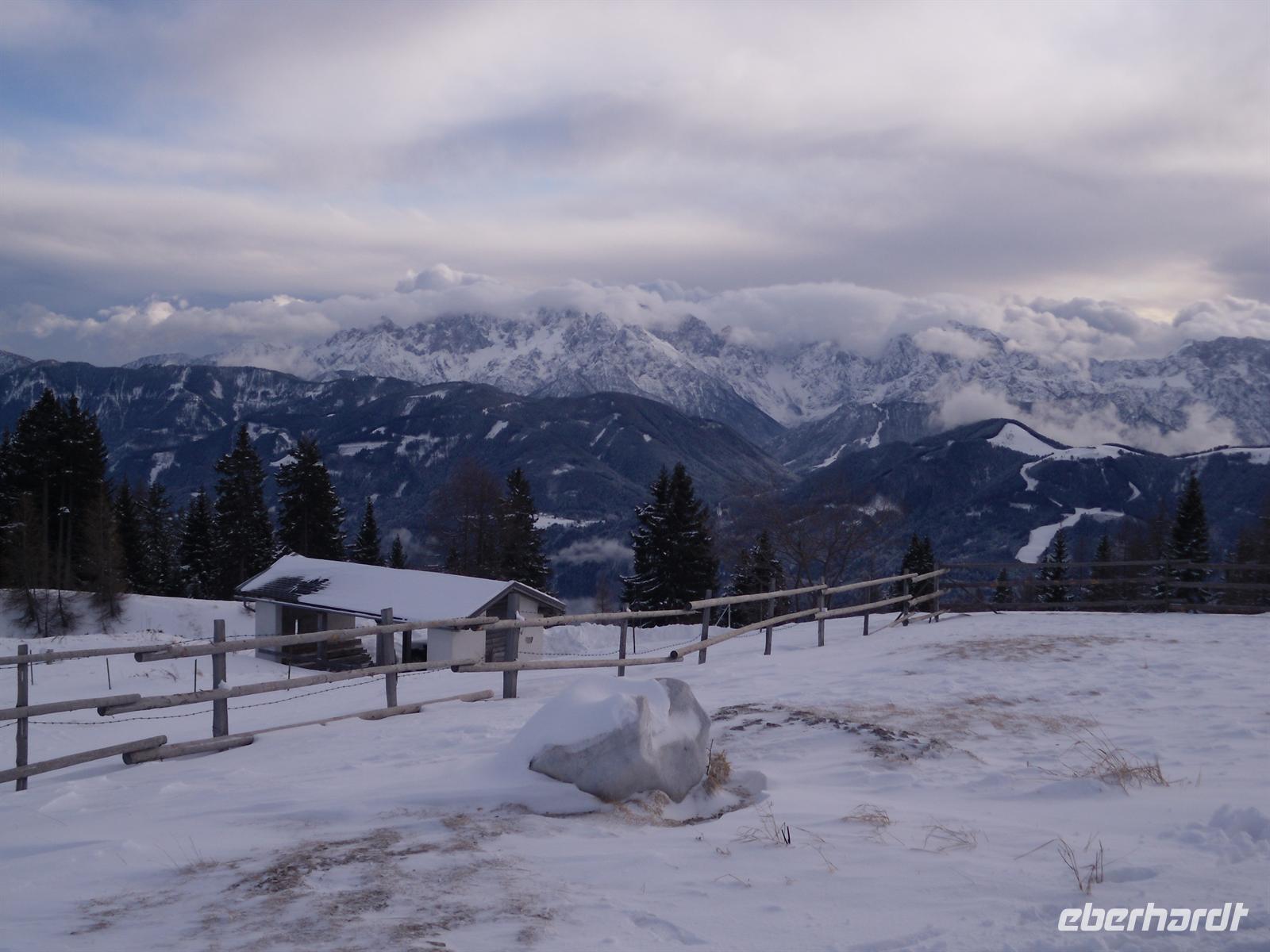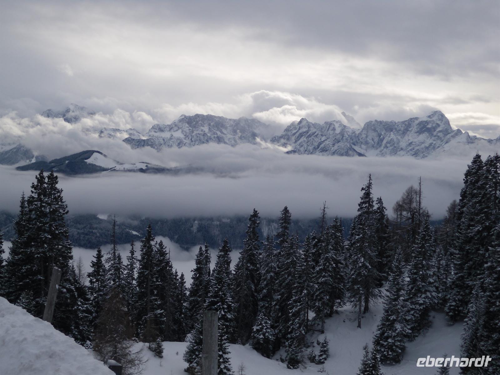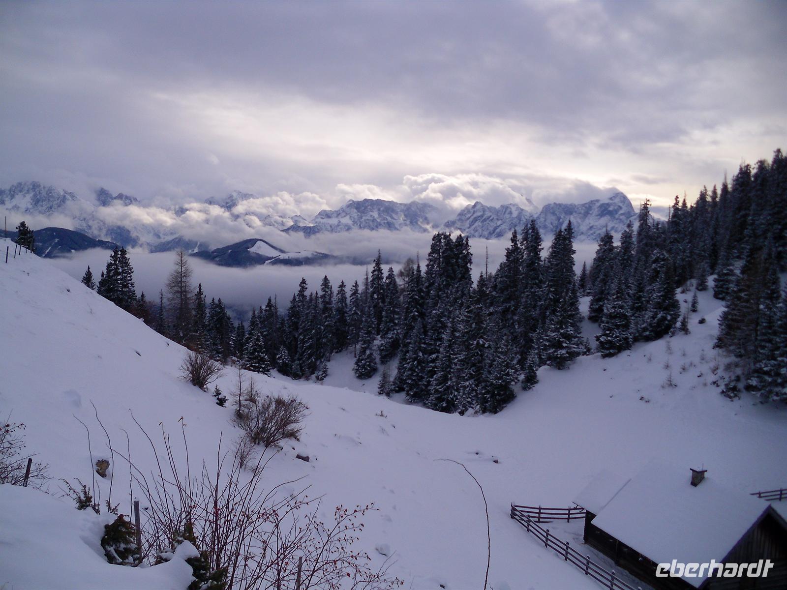 Nach einem sehr guten Frühstück geht heute Morgen unsere Fahrt nach Tröpolach. Wir parken unseren Bus in Nähe der Liftstation ab und zu Fuß gehen wir bis zur Liftstation der Millenniumbahn. Ingrid hat für alle Karten organisiert und nun geht es mit etwas Einsatz der Ellenbogen hinein in die umlaufende Bahn. Wir fahren zunächst bis hinauf zur Endstation auf 1919 m ü. d. M. Ja und hier werden wir vom Flockenwirbel in weiß empfangen ? es schneit und das freut alle, Schnee ist auch hier Mangelware geworden. Nach Schauen, Fotografieren und klettern zum Gipfelkreuz geht es für uns zur Tressdorfer Alm, hier hat das Reisebüro Eberhardt Plätze für alle reservieren lassen. Bei Jagertee, Schnitzel mit Pommes und Suppe und Salat genießen wir unsere Mittagseinkehr. Gestärkt verlassen wir die Höhe und mit der Millenniumbahn fahren wir hinab zur Talstation und in kurzer Zeit sind wir zurück am Bus. Hier wartet schon Peter, unser Buschauffeur, auf uns mit Kaffee, Glühwein und Lebkuchen. Angekommen in Weißensee gibt es doch