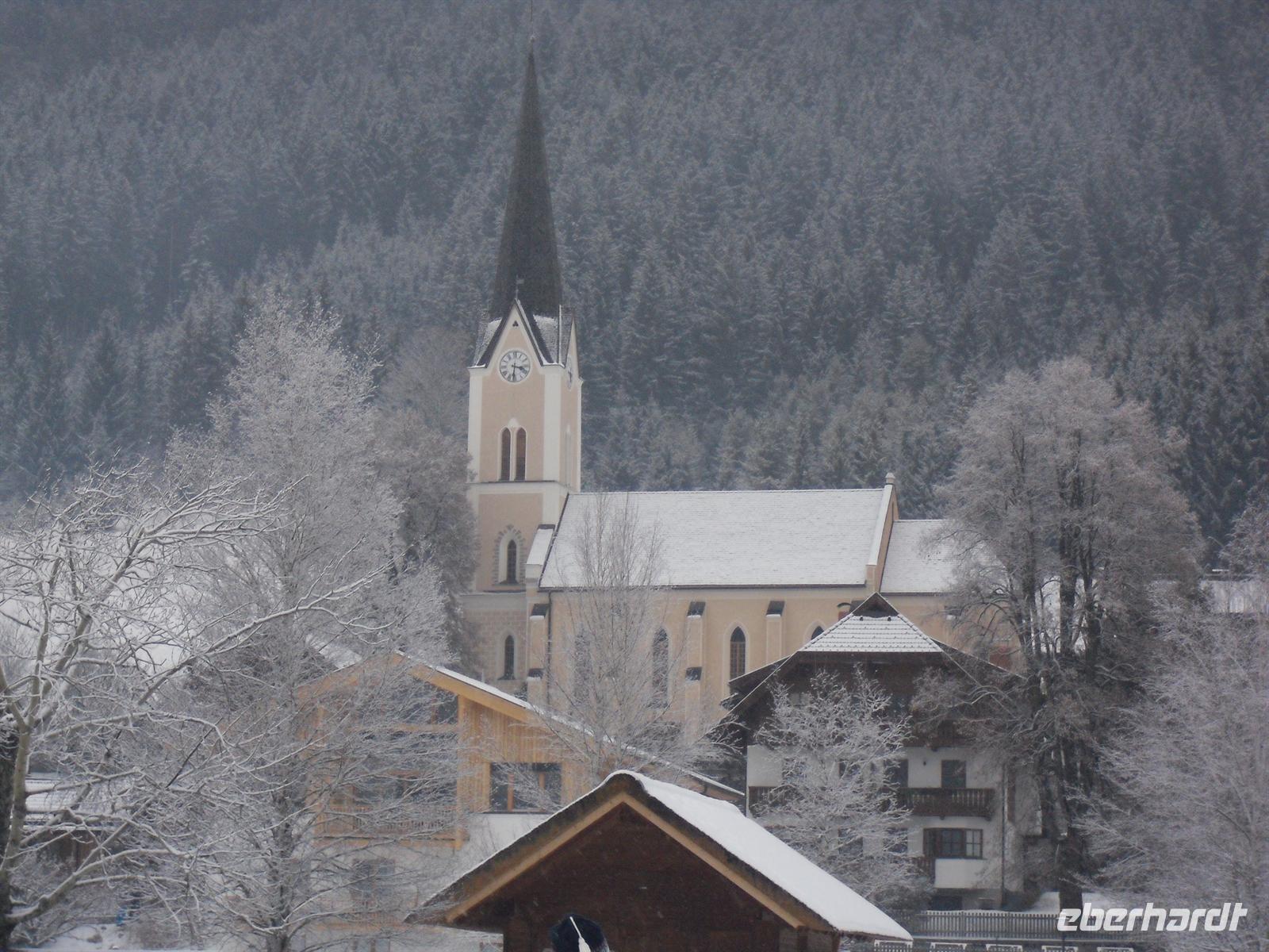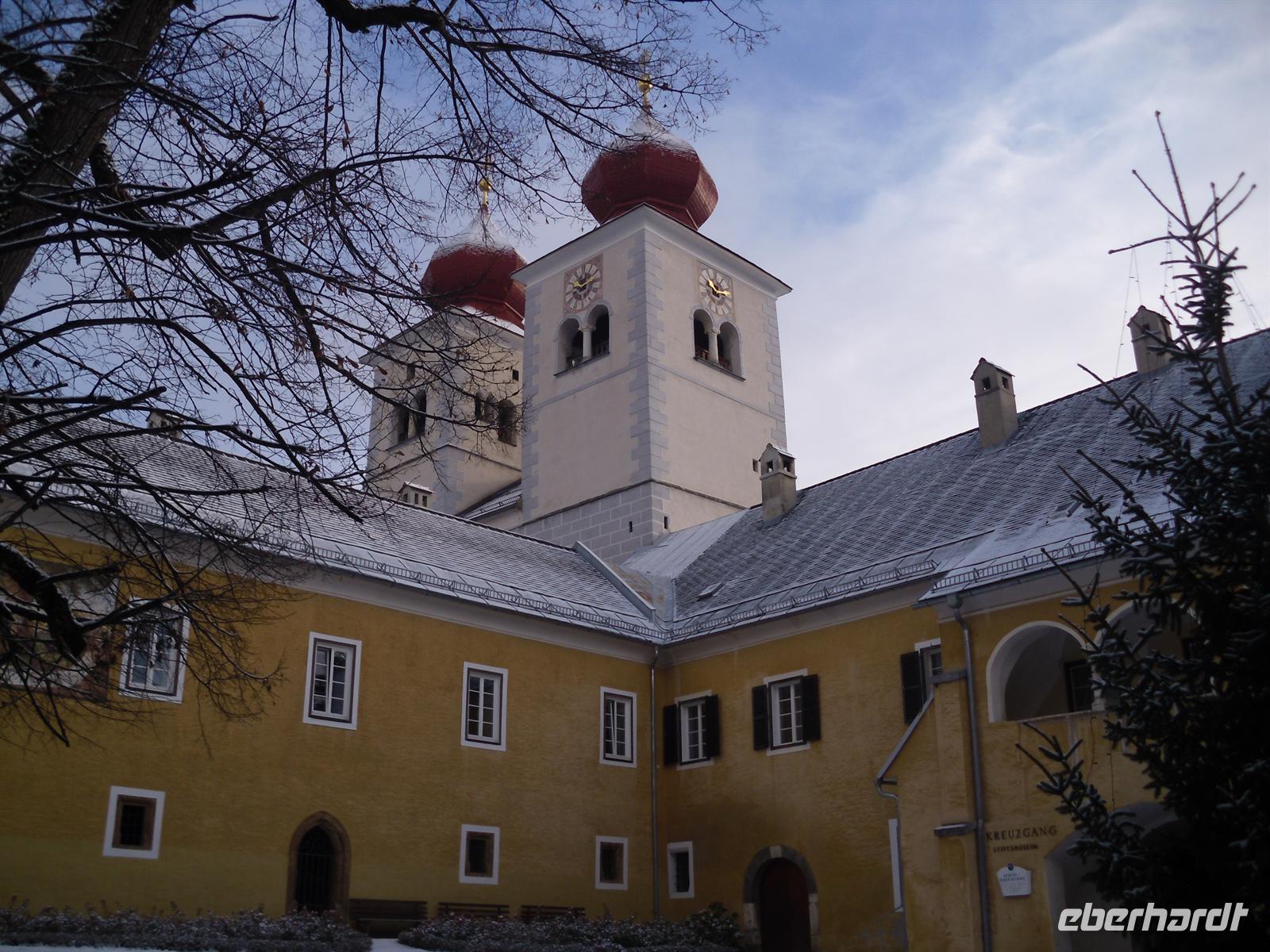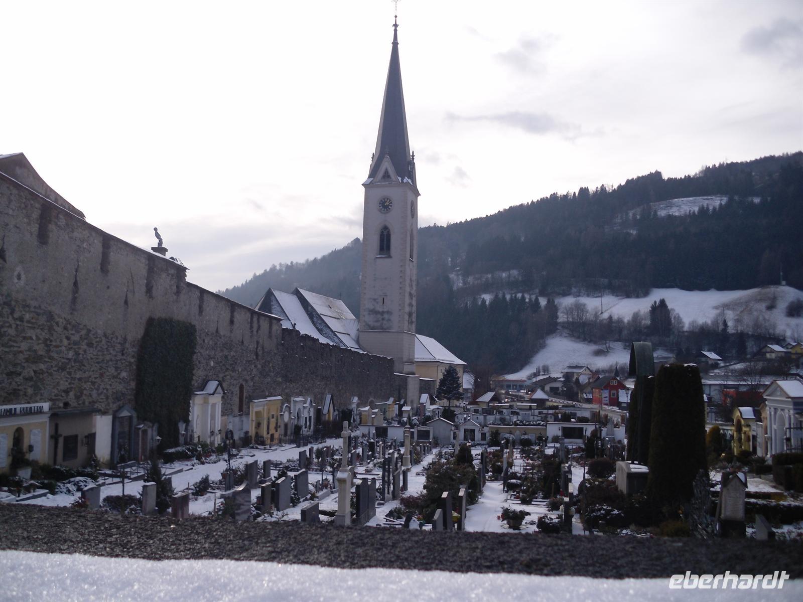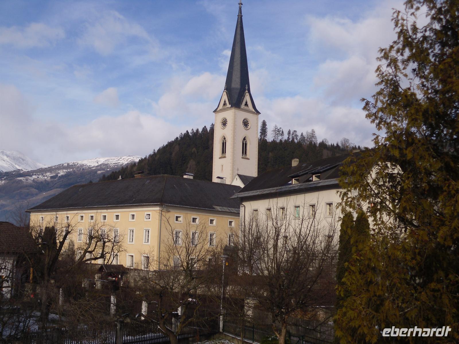 Außerhalb von Gmünd lässt Peter Möbius, unser Buschauffeur, uns alle eine Kirche anschauen, die geteilt durch eine Straße ist, es wird eifrig fotografiert. Zum Katschberg fahren wir weiter durchs Liesertal, hier ist die Grenze zwischen Salzburger Land und Kärnten, ganz genau im 5439 m langen Katschbergtunnel. Am Katschberg mit 1645 Meter Höhe sind die Liftanlagen in Betrieb und viele Skifahrer wirbeln die Pisten hinunter, für uns alle ein sportlicher Anblick.