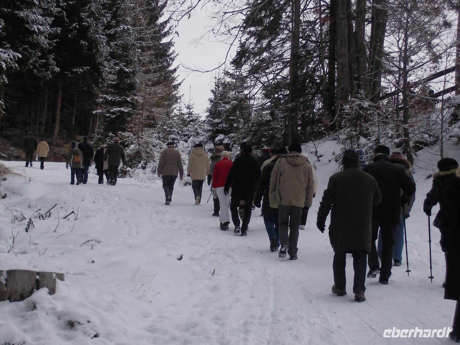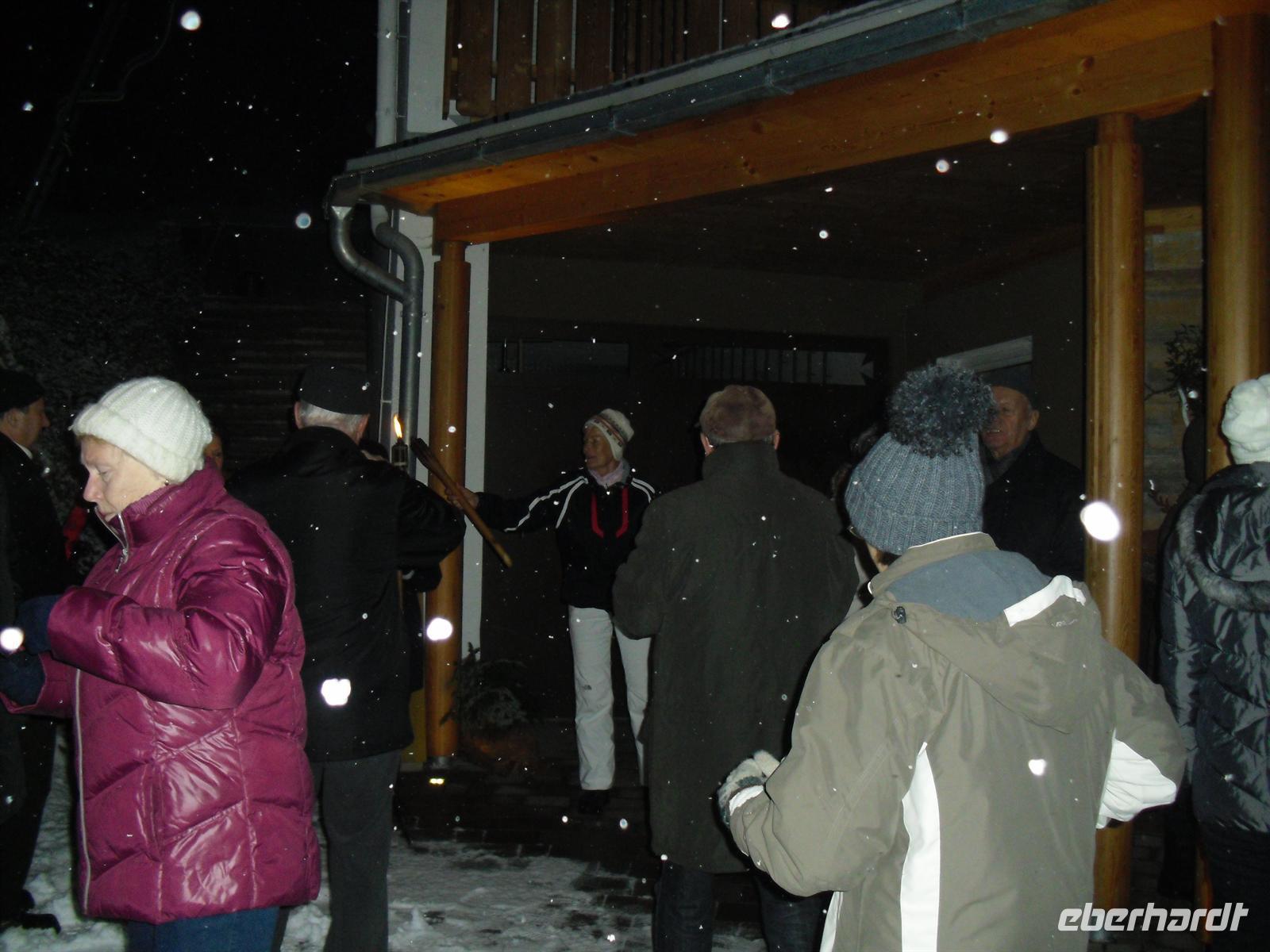 einige von uns, die zu einem Spaziergang auf dem zugefrorenen See losmarschieren. Gegen 17 Uhr treffen wir uns mit Oma Friedel im Hotel und bei leichtem Schneefall starten wir mit unseren Fackeln zur Wanderung um und über den See. Wir bekommen viel Informationen von ihr, z. B. das der See erst seit 3 Tagen begehen werden kann, das im Bereich unseres Hotels der See nur ca. 6 m tief ist und weiter südlich ist er 110 m tief. Wir sind begeistert vom zugefrorenen Weißensee und beim nächsten Stopp wird mit Oma Friedel gesungen, dabei können wir ihr glatt noch was von unserem Liedgut erlernen. Wir kehren begeistert von der Wanderung zurück und Peter, der Hotelchef, empfängt uns am Hotel mit einem leckeren Glühwein. Mit Gesang und guter Laune verabschieden wir uns und treffen am Abend wieder zum vorzüglichen Abendessen mit einem herrlichen Nachtisch ein.