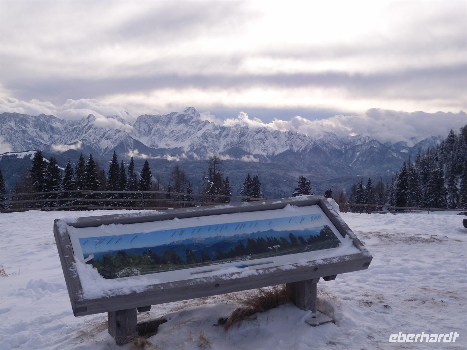 Am Morgen starten wir mit dem Bus in Richtung Spittal und weiter entlang des Millstätter Sees bis nach Millstatt, wo wir für 30 min anhalten, am See schauen und auch einen Blick in die Stiftskirche werfen können. Am See entlang fahren wir weiter bis nach Bad Kleinkirchhein, hier ist ein großes Skigebiet auf über 1000m ü. d. M. Am Bauernmarkt wird Knackwurst, Käse und auch ein gut gebrannter Schnaps probiert. In der nahen Tourist Info decken wir uns mit Prospektmaterial der Umgebung ein. Die Seenrundfahrt geht weiter in Richtung Süd auf der Barockstraße vorbei an Feld am See, dem Brennsee und dem Afritzer See. In Villach kommen wir ganz in die Nähe des Ossiacher Sees, er steht aber nicht auf unserem Programm. Leichter Schneefall und schlechte Sicht stimmen uns etwas traurig, wollen wir doch noch die Aussicht vom Dobratsch in die Bergwelt genießen. Wir fahren nun auf der Villacher Alpstrasse bis hinauf zum Parkplatz 11. Hier ist unsere Mittagseinkehr im Rosstrappestübele geplant. Hinter jeder Kehre wird das Wetter besser und uns scheint die Sonne und ein fantastisches Bergpanorama eröffnet sich uns. Gut gelaunt kehren wir ein, gestärkt geht es noch den Hügel hinauf, wo wir von der Reiseleitung mit