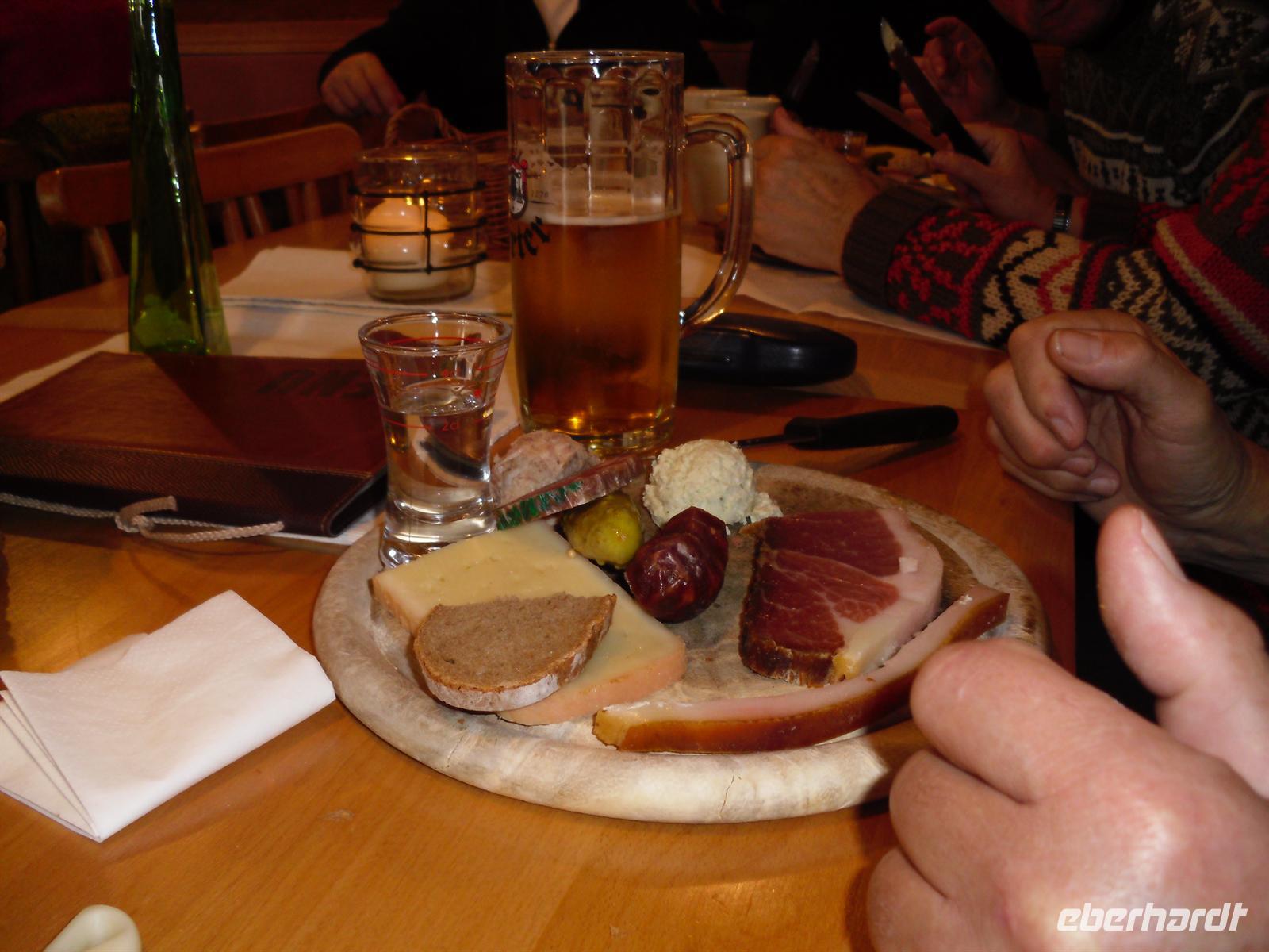 Pünktlich fahren unsere Schlitten mit ihren vorgespannten Rössern am Parkplatz ein und los gings mit dem Einstieg, eingehüllt in Decken und gut gelaunt starten wir am späten Nachmittag unsere Pferdeschlittenfahrt durchs Gonntal zur Pritzhütte. Unterwegs gibt es einen kräftigen Schluck Obstler und dazu erklingen von uns einige Lieder. In der Hütte erwartet uns in uriger Atmosphäre eine tolle Brettljause, die wir in einer einzigartigen Räumlichkeit einnehmen. Alphorn Bläser und 2 Musiker, die schon vom vielen Gesang der letzten Tage heiser sind, verbreiten Hochstimmung. Gute Getränke, typische Hüttenmusik und wohlige Wärme lassen uns den Aufbruch schwer fallen. In der mittlerweile einsetzenden Dunkelheit fahren wir in den Pferdeschlitten mit Tempo und guter Laune zum Parkplatz zurück, hier erwartet uns schon Peter zur Rückfahrt. Spät am Abend bekommen wir im Hotel noch Gulaschsuppe und Nachtisch serviert. Danach heißt es für uns Koffer packen, denn der nächste Tag heißt Abschied vom Weißensee nehmen.