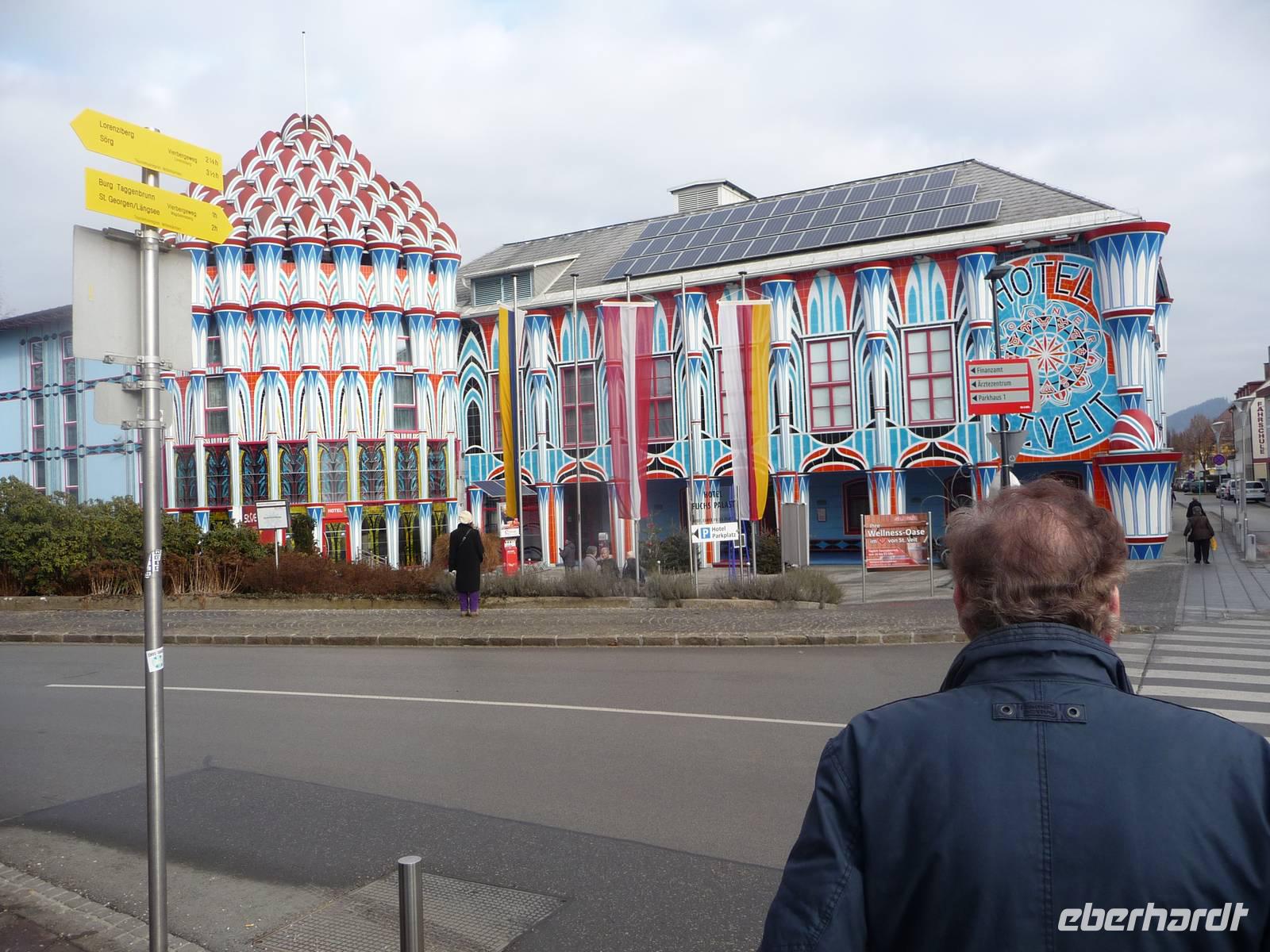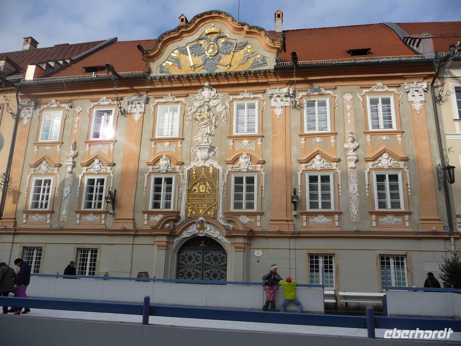 Durch Bad Kleinkirchheim hindurch erleben wir einen bekannten Wintersportort, in dem mit Schneekanonen für gut Schnee auf den Abfahrtspisten gesorgt ist. Weiter geht es an Feldkirchen vorbei nach St. Veit an der Glan. Auf dem Hauptplatz, vis-a-vis dem spätgotischen Rathaus mit einer wunderbaren Rokokofassade, läßt der Bürgermeister der Stadt "seinem Volk" bis 12 h mittags Glühwein kostenlos ausschenken. Auch wir sind das Volk und kommen in den Genuss des heißen Getränkes. Zuvor haben wir die farbintensive Fassade eines von dem Wiener Künstler Ernst Fuchs gestalteten Hotels angeschaut und damit ein Kunstobjekt des sogenannten "Fantastischen Realismus" kennengelernt - Reisen bildet.