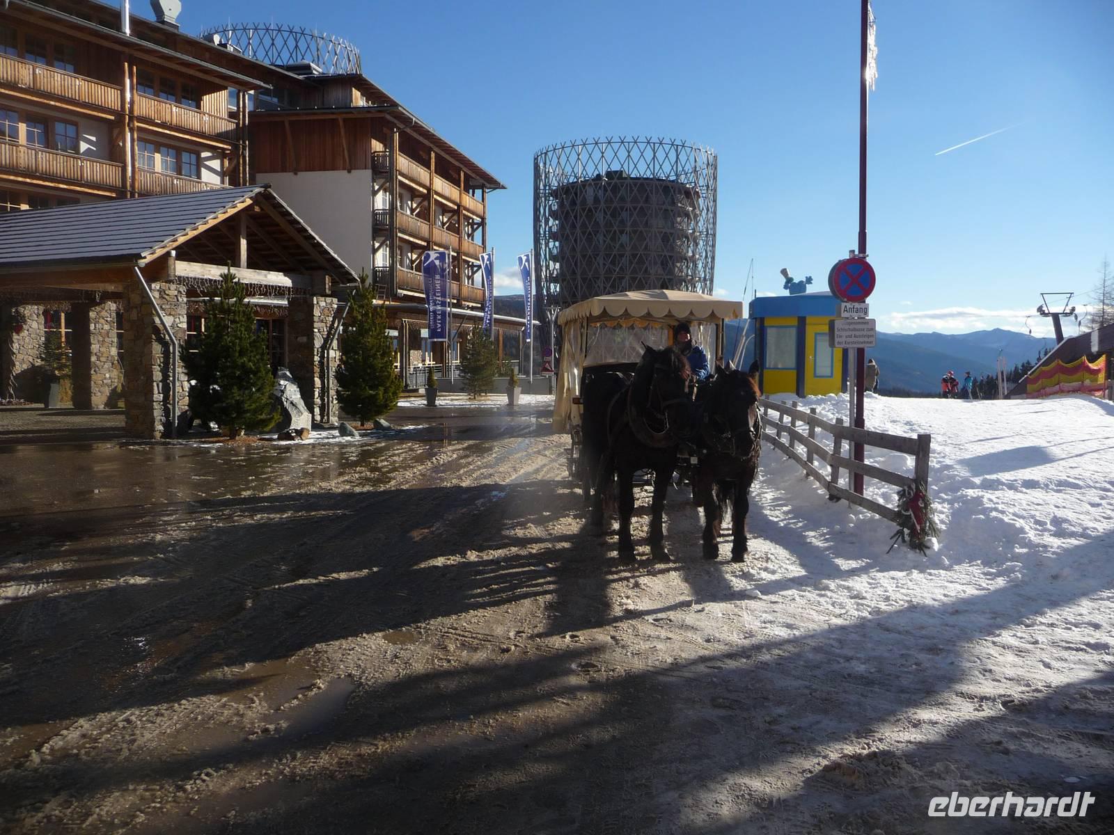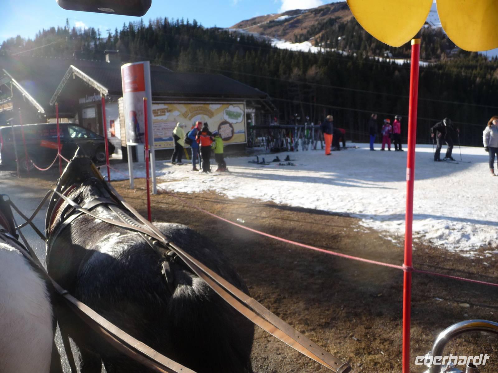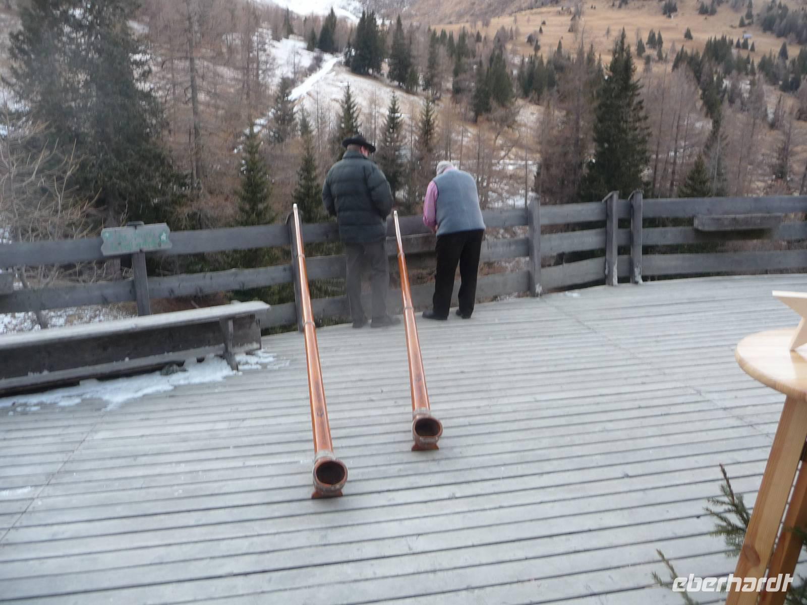 Auf unserem Programm steht dann eine Fahrt in die Bergwelt der Hohen Tauern, zum Katschberg. Dort angekommen sind wir umgeben von Skifahrern, die auf mit Schneekanonen präparierten Pisten ihrem Skivergnügen nachgehen können. Unsere Pferdeschlitten kommen wie bestellt, diesmal allerdings - auf Rädern. Schnee ist Mangelware und so machen wir es uns dennoch gemütlich in zwei Pferdekutschen, mit denen wir zu einer urigen Hütte, der Pritzhütte, gefahren werden. Hier gibt es eine zünftige Jause, wozu uns zwei Musikanten mit alpenländischen Klängen unterhalten. Und draußen vor der Hütte können wir zuschauen und zuhören, wie Alphornbläser ihren Instrumenten wunderbare Klänge entlocken.