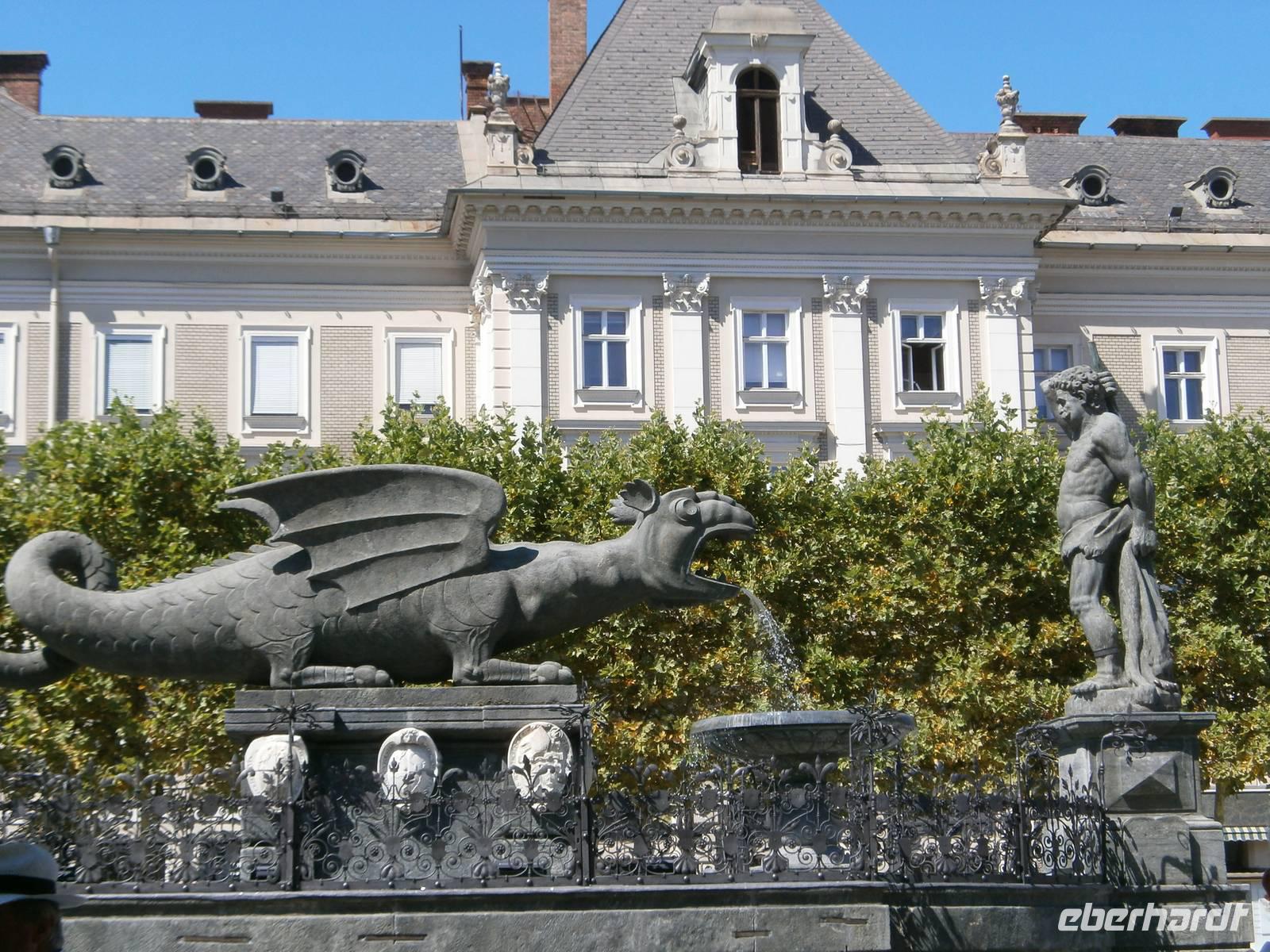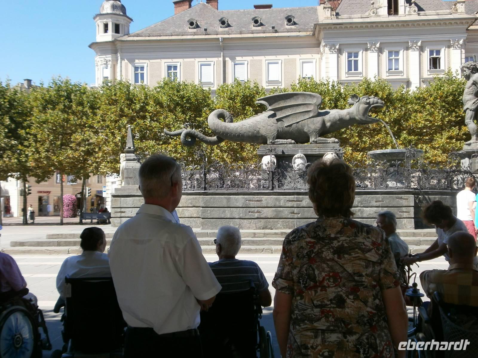 Nach dem Mittagessen fahren wir dann nach Klagenfurt. In der Kärntner Landeshauptstadt werden wir schon zur Stadtführung erwartet. Trotz Temperaturen von über 30 Grad erfüllen wir tapfer das touristische Pflichtprogramm; Stadttheater, der Alte Platz und das nahegelegene Landhaus das Rathaus und natürlich der Neue Platz mit dem Lindwurm, dem Wahrzeichen Klagenfurts, schauen wir uns an.