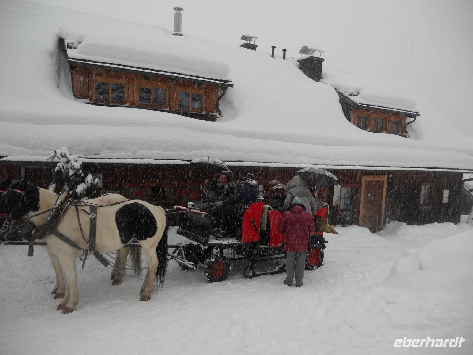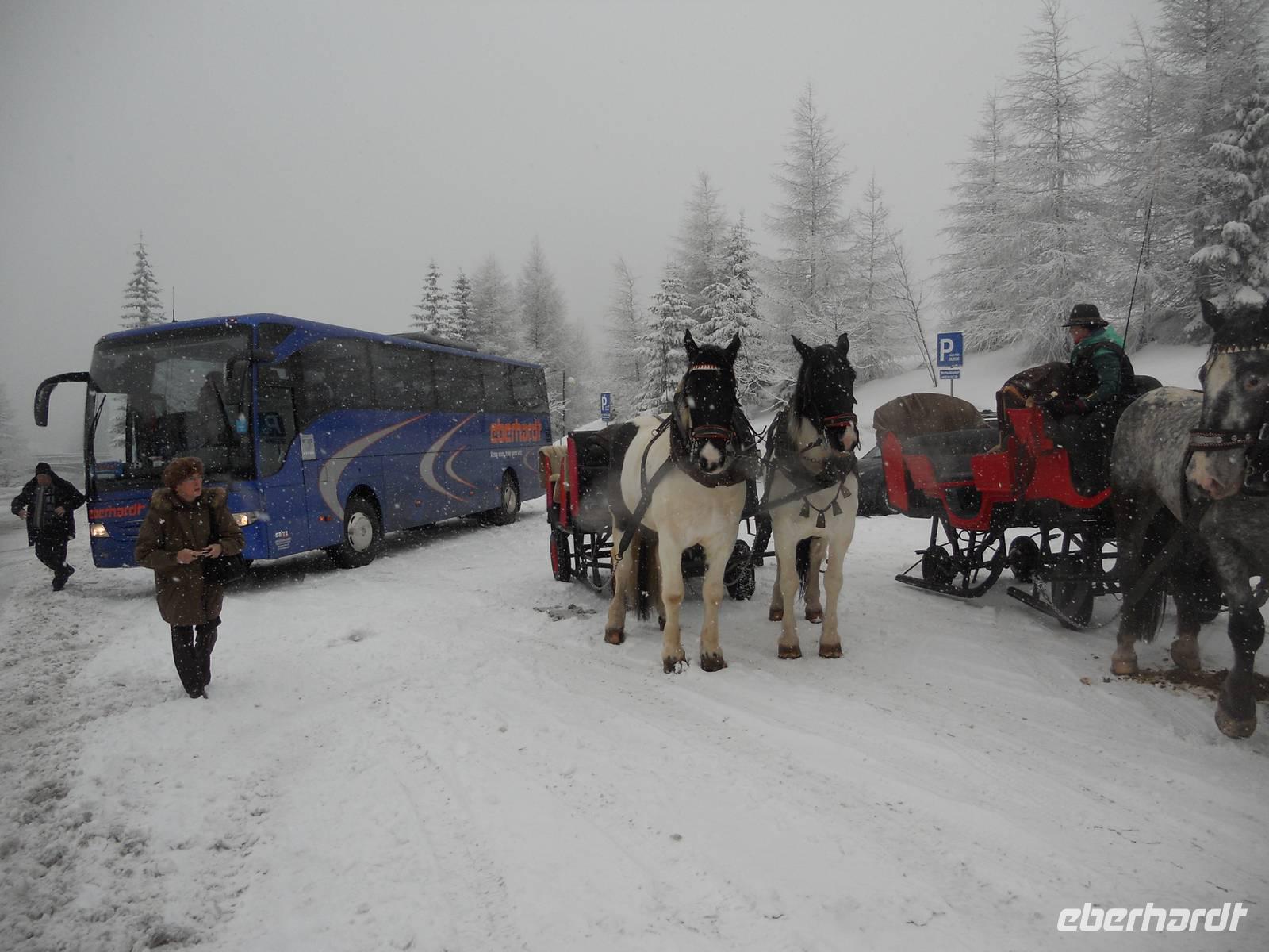 Nach Sturmwarnung und unklaren Wetteraussichten gibt es endlich Entwarnung und die Nachricht, dass die Katschberg-Zufahrt wieder frei ist. Doch der unschöne Dauerregen unten in den Tälern lässt nicht nach, so dass wir am Vormittag noch kurzerhand einen Museumsbesuch einlegen: wir fahren nach Gmünd ins Porsche-Museum. Anschließend geht es dann zum Katschberg, und unser Fahrer Jörg muss Ketten aufziehen. Keine leichte Aufgabe, aber unerlässlich, denn wir fahren ja bis auf ca. 1600 m Höhe. Nun wechselt der Regen auch bald in Schnee, mit jedem Höhenmeter wird es mehr. Oben angekommen erwarten uns schon 2 Pferdeschlitten und es geht los. Zwei junge Damen sind unsere Kutscher, dazu ein Hund namens Tessa, der scheinbar alles im Blick und im Griff hat. Es wird eine herrliche Schlittenfahrt. Wir packen uns ein und schützen uns mit Schirmen gegen das viele Weiß vom Himmel.Nach einer knappen Stunde haben wir die wärmende Pritzhütte auf ca. 1700 m erreicht. Was für ein Wintertraum hier oben! Wir staunen und fotografieren und erfreuen uns wie Kinder an der weißen Pracht. Dann gibt's erst mal eine zünftige Brettljause in der Hütte. Unsere Sachen hängen wir zum Trocknen auf, und nach einer urig gemütlichen Stunde geht's wieder hinaus und zurück. Zurück am Parkplatz können wir es uns bald im Bus gemütlich machen. Äußerst vorsichtig und langsam fahren wir zurück ins Tal. Dann müssen die Ketten wieder abgezogen werden, und es gibt zumindest großen Beifall für unseren Fahrer, mehr konnten wir ihm ja nicht helfen. Auf dem Heimweg beginnt es wieder durchweg zu regnen, aber das störte uns wenig, denn wir haben heute ein unvergessliches Wintererlebnis gehabt.