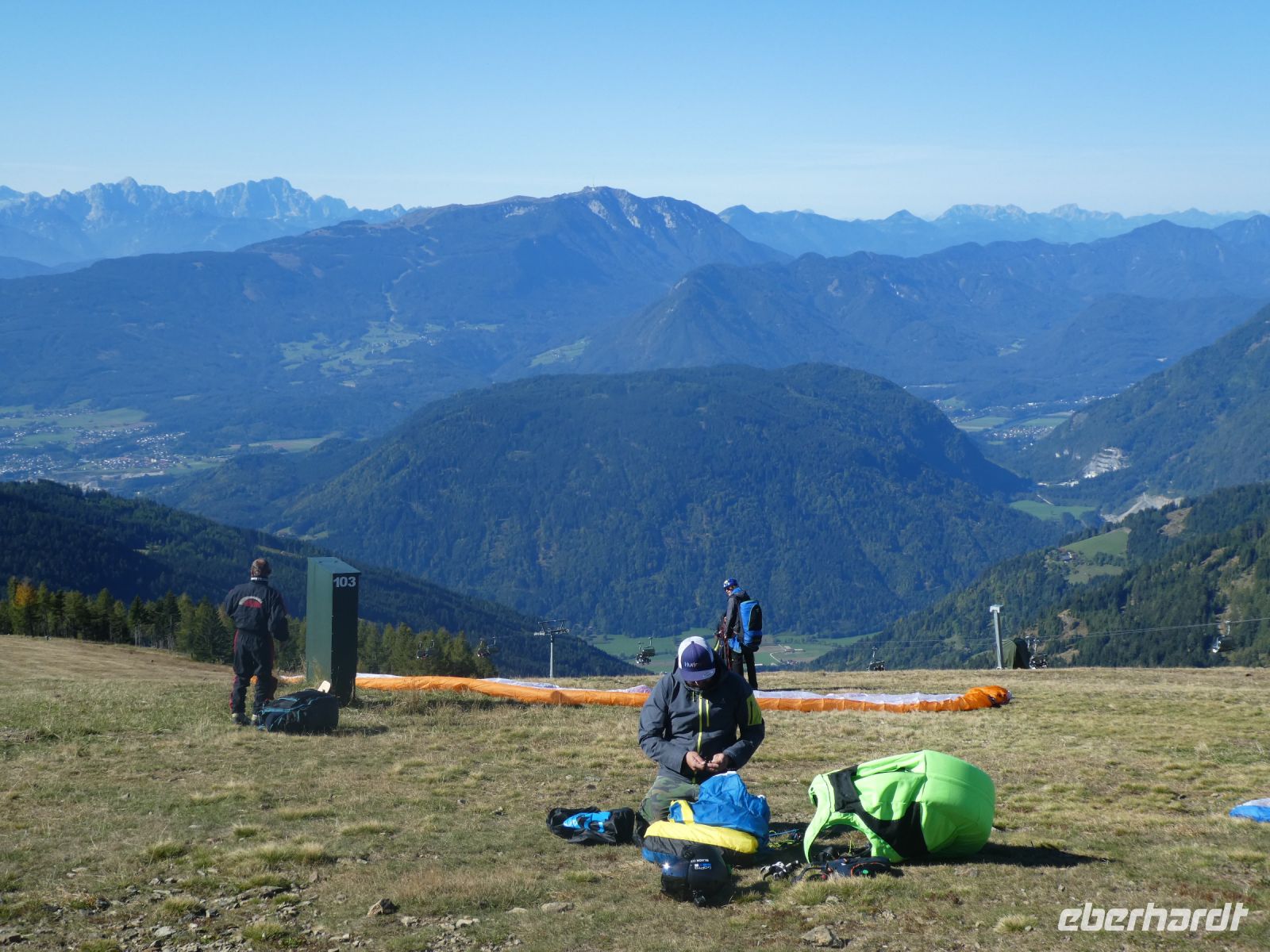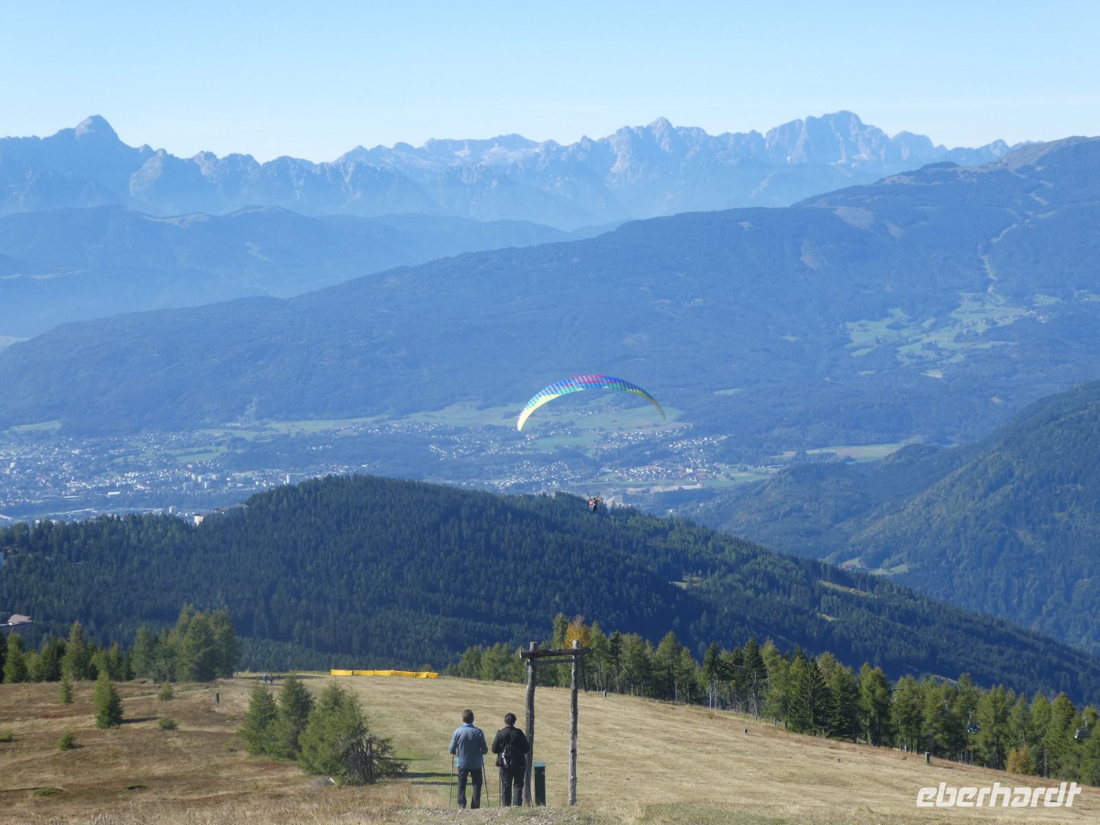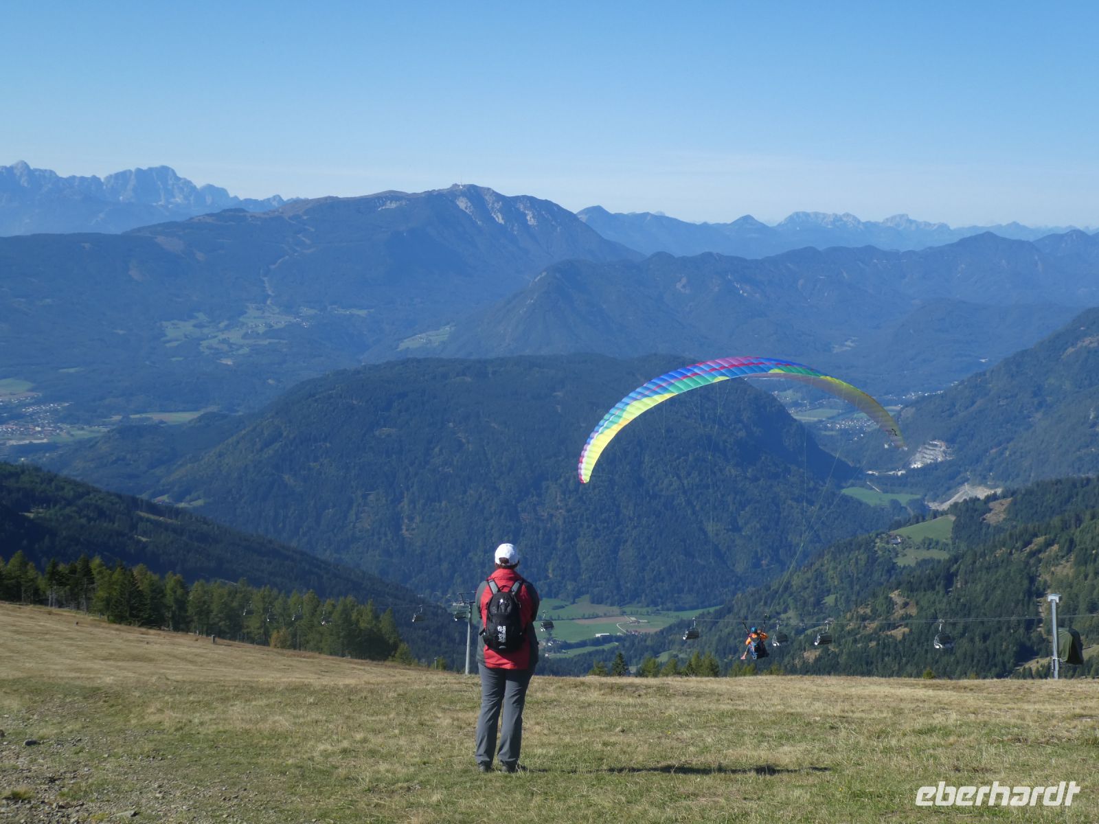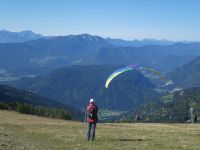 Das Warten hatte sich gelohnt schönes Wetter und Sonnenschein erwartete uns auf der Gerlitzen. Also auf zum Ossiacher See nach Annenheim. Mit der Gondel fuhren wir hinauf zur Mittelstation an der Kanzelhöhe. Dort stiegen wir in den Sessellift um der uns hinauf in 1911 m Höhe brachte. Es war nicht nur schönes Wetter, sondern auch die Thermik stimmte und so konnten wir zahlreiche Paragleiter bei ihrem Start zu schauen und ihren Flug beobachten. Auch in unserer Gruppe war eine mutige dabei die sich das Abenteuer nicht entgehen ließ die Umgebung aus der Vogelperspektive zu betrachten. Ein tolles Erlebnis so ein Tandemsprung. Viele Wanderwege und Aussichtspunkte rings um den Berg wurden genutzt und somit konnten wir den 360° Blick in vollen Zügen genießen. Die Villacher Alpenstraße war unser nächstes Ziel. Die 16,5 km lange Straße wurde 1965 eröffnet und führt hinauf zum Dobratsch. Wir fuhren an der Villacher Sprungschanzen vorbei zum ersten Aussichtspunkt mit einem Blich über Villach und den Ossiacher See. Vorbei an dem Alpengarten wo in den Sommermonaten 800 Arten zu bewundern sind erreichen wir den Berggasthof Rosstrattenstüberl. Er lud zum Kaffee trinken ein. Dort ist der Dobratsch 2167 m schön zu sehen. Eine Wanderung zum Gipfel dauert ca. 2 Stunden. Eine 20-minütige Wanderung führt an den Südhang zu dem neuen Aussichtspunkt "Gams- und Gipfelblick“. Die nicht Wanderer liefen oberhalb des Parkplatzes zum Aussichtspunkt Rosskofel und konnten von dort das beindruckende Panorama auf die Karawanken und die Julischen Alpen, die in Slowenien liegen genießen. Der Tag war noch nicht zu Ende den zum Ausklang unserer Reise kehrten wir in Mothes Buschenschank zu einer deftigen und reichhaltigen Jause ein. Ein schöner Ausklang unserer Kärnten Reise.