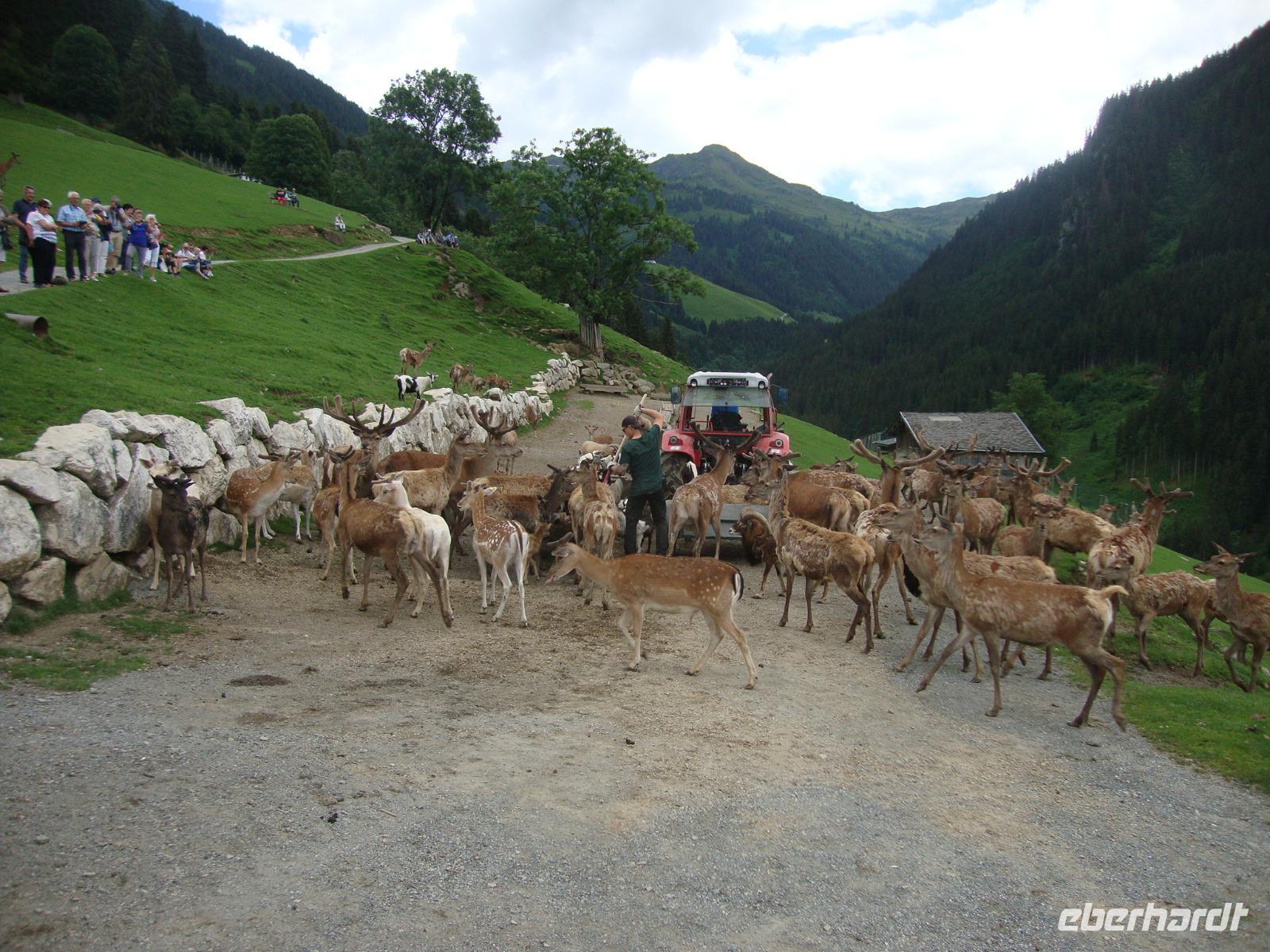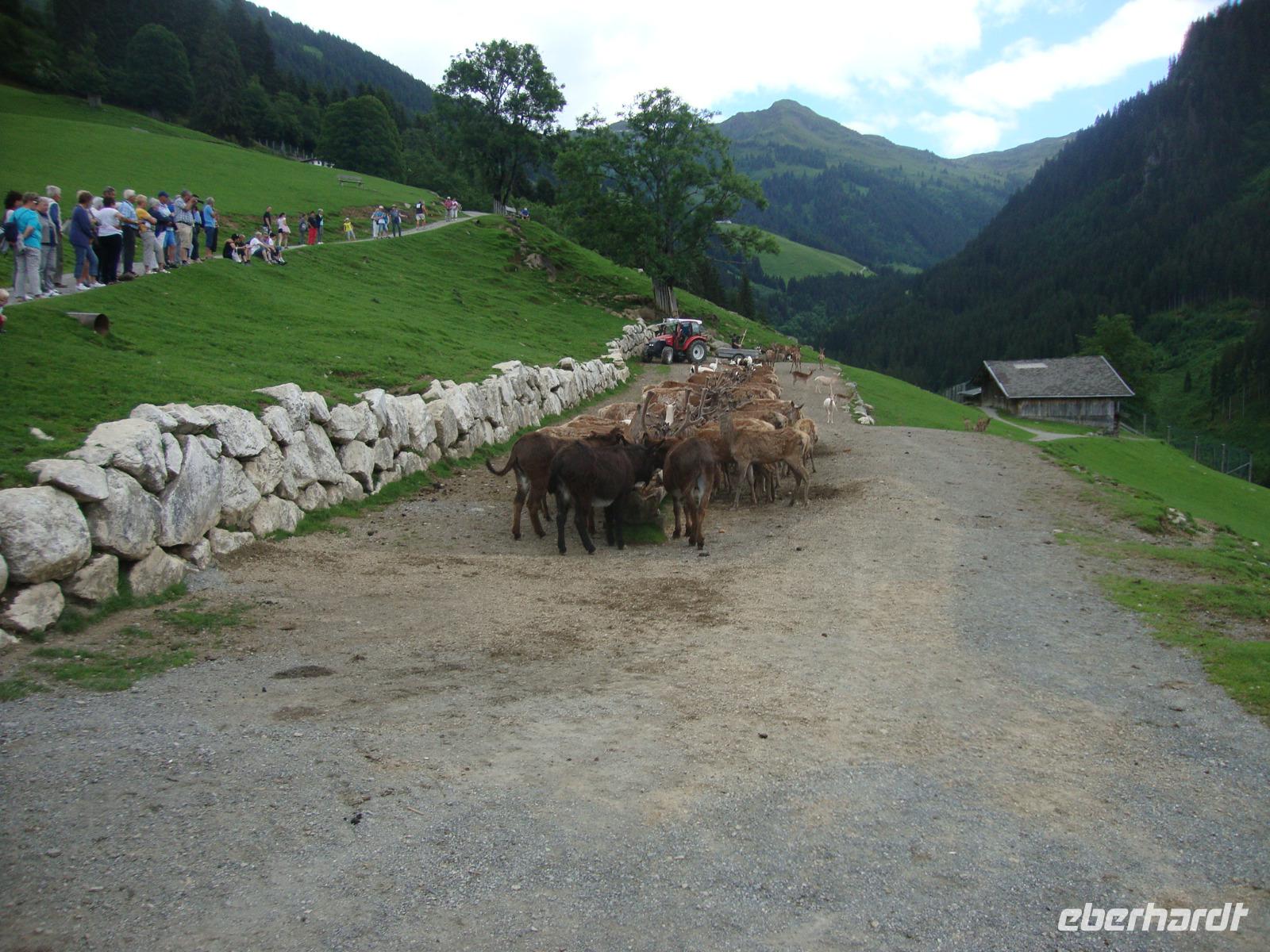 Die Auffahrt zum Kitzbühler Horn mit dem Reisebus ist immer ein besonderes Erlebnis. Heute musste unser Chauffeur Peter, sein ganzes fahrerisches Können zeigen und er tat es mit Bravour. Zuerst ging es durch die schmale Unterführung mit einer Höhe von 3,90 m. Ab der Mautstelle waren noch 7 Kehren zu überwinden. Als wir am Alpenhaus eintrafen, wurden wir vom Chef des Hauses, Franz Reisch, persönlich begrüßt. Peter und ich erhielten die Nadel und die Kappe in 1670 m Höhe. Bis zum Mittag waren die meisten unterwegs, entweder zum Gipfel oder zum Alpenblumengarten, um sich anschließend bei einem guten Essen zu stärken. Die Abfahrt wurde von Peter auch wieder sehr gut gemeistert, denn wir wollten noch nach Aurach, in den Wildpark, um die Wildfütterung zu sehen. Oftmals ist auch Hansi Hinterseer im Wildpark, aber heute konnten wir Ihn leider nicht begrüßen. Es ist immer wieder ein Erlebnis, den Hirschen, Rehen und Jungtieren bei der Fütterung zu zuschauen. Geduldig warten diese, bis der Tracker mit Hänger gefahren kommt und die Tiere füttert. Bei einem guten Eis oder Kaffee liesen wir den Tag ausklingen und sprachen nochmals über das heutige Erlebnis.