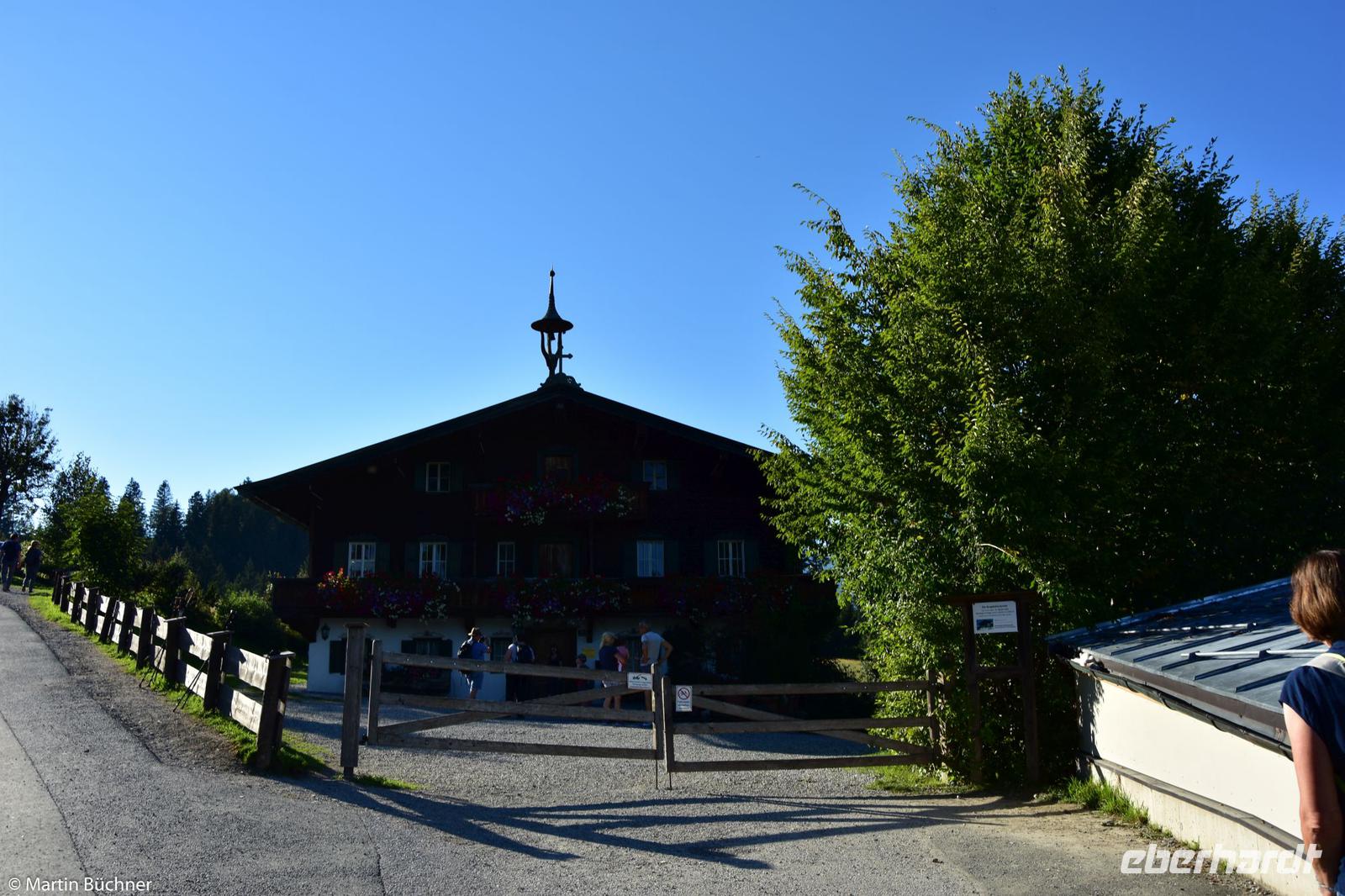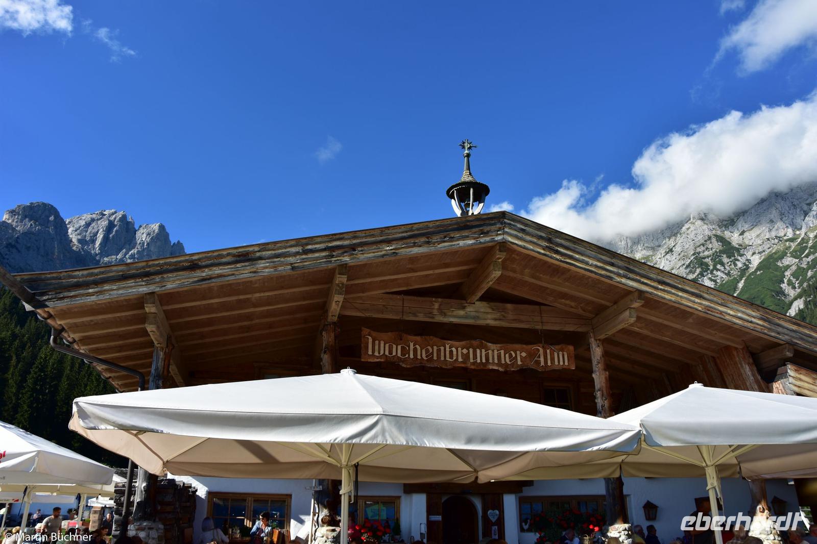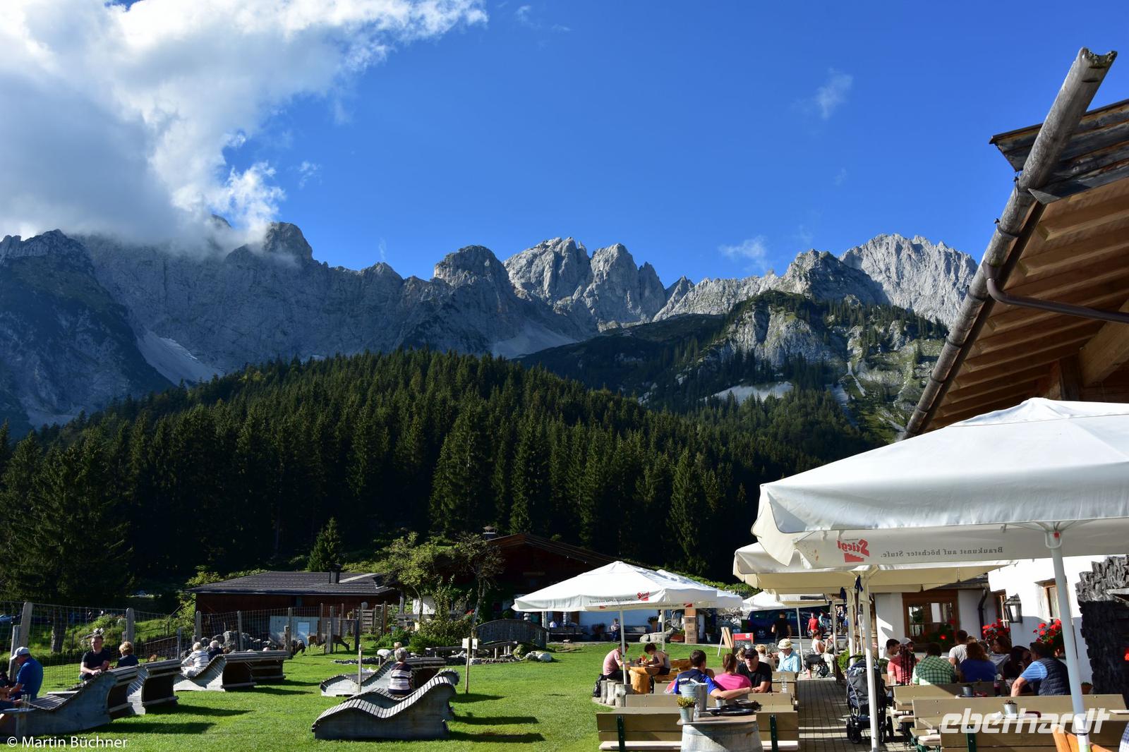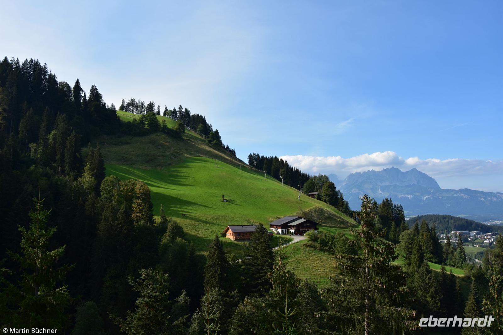 Auf der Wochenbrunner Alm in 1.085 m Höhe erwartet uns eine zünftige Brettljause (in Bayern Brotzeit genannt). Gestärkt von Essen und fantastischen Blick rauf zum Ellmauer Tor (Wilder Kaiser) und bis zum Alpenhauptkamm reisen wir zurück nach Kitzbühel.