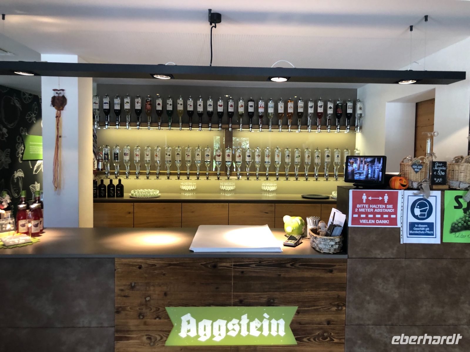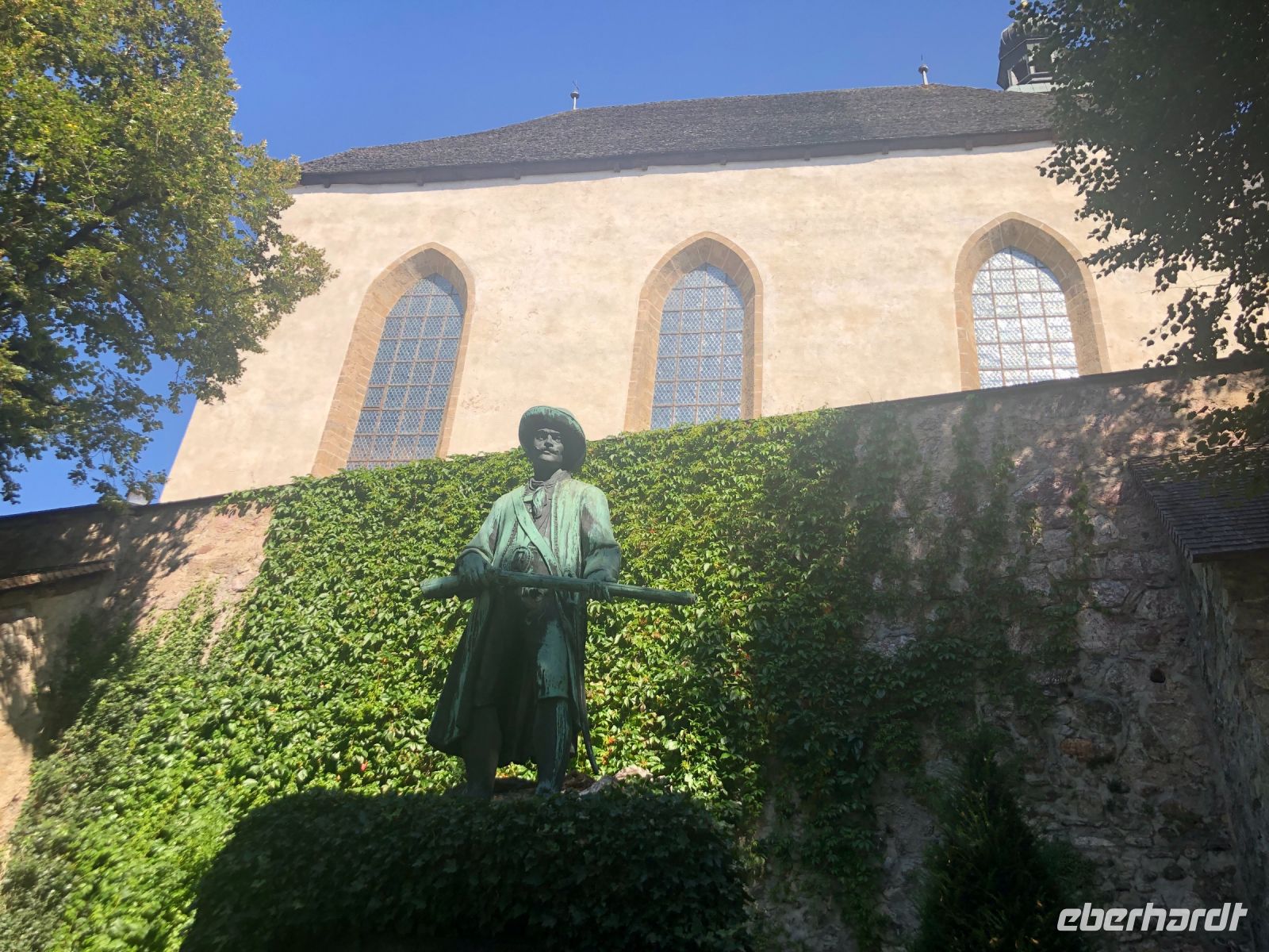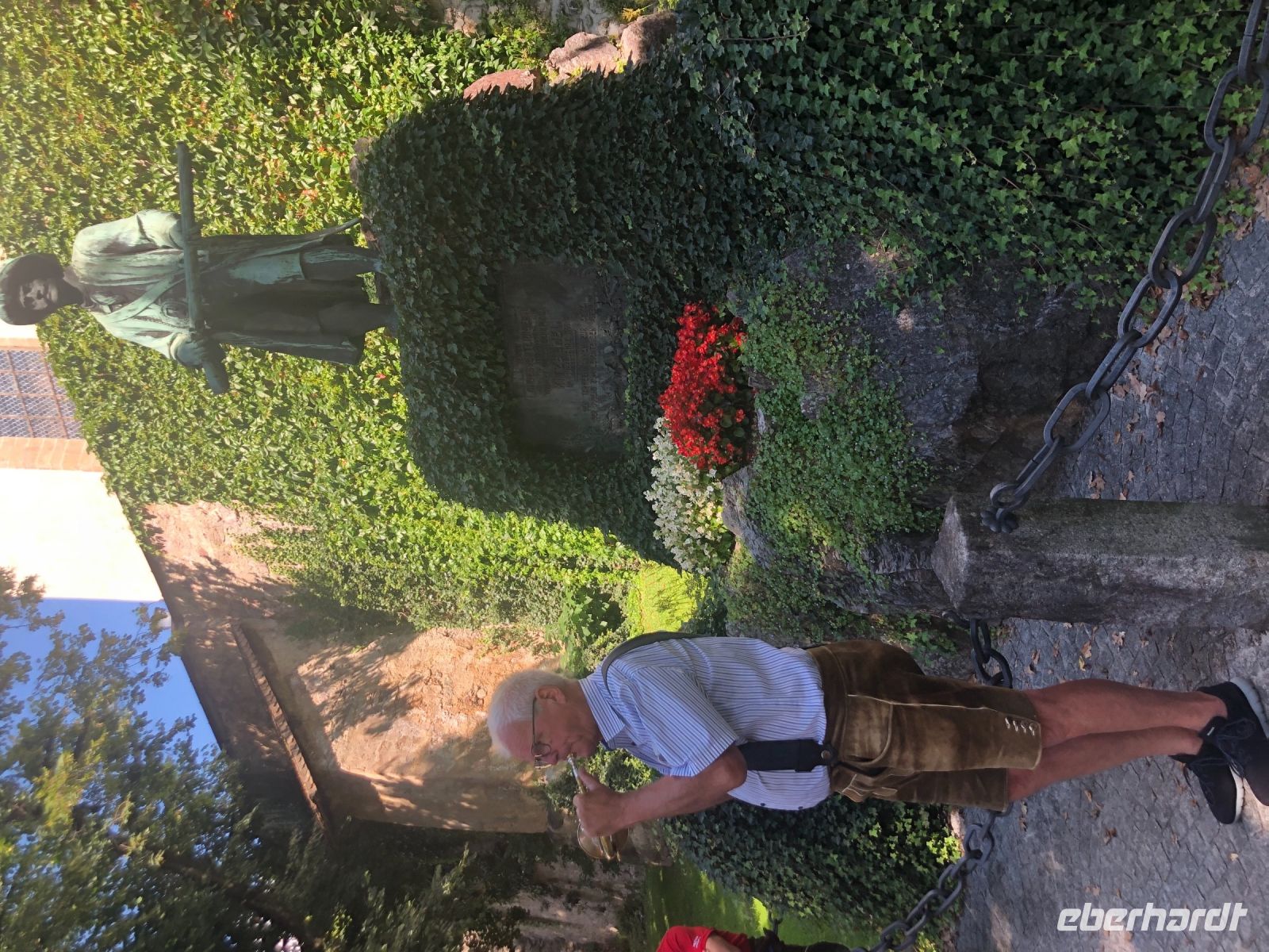 Für den Vormittag haben wir ein kleines Zusatzprogramm geplant. Die Kirche von St. Johann und das Zentrum schauen wir vom Bus aus an. Unseren Stopp legen wir an der Aggstein Brennerei ein. Hier werden Edelbrände, Schnäpse und Liköre hergestellt, verkostet und verkauft. Zum Kosten ist es vielleicht noch ein bisschen früh am Tag, aber einkaufen geht immer. Einen hohen Stellenwert nimmt dabei der Jagatee ein, für den die Aggstein Brennerei schlauerweise ein Patent angemeldet hat. Mit vollen Taschen setzen wir unseren Weg fort und fahren zum Kaiserbachtal. An der Mautstelle steigen wir aus und gehen zu Fuß weiter. Eine ganze Stunde lang genießen wir auf dem Weg die fantastische Aussicht. An einigen Stellen sind Schautafeln aufgestellt. Hier werden bekannte Bergsteiger und Kletterer vorgestellt. Und jeder von ihnen hat ein Utensil zur Verfügung gestellt mit der Beschreibung warum und weshalb das Teil eine Bedeutung hat. So gibt es einen Schuh, der auf dem Mont Everest war, eine Sonnenbrille von einem blinden Bergsteiger, der trotzdem seine Augen schützen muss, eine Griffbürste und vieles mehr. Bevor wir zur Fischbachalm abbiegen, besuchen wir die Gedenkkapelle für Menschen, die am Berg zu Tode gekommen sind. Bis ins Jahr 1881 geht das Andenken zurück. Aber auch in den letzten Jahren gab es einige tödliche Bergunfälle im Kaisergebirge. Die Namen derjenigen werden hier festgehalten und einmal im Jahr findet ein Gedenkgottesdienst statt.