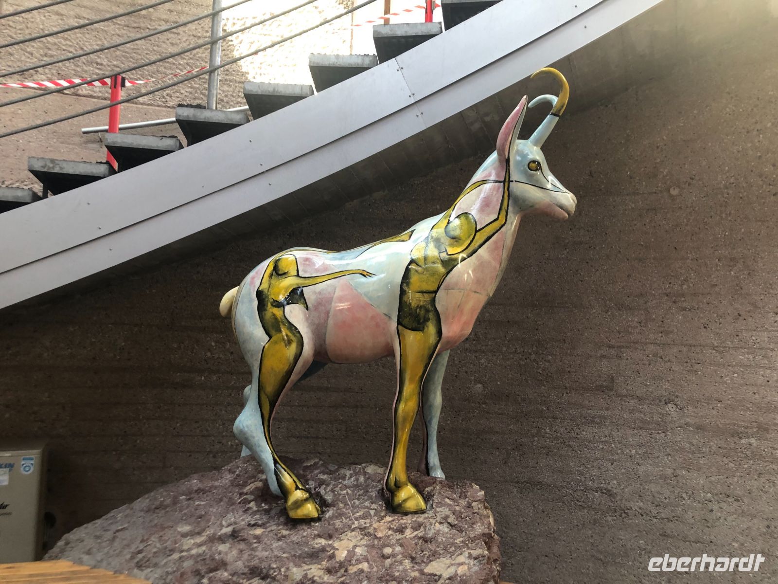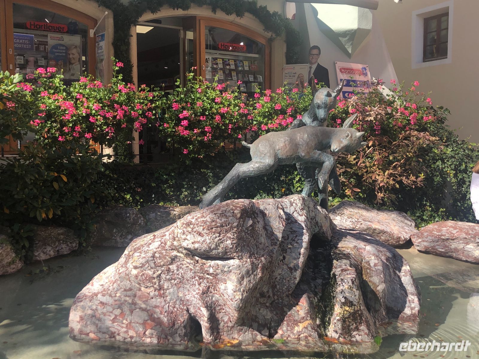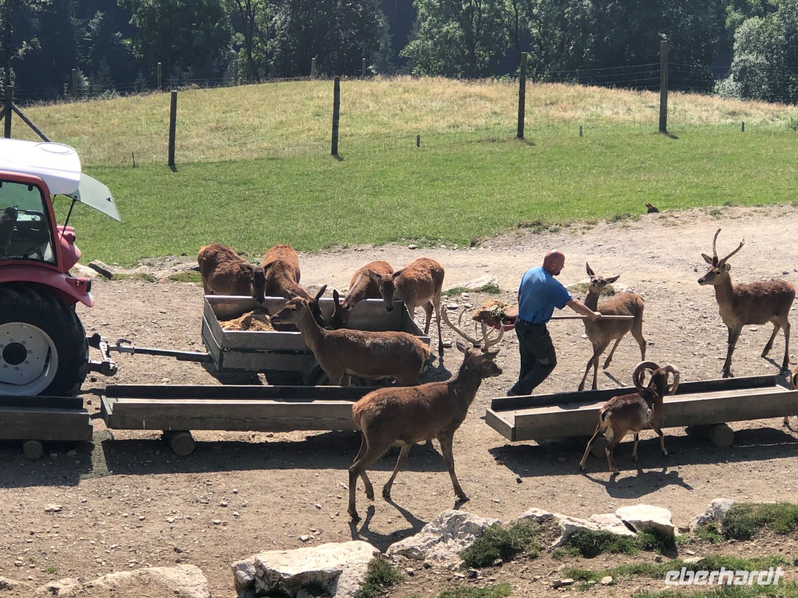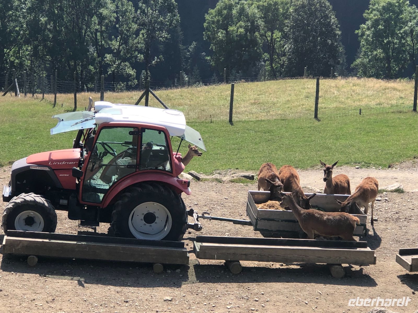 Während sich unser Bus die Panoramastraße wieder hinabschraubt, rauschen auch immer wieder Vespafahrer vorbei. Sie hupen und winken, weil Thomas Platz gemacht und sie vorbei gelassen hat. Nachdem wir auch das schmale Tor wieder unbeschadet durchquert haben, können wir aufatmen und zum Wildpark Aurach fahren. Hier treffen wir auf die Wanderer, die aber lieber bei einem kühlen Bier im Restaurant sitzen bleiben möchten und darauf verzichten, den Hirschen einen Besuch abzustatten. Alle anderen kommen zunächst am Steinbock-Gehege vorbei. Hier erweist uns ein stolzer Bock die Ehre und springt mit einem vollen Satz auf einen Baum, von dem er uns dann von oben herab betrachtet. Etwas weiter grasen dutzende von Rehen, Hirschen, Bergziegen und Esel. Halb drei können wir beobachten, wie alle gespannt auf die Fütterung warten. Die Tiere wissen genau Bescheid. Als der Traktor mit dem Futter kommt, sind schon etliche an den Trögen. Andere beobachten von Ferne aus und warten offensichtlich bis sie dran sind. Ein interessantes Spektakel. Um weitere Tiere des Wildparks zu sehen, muss man einige steile Wege bewältigen. So blinzeln wir noch den Schneeeulen zu und lassen uns bei den Graugänsen sehen. Anschließend bleibt noch Zeit zum Kaffee trinken und Eis oder Kuchen essen, bevor wir nach Kitzbühel zurückkehren.