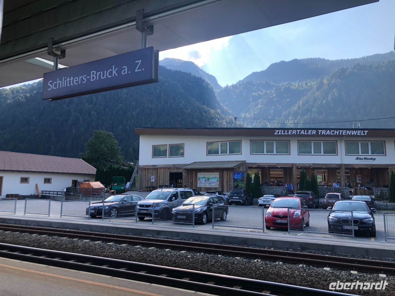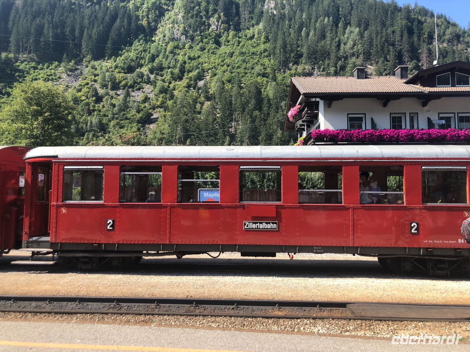 Am Nachmittag fahren wir mit der Zillertalbahn von Mayrhofen nach Jenbach. Eine alte Dampflok zieht zischend und fauchend die historischen Bahnwaggons über die Gleise. Der Zugführer hat Spaß daran, an jeder Station seine Zugpfeife zu bedienen. Nach eineinhalb Stunden erreichen wir Jenbach, wo uns Thomas mit dem Bus und frisch gekochtem Kaffee erwartet.