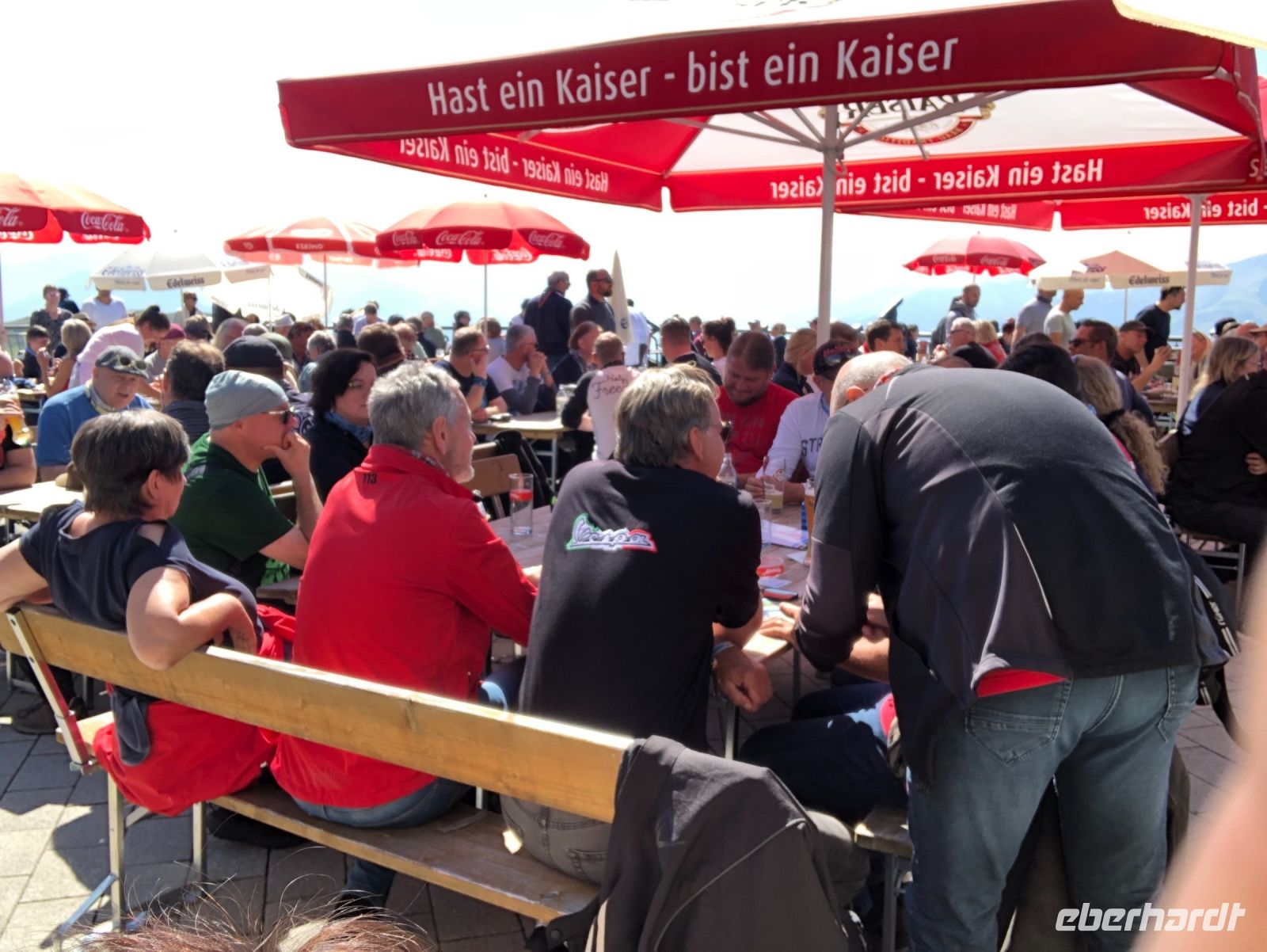 Begleitet von Johann Strauss Musik schiebt sich der Bus Kurve um Kurve die Panoramastraße hinauf. Auf 1670 Metern Höhe ist es geschafft. Kaum haben wir den Bus verlassen, werden wir von einer freundlichen jungen Frau am Alpenhaus begrüßt. Sie ist die Tochter der Familie, die bereits in fünfter Generation das Alpenhaus betreibt. Die Mutter steht im Souvenirshop und andere Verwandte in der Küche. Wir bekommen Informationen, was wir hier alles unternehmen können und wo welcher Weg entlang führt. Nebenbei ist die junge Frau damit beschäftigt, Porschefahrer darauf hinzuweisen, warum sie da, wo sie parken möchten, nicht parken dürfen. Erst mittags erklärt sich, warum. Für uns ist Freizeit angesagt und einige Gäste wagen sich den steilen Weg zum Alpenblumengarten hinauf. Einige schaffen es sogar noch weiter bis zum Gipfel des Kitzbüheler Horns. Und ein paar Verbliebene machen es sich auf der Restaurantterrasse gemütlich. Wir sind ganz alleine hier. Doch das ändert sich bald. Nach und nach erobern Motorradfahrer die Terrasse. Nein, es sind keine Motorradfahrer - alle fahren Vespa. In Zell am See findet das diesjährige Vespa-Treffen statt, das größte in Europa mit Teilnehmern aus 38 Nationen. Die maximale Teilnehmerzahl ist in diesem Jahr auf 1000 begrenzt und 400 davon treffen sich heute auf dem Kitzbüheler Horn. Respekt vor der Bedienung. Trotz dieses Massenansturms schaffen sie es, die Übersicht zu bewahren und freundlich zu bleiben. Was für ein Ameisenhaufen!