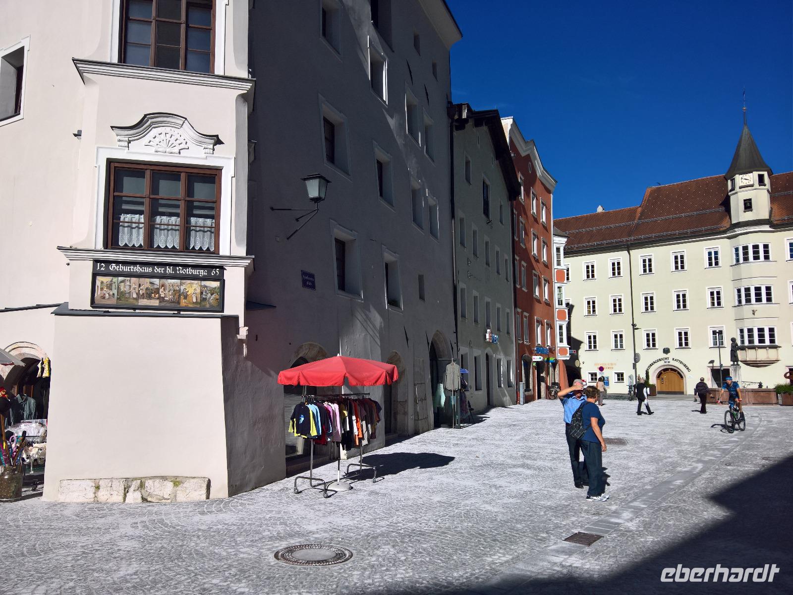 Auch Inn-Salzach-Stadt genannt, nicht zuletzt wegen der typischen Bauform der Häuser mit Scheinfassaden. Noch eine Besonderheit gibt es in Rattenberg: 3 Monate lang kommt infolge der Lage hinter den hoch aufragenden Bergen kein Sonnenstrahl in die Fußgängerzone. Wir haben Glück, zumindest können wir halbseitig in der weiterhin strahlenden Sonne spazieren gehen.