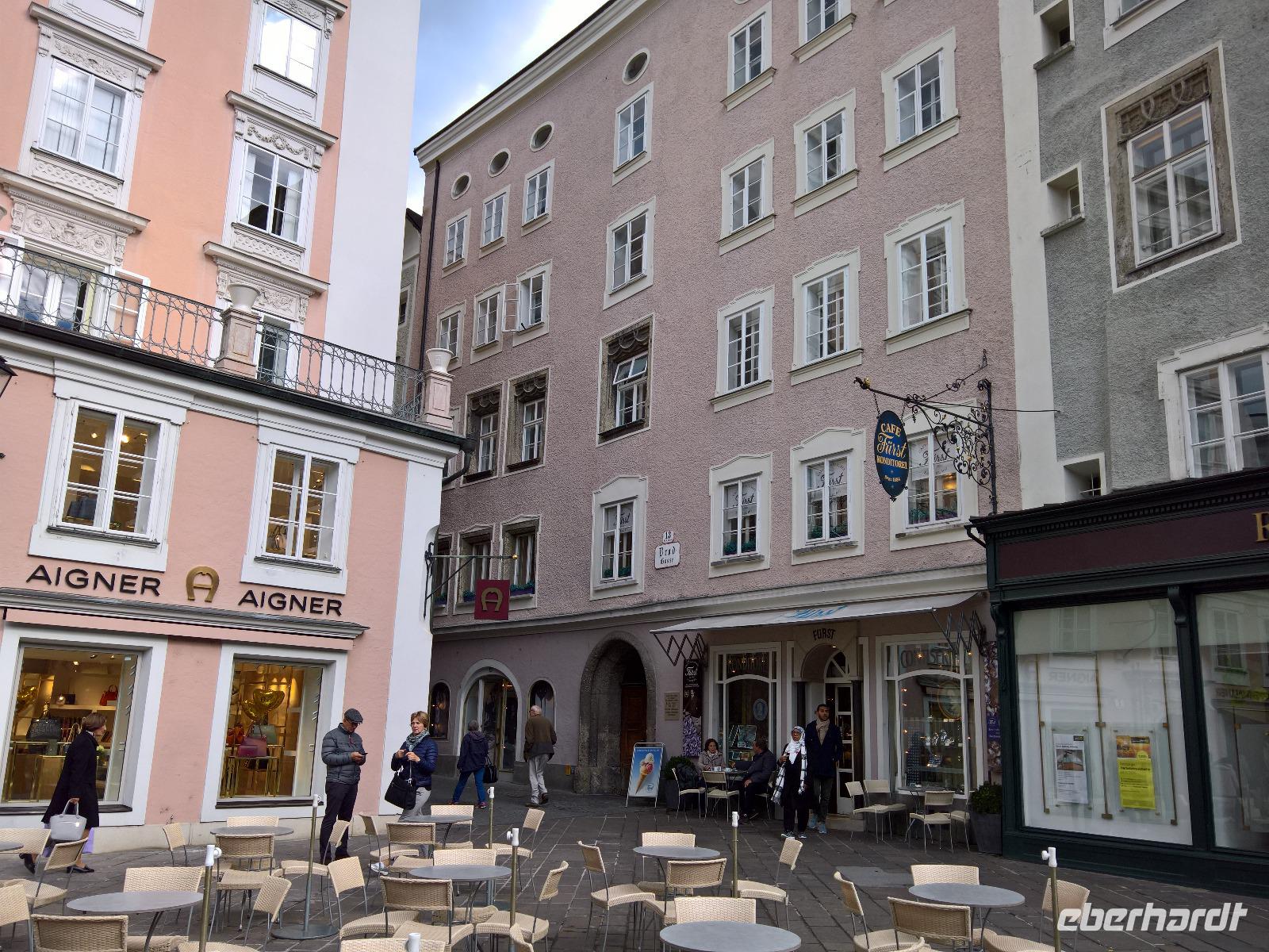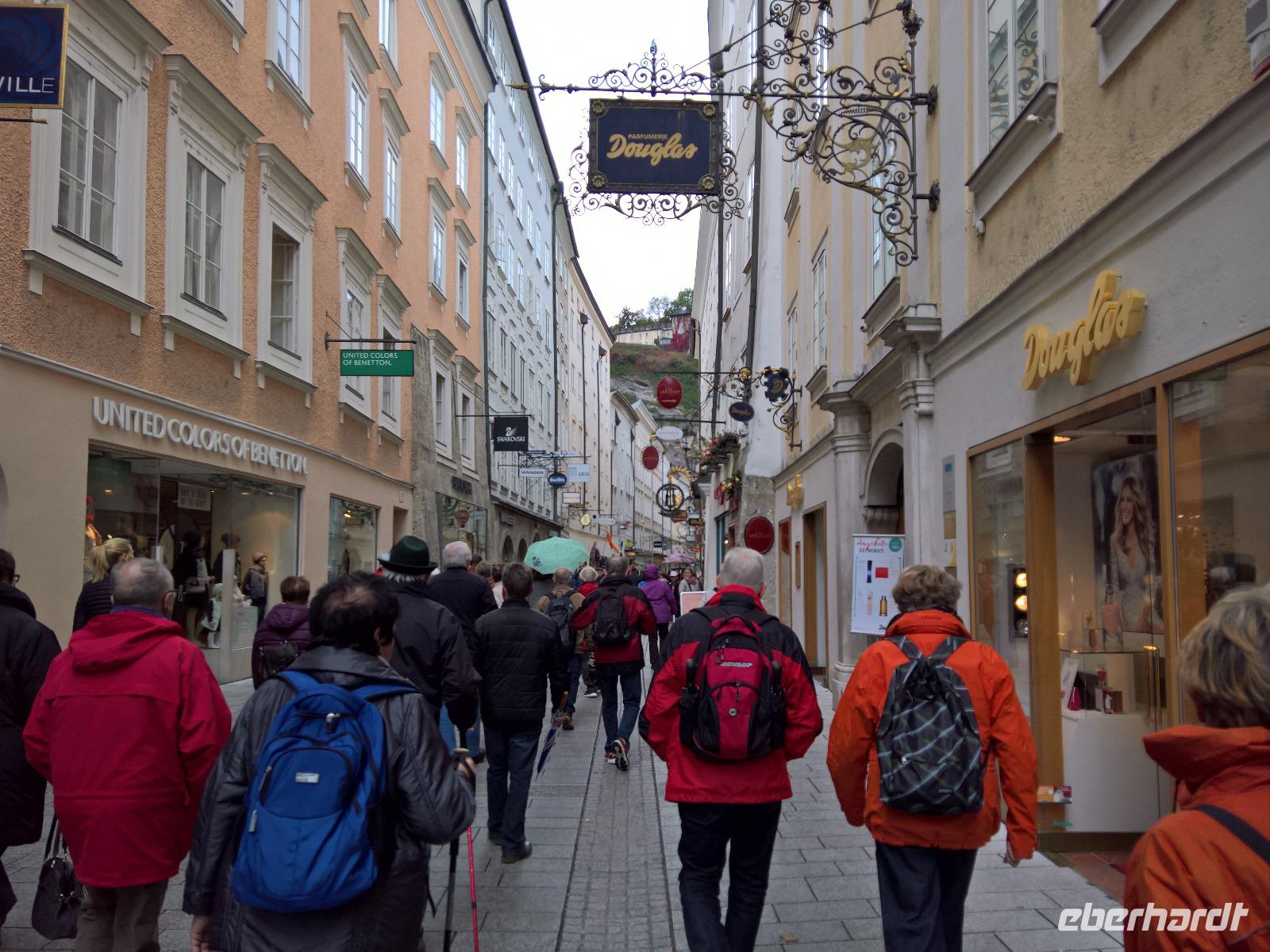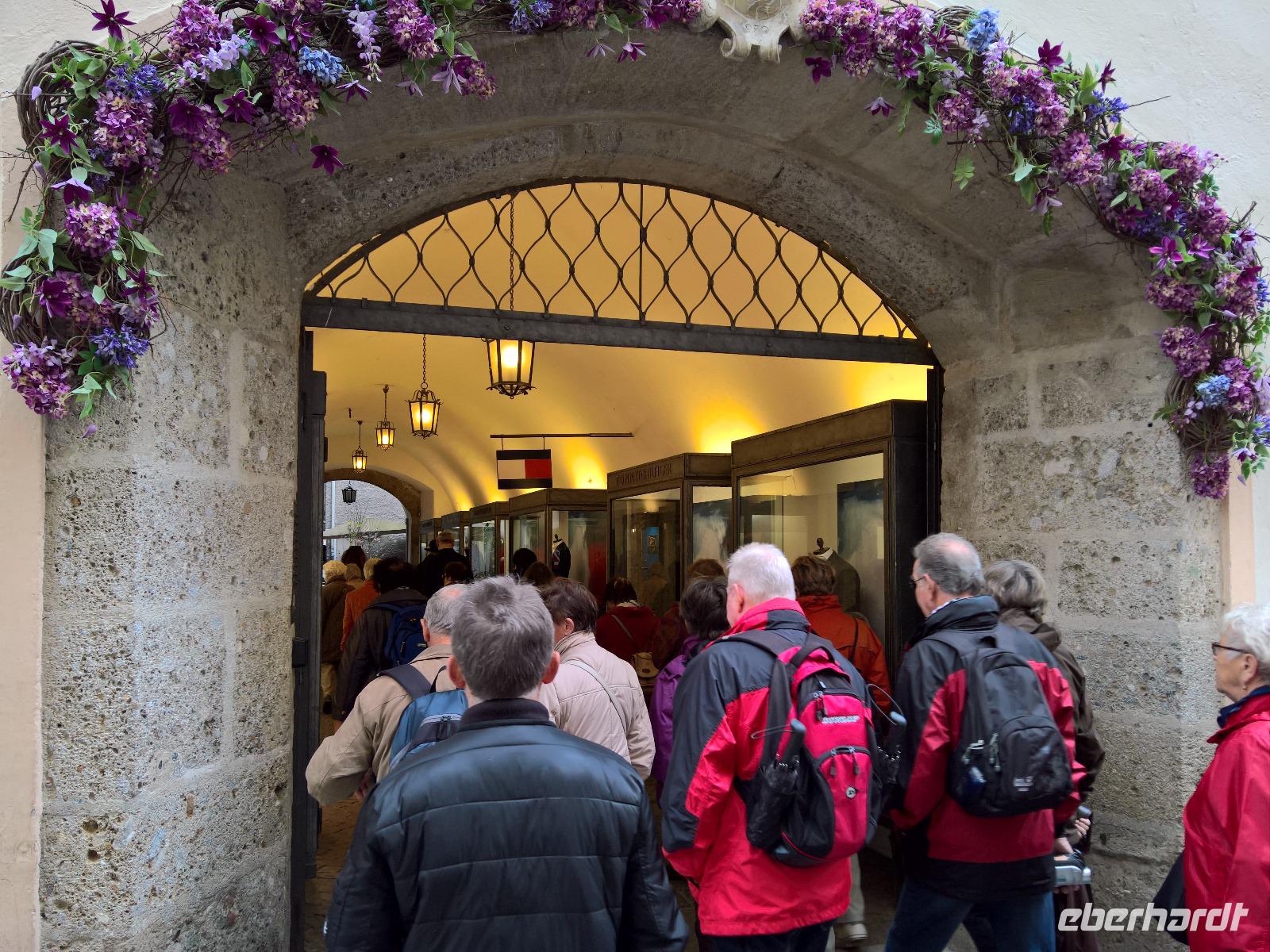 In Salzburgs berühmtester historischer Gasse, der Getreidegasse, gelangen wir zur Hausnummer 9 und damit zum Geburtshaus von Wolfgang Amadeus Mozart. Weiter geht die Führung an vielen zahlreichen schmiedeeisernen Zunftzeichen vorbei hinein in Durchgangshäuser und bei einem Blick in Innenhöfe erhält man das geschlossene Bild einer mittelalterlichen Stadt.