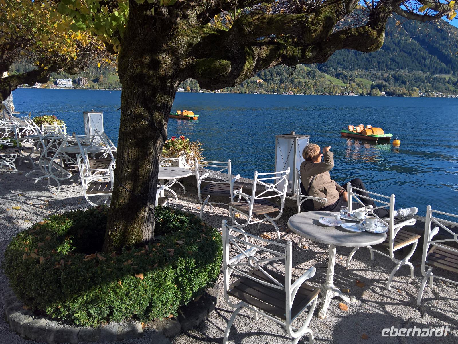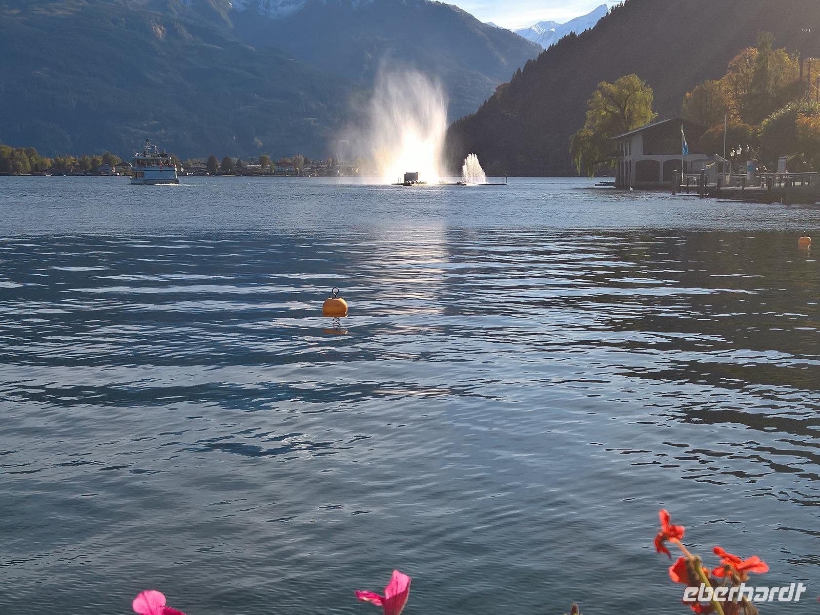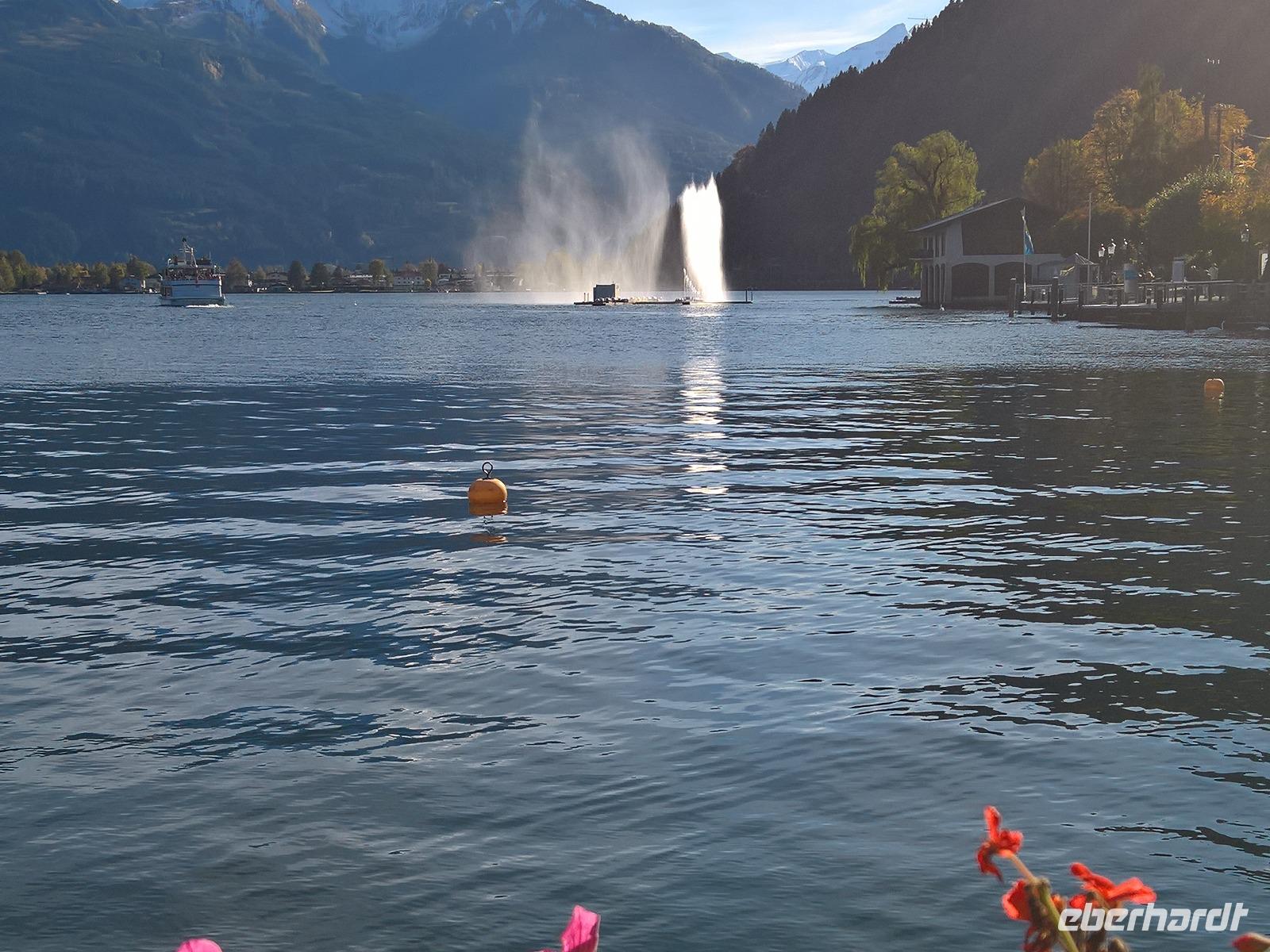Da unsere Hahnenkammfahrt ausgefallen war, schlagen wir den Gästen vor, quasi als kleinen Ersatz, mit unserem Bus nach Zell am See zu fahren, um dort Kaffee zu trinken und eine außergewöhnliche Atmosphäre mit Blick auf den See und in die bereits schneebedeckten Berge zu genießen. Und als auch noch mitten im See Wasserspiele mit Musik von Johann Strauss stattfanden, kannte das Glück keine Grenzen mehr.