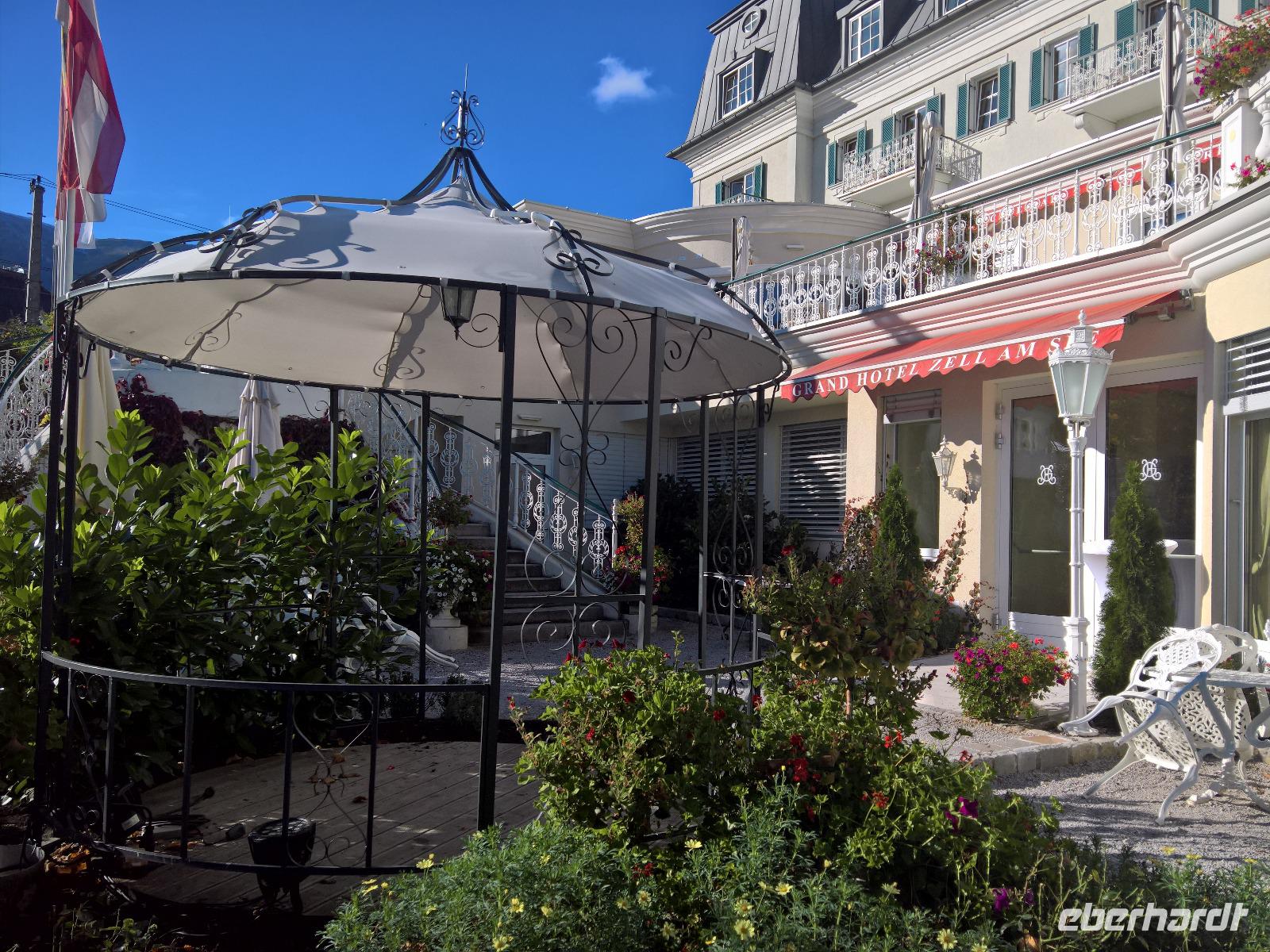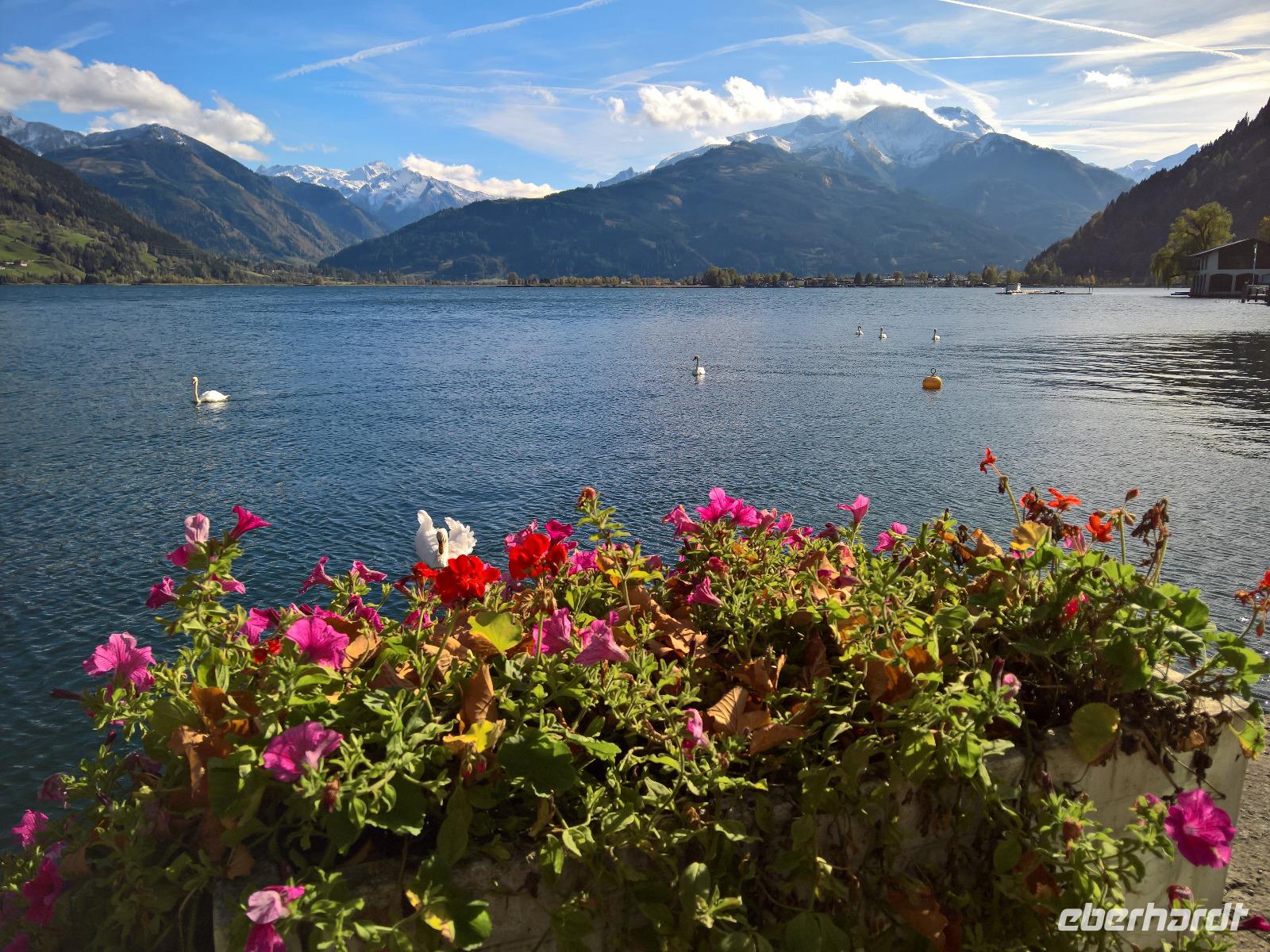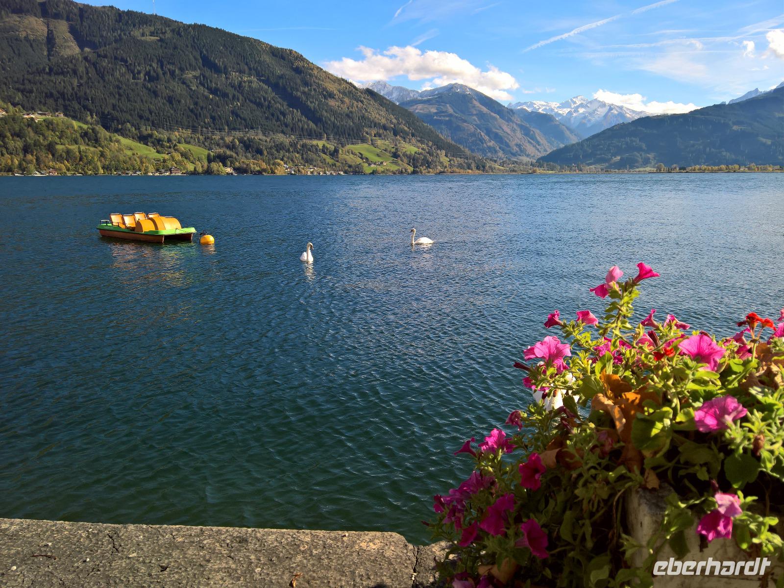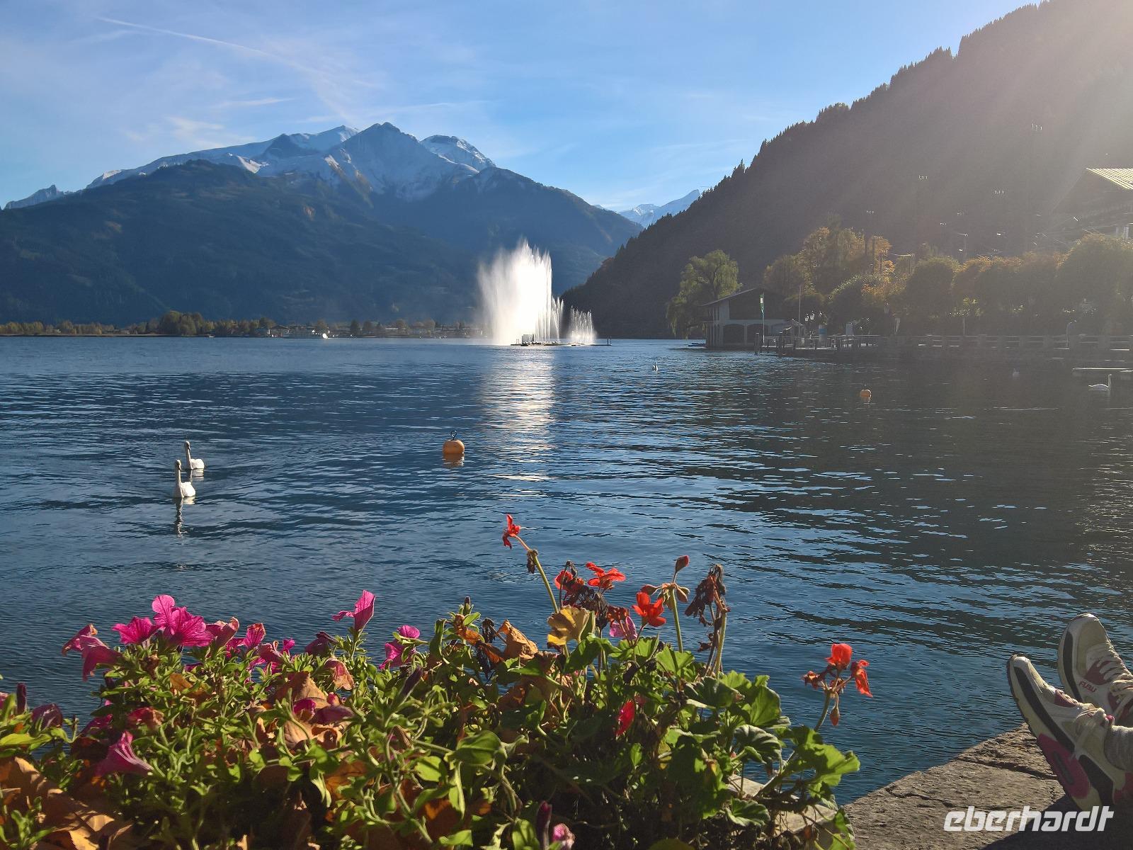 Da unsere Hahnenkammfahrt ausgefallen war, schlagen wir den Gästen vor, quasi als kleinen Ersatz, mit unserem Bus nach Zell am See zu fahren, um dort Kaffee zu trinken und eine außergewöhnliche Atmosphäre mit Blick auf den See und in die bereits schneebedeckten Berge zu genießen. Und als auch noch mitten im See Wasserspiele mit Musik von Johann Strauss stattfanden, kannte das Glück keine Grenzen mehr.