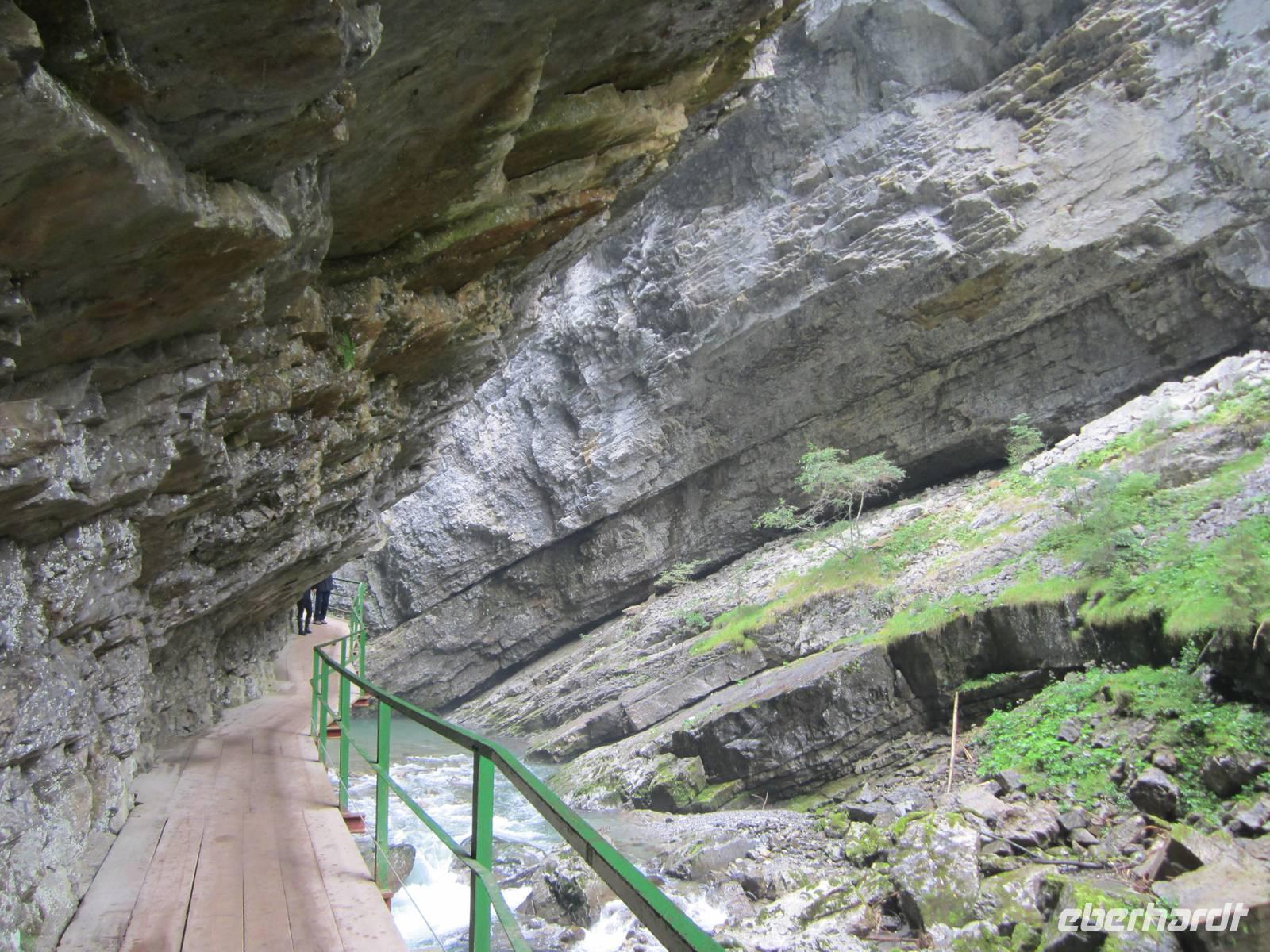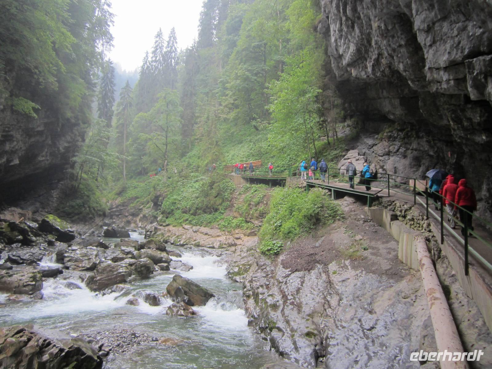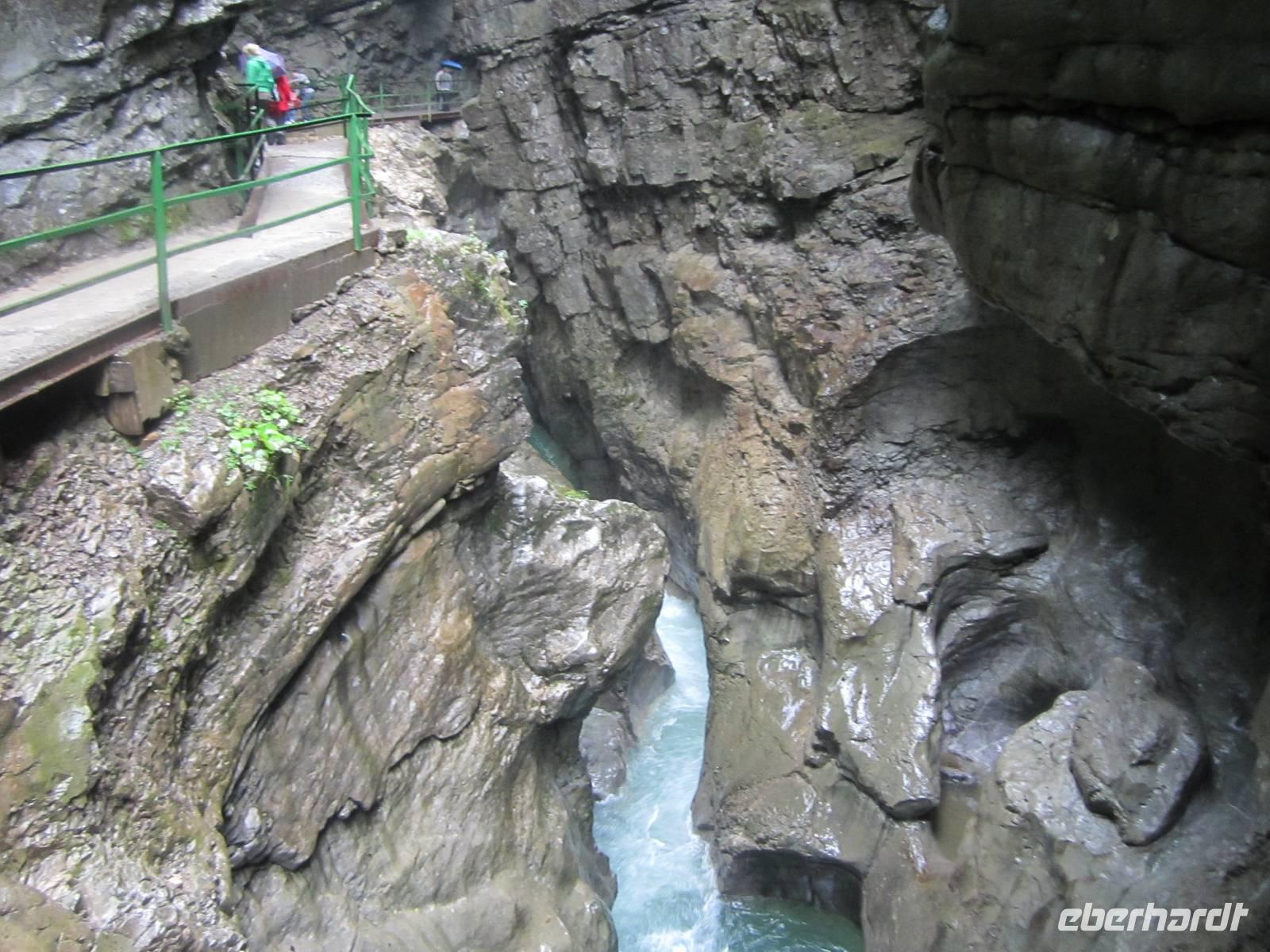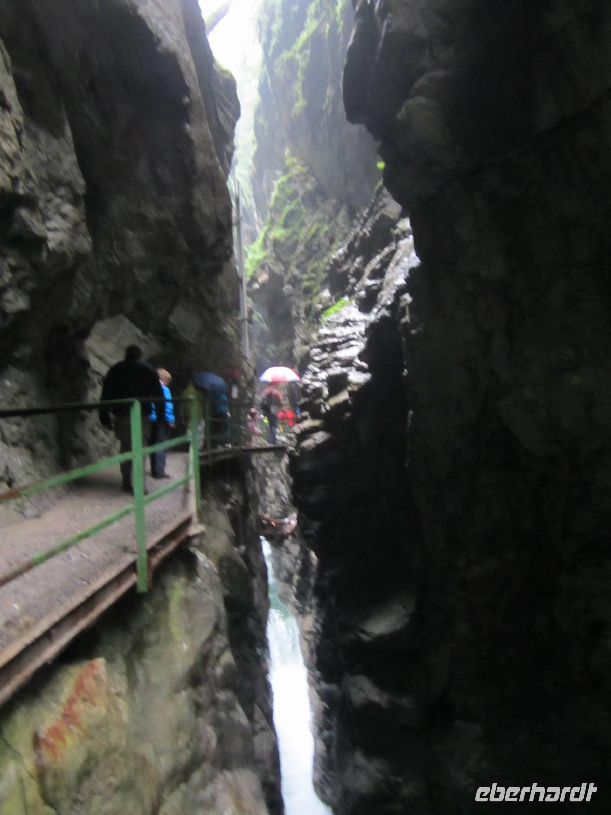 Die Wettervorhersage hat schon vor Beginn der Reise für unseren Sonntag Regen vorhergesagt. Leider trifft diese Vorhersage zu. Die Berge sind in Wolken verhüllt. Für uns aber kein Problem, unser erster Programmpunkt ist die Breitachklamm und die kann man auch bei Regen gut durchwandern. Nach dem Frühstück,das keine Wünsche offen lässt, fahren wir nach Tiefenbach,ein Ortsteil der Gemeinde Oberstdorf. Neuerdings informiert das naturkundliche Zentrum im unteren Eingangsgebäude die Besucher über die Klamm. Wir sehen uns diesen Film an bevor wir den Weg in die Breitachklamm einschlagen. Ein gut begehbarer und größtenteils stufenloser Wanderweg führt uns durch dieses einmalige Naturerlebnis. Tiefe Schluchten, ausgeschliffene Wassermulden, glattpolierte Wandstücke und viele Gebilde lassen unserer Fantasie freien Lauf.Nach reichlich einer Stunde Weg, teilweise auch anstrengend im Anstieg zur Walserschanz, erwartet uns Jan mit einem 3 Gänge Menüam Bus.In der Klamm haben wir den Regen nicht sonderlich gespürt aber auf dem Weg nach Oberstdorf schüttet es regelrecht. Wir sind aber zuversichtlich und fahren an den Schanzen am Schattenberg vorbei auf den Parkplatz der Nebelhornbahn. Die Fahrt auf das Nebelhorn ist ein Programmpunkt für heute. Nach einem Hin und Her siegt die Vernunft. Es macht keinen Sinn mit der Bahn zum Nebelhorn zu fahren. Wir schlagen den Rückweg ein, um das Wellnessangebot des Hotels heute Nachmittag zu nutzen. In Mittelberg angekommen hat sich das Wetter doch gebessert und einige von uns fahren mit dem Walser-Bus nach Rietzlern, dem Hauptort des Kleinwalsertals.Beim gemeinsamen Abendessen wurden zufrieden und entspannt die Erlebnisse des heutigen Nachmittags ausgetauscht.