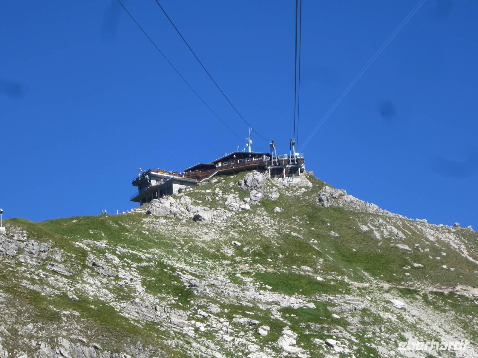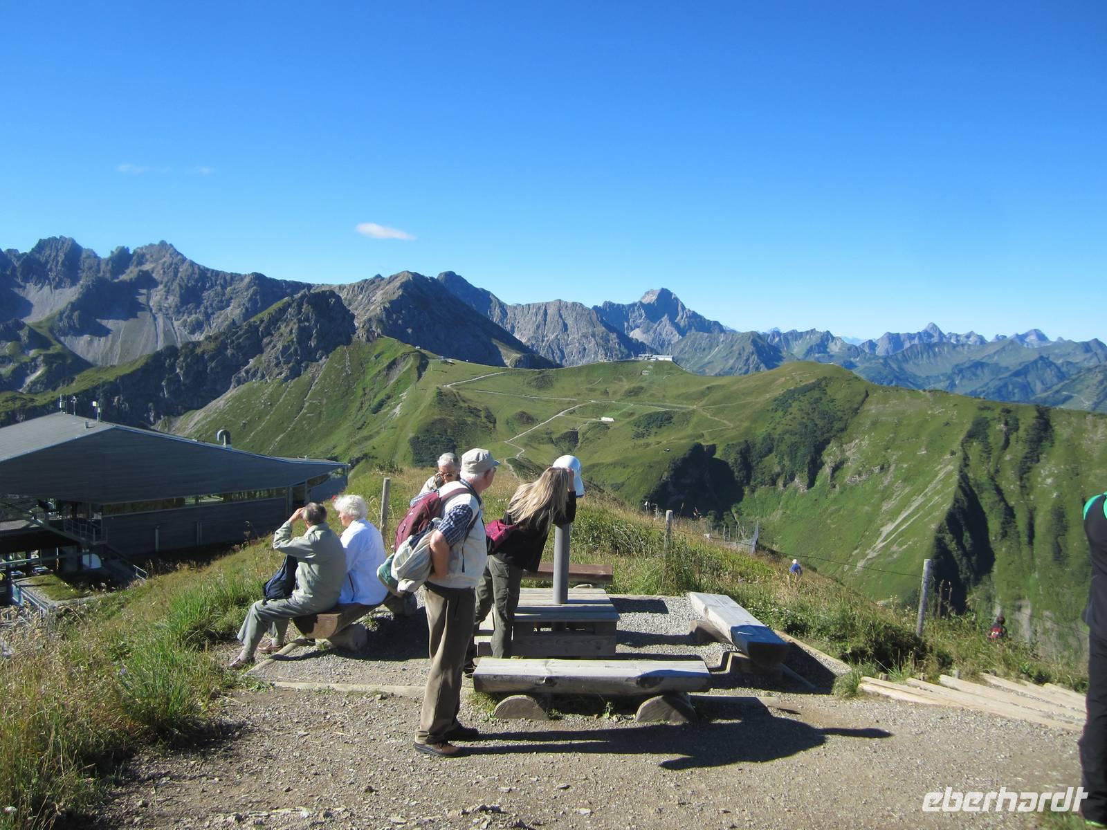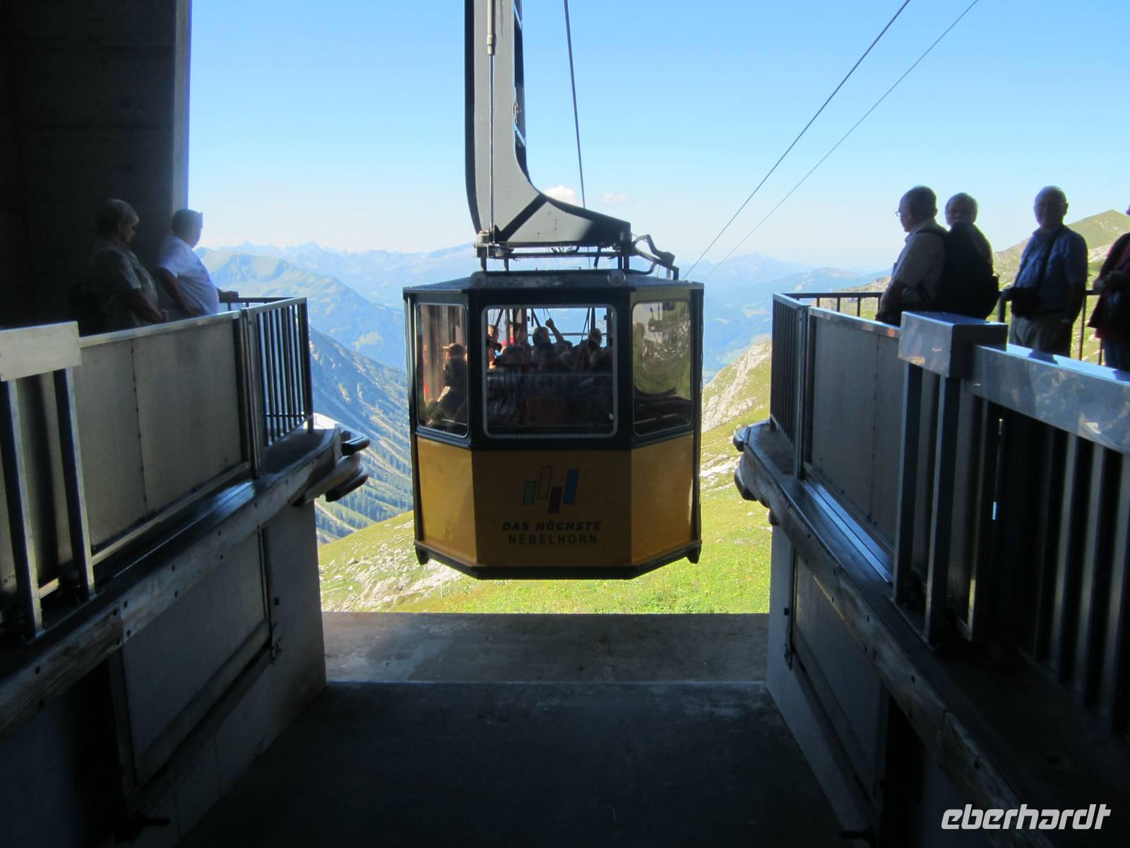 Unser letzter Tag im Kleinwalsertal beginnt sonnig wie die letzten Tage auch. Das Walmerdingerhorn in Mittelwerg ist heute geplant. Wir sind uns aber einig, dass wir heute die Fahrt auf das Nebelhorn nachholen werden. 08.30 Uhr starten wir nach Oberstdorf. Gegen 09.00 Uhr sind wir an der Bergbahn und wir sind nicht die Ersten. Nach rund 40 min Wartezeit fahren wir mit der Kabinenfahrt zum Nebelhorn (3 Stationen) umsteigen ist auf der Station Seealpe und Station Höfatsblick angesagt. Die Fahrt dauert insgesamt ca. 30 min. Wir schaffen es nicht auf Anhieb, dass die gesamte Gruppe auf einmal die Gipfelstation erreicht. Aber alle warten an der letzten Station, da das Gruppenfoto geplant war. Für die Wanderer nicht ganz leicht auf alle zu warten. Zur Belohnung gibt es nicht nur ein Gruppenfoto sondern auch einen ordentlichen Schluck Ettaler Kloster Liqueur Grün.Nach 2,5h treffen wir uns am Bus in Oberstdorf und wir fahren nach Mittelberg. Für heute Nachmittag planen wir unsere letzte Bergbahn auf das Walmerdingerhorn und somit auch ein Abschiednehmen vom Kleinwalsertal.