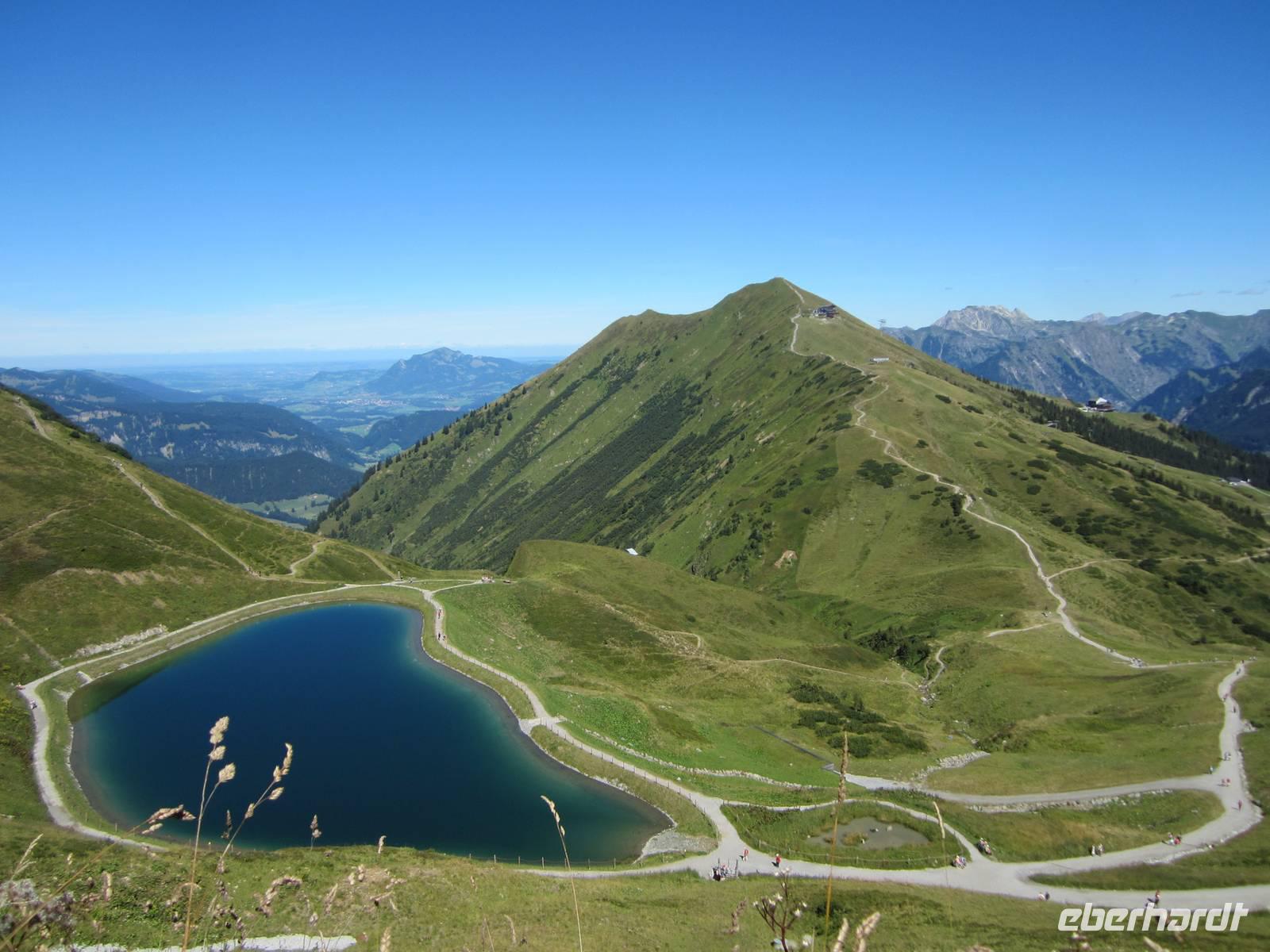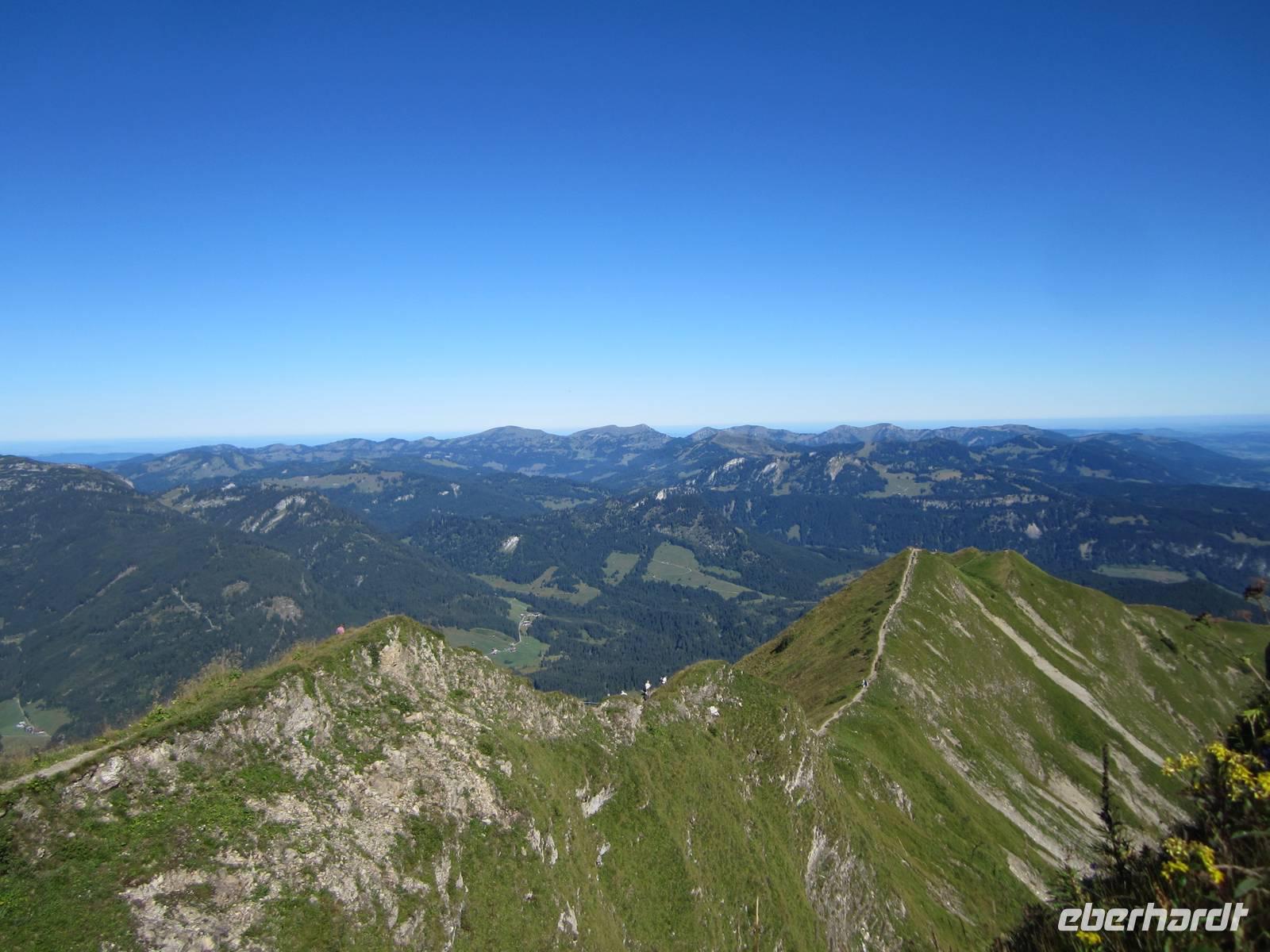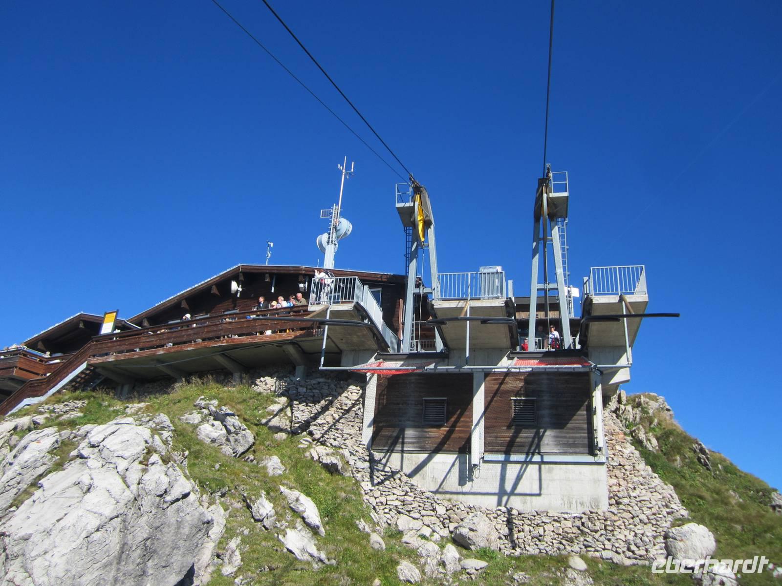 Unser letzter Tag im Kleinwalsertal beginnt sonnig wie die letzten Tage auch. Das Walmerdingerhorn in Mittelwerg ist heute geplant. Wir sind uns aber einig, dass wir heute die Fahrt auf das Nebelhorn nachholen werden. 08.30 Uhr starten wir nach Oberstdorf. Gegen 09.00 Uhr sind wir an der Bergbahn und wir sind nicht die Ersten. Nach rund 40 min Wartezeit fahren wir mit der Kabinenfahrt zum Nebelhorn (3 Stationen) umsteigen ist auf der Station Seealpe und Station Höfatsblick angesagt. Die Fahrt dauert insgesamt ca. 30 min. Wir schaffen es nicht auf Anhieb, dass die gesamte Gruppe auf einmal die Gipfelstation erreicht. Aber alle warten an der letzten Station, da das Gruppenfoto geplant war. Für die Wanderer nicht ganz leicht auf alle zu warten. Zur Belohnung gibt es nicht nur ein Gruppenfoto sondern auch einen ordentlichen Schluck Ettaler Kloster Liqueur Grün.Nach 2,5h treffen wir uns am Bus in Oberstdorf und wir fahren nach Mittelberg. Für heute Nachmittag planen wir unsere letzte Bergbahn auf das Walmerdingerhorn und somit auch ein Abschiednehmen vom Kleinwalsertal.