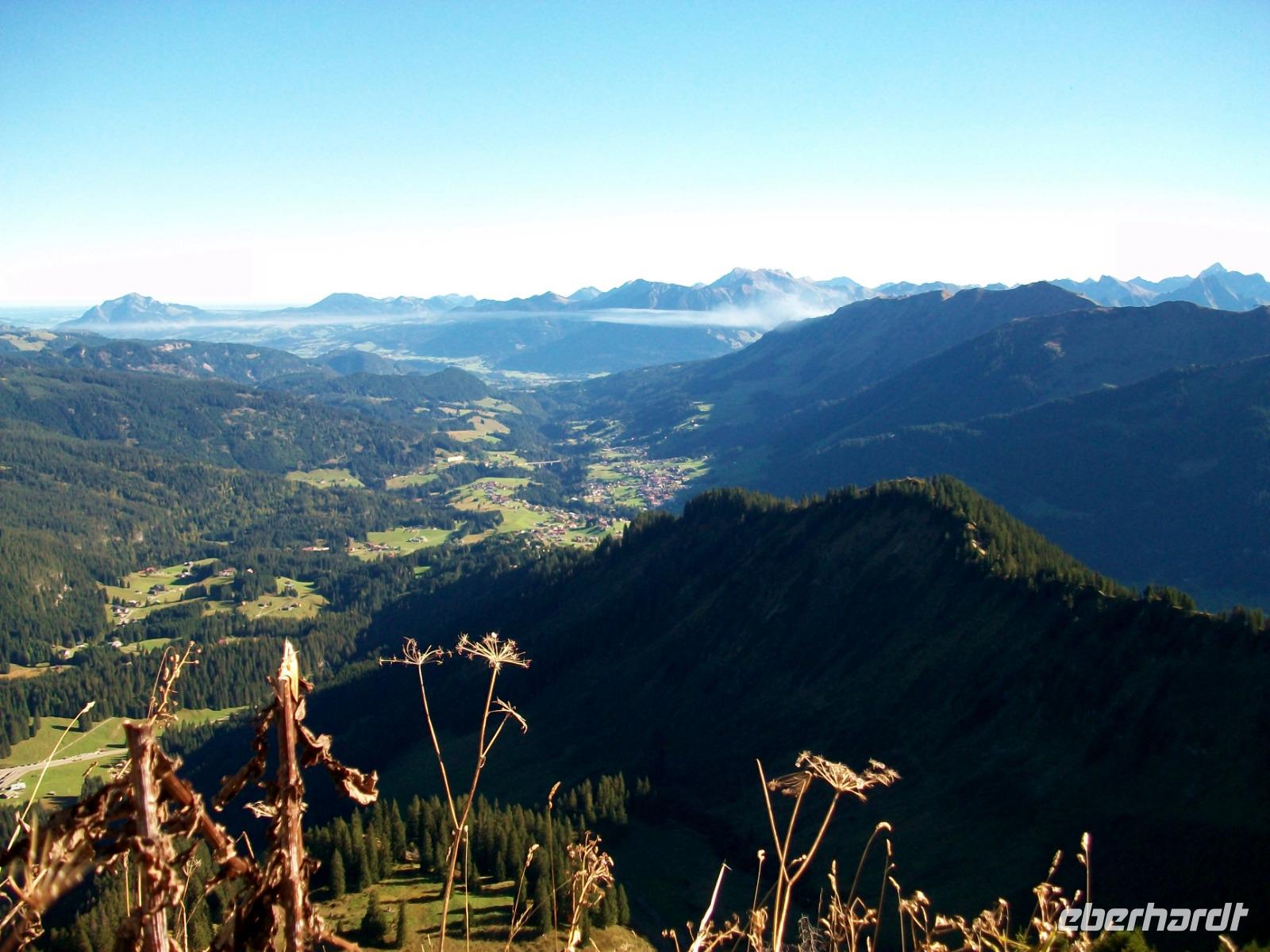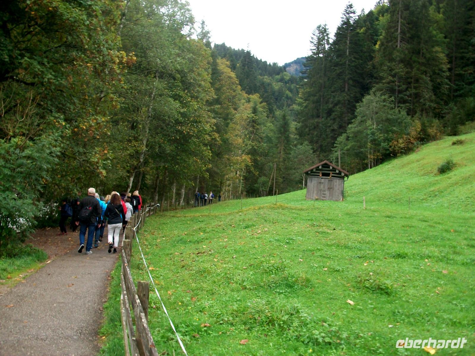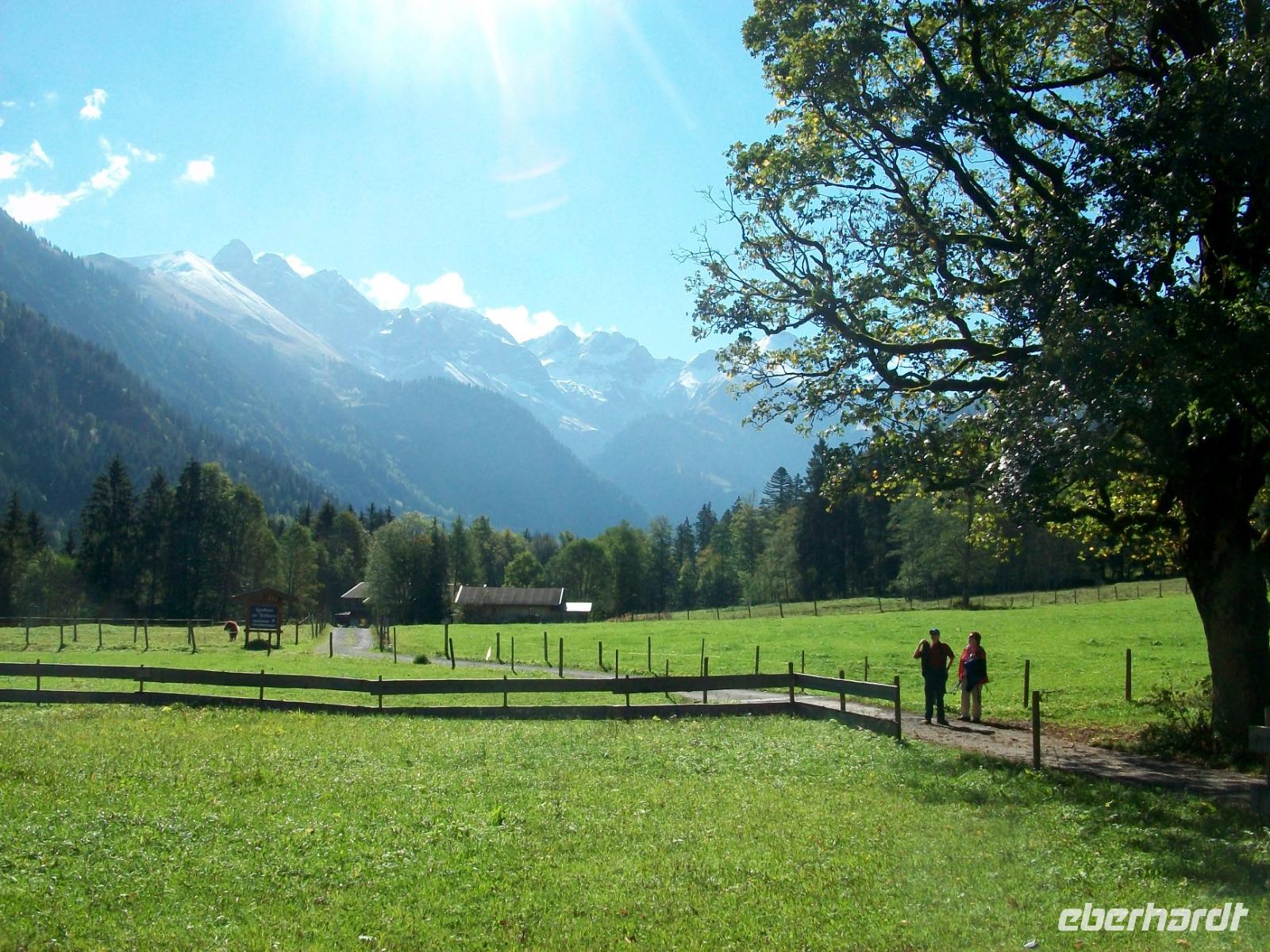 22.9.2018. Der Sommer will in diesem Jahr nicht weichen. Nach einer recht kurzen Nacht schrillt der Wecker und damit beginnt der schöne Urlaub in den Alpen. Doch zunächst geht es zur Abfahrtsstelle des Busses der uns schon einmal durch einige schöne Ecken der Heimat bringt. Als die Sonne aufgegangen ist sehen wir den Kamm des Erzgebirges und durcheilen bald die grünen Erhebungen Frankens, schon hier ein kleiner Vorgeschmack auf die Impressionen der nächsten Tage.Vorbei an Ulm, wir sehen auch einmal kurz den Turm des Münsters, gelangen wir hinter Memmingen in das Allgäu. Ganz im Hintergrund sind dann schon die Alpen zu sehen die, eine lange Kette bildend, schroff emporsteigen. Bald verlassen wir die Autobahn und in diesem leicht welligen Gebiet zeigen sich uns schon all die Naturschönheiten für die das Allgäu so bekannt ist. Saftig - grüne Wiesen auf denen ganz gemütlich die Kühe grasen, schöne, gepflegte Häuser und über allem ist ein blauer Himmel gespannt welchen nur zarte weiße Wolken zieren. Und der Sommer ist auch hier noch nicht gewichen; das Thermometer zeigt über 25° als wir in das Kleinwalsertal einschwenken und wenig später vor unserem Hotel anlagen. Hier werden wir von Doreen ganz herzlich empfangen und, nachdem wir die Zimmer bezogen haben, genehmigen wir uns einen ersten gemütlichen Spaziergang im beeindruckenden Reich der Berge. Zum Abendessen ist dann unsere Gruppe endgültig komplett und muntere Gespräche lassen uns einander kennenlernen.
