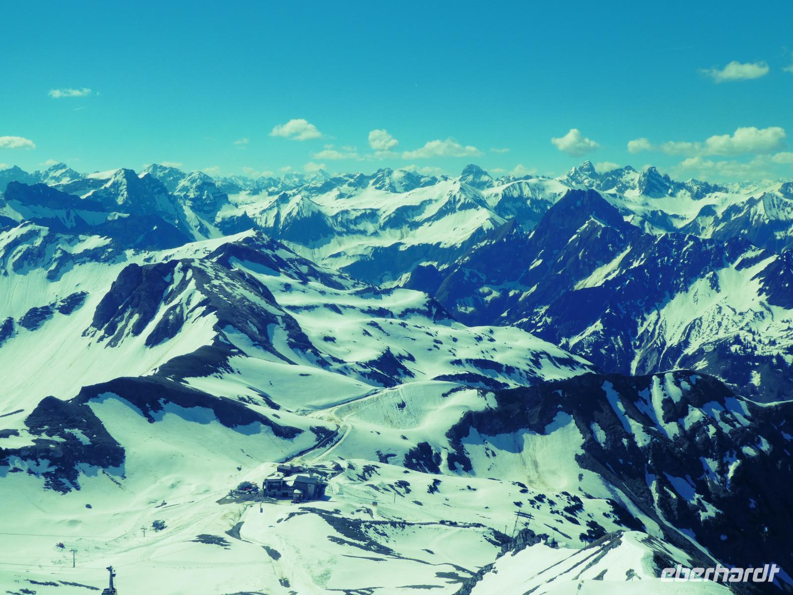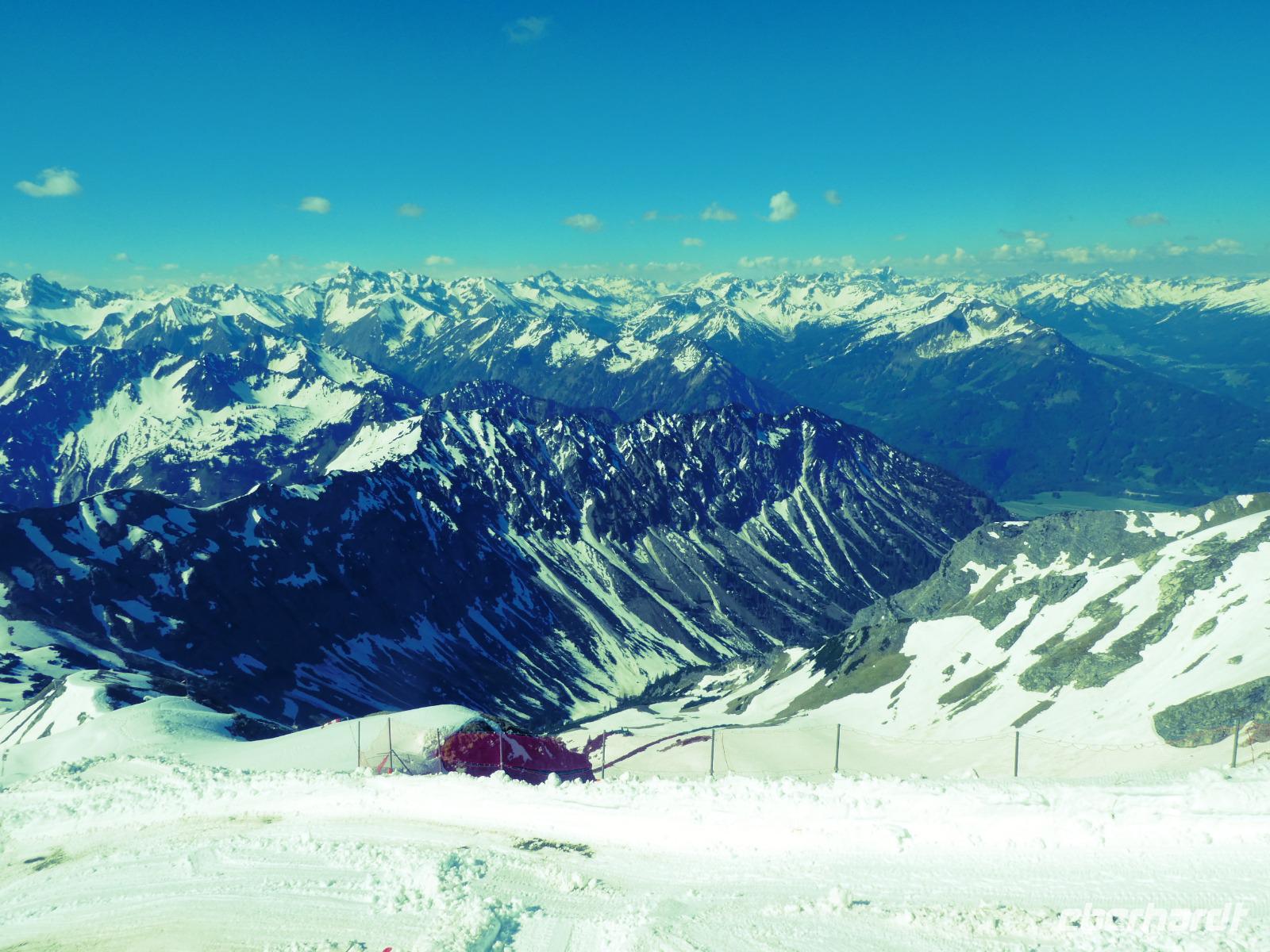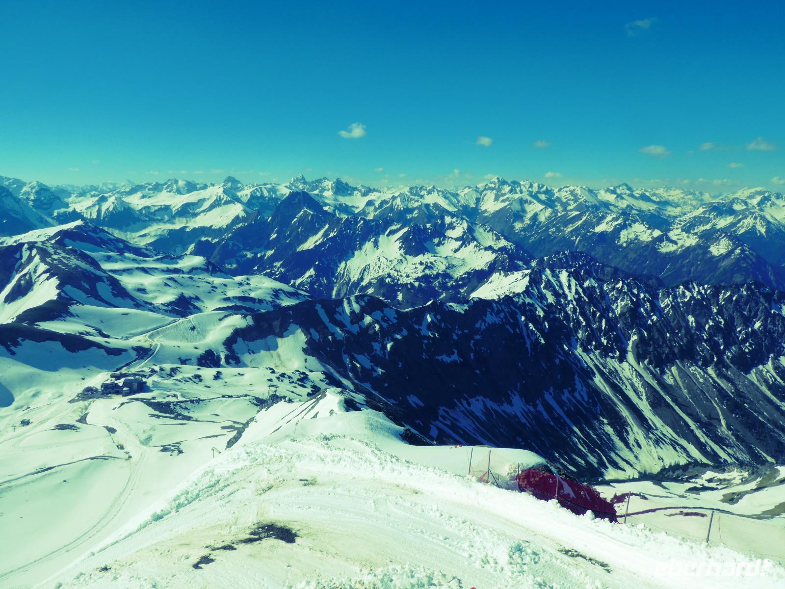 Auf dem Weg zum Fellhorn besuchten wir die Heini Klopfer Skiflugschanze. Sie ist die größte und neuste Schanze in Europa. Wir entschieden uns für die Auffahrt zur Schanze. Ein Fahrstuhl brachte uns hinauf zum Schanzenkopf und von dort erreichten wir mit einem Lift den Absprungturm. Uns erwartete ein schöner Blick auf den Freibergsee. Es ist schon erstaunlich wo die Skiflieger abspringen obwohl Sie den Aufsprunghang gar nicht sehen. Durch das Stillachtal erreichten wir die Fellhornbahn. Am Gipfel waren die Wege wegen dem Schnee noch gesperrt. So auch der Wanderweg zur Kanzlerwand. Nur der Weg zum Gipfelkreuz war frei. Nach unserem Aufenthalt fuhren wir zurück in das Kleinwalsertal zur Kanzelwand. Auch dort brachten uns die Gondeln hinauf zum Gipfel. Wir nutzen die Zeit für einen Spaziergang oder genossen die Aussicht in die Bergwelt und das Kleinwalsertal beim Kaffee trinken.
