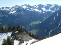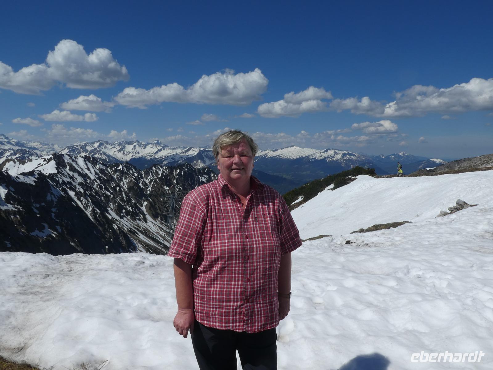 Auf nach Mittelberg zum Walmerdinger Horn. Bequem mit der Gondel erreichten wir die Bergstation. Auch heute war schönes Wetter doch der Wind blies schon heftig. Wir genossen den schönen Blick in das Kleinwalsertal, die umliegende Bergwelt und auf den höchsten Berg den großen Witterstein. Einige Gäste nutzten die Gelegenheit zum Gipfelkreuz zu laufen. Da auf dem Weg dahin auch noch viel Schnee lag blühten die Alpenblumen noch nicht. Den weiteren Tagesverlauf konnte jeder selbst gestalten. So fuhren Gäste mit dem Zafernalift zur Sonna-Alp und kehrten ein. Andere Gäste nutzten die Gondel zum Söllereck und kehrten in die Alm oder in den Berghof ein. Auch der schöne Panoramaweg nach Rietzlern wurde genutzt. Noch ein letztes leckeres Abendessen im Hotel und unsere Reise neigte sich dem Ende zu.