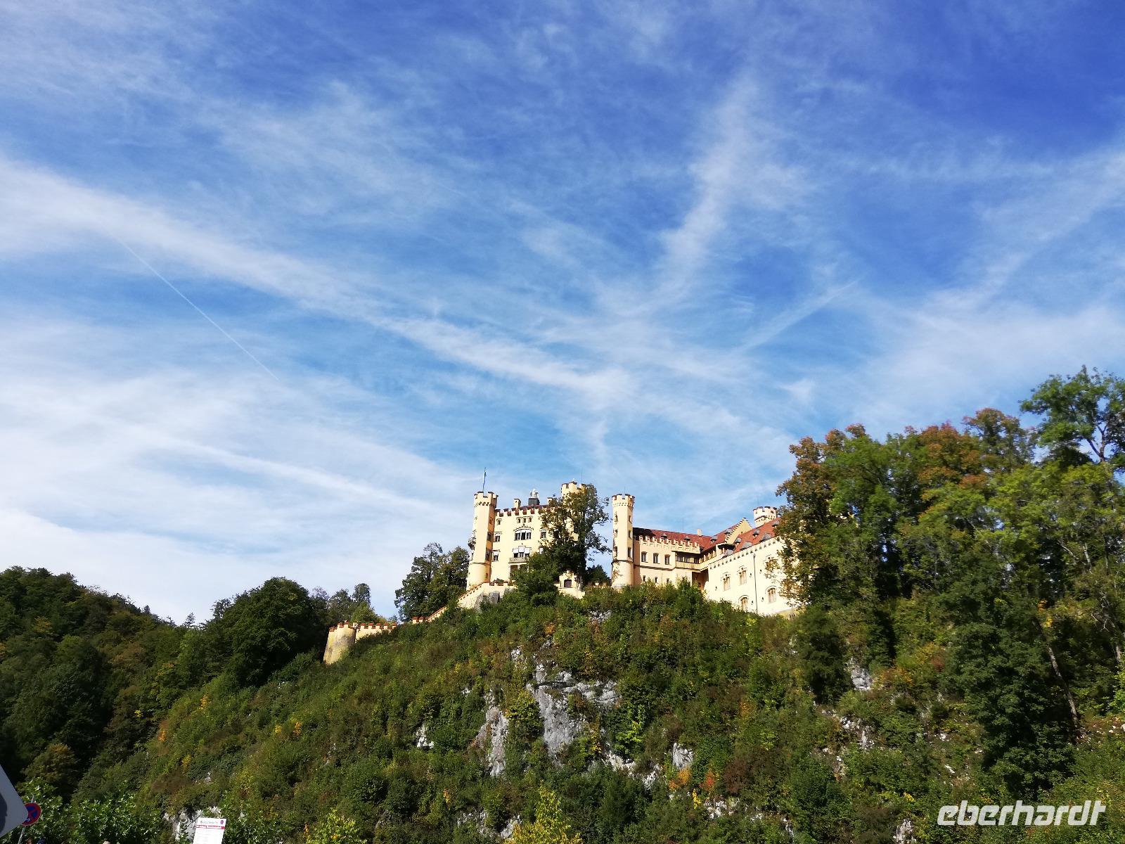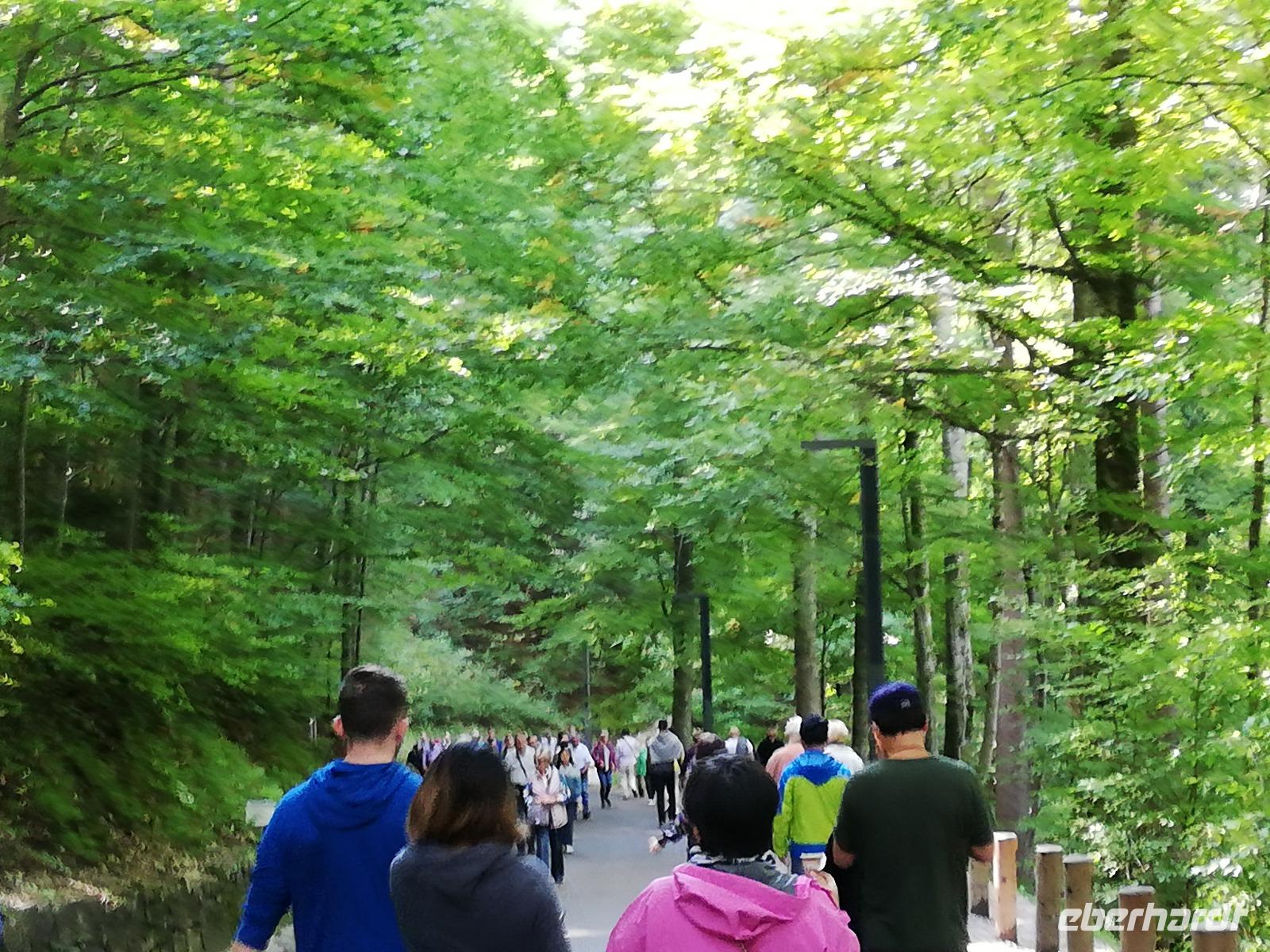 Nach dem gestrigen verregneten Tag erleben wir heute die Sonne. Auf dem Programm steht heute Kultur und Geschichte. Wir fahren entlang der Autobahn an Kempten vorbei nach Füssen und weiter nach Schwangau. Von weitem sind schon die Schlösser Neuschwanstein und Hohenschwangau zu erkennen. Mit unserem Bus fahren wir bis zum Parkplatz. 40 Minuten Fußweg bis zum Schloss Neuschwanstein müssen wir planen. Einige entscheiden sich für einen Bustransfer .