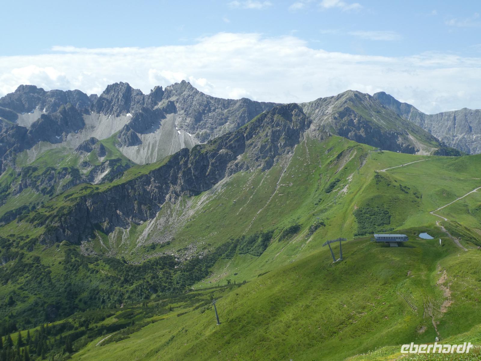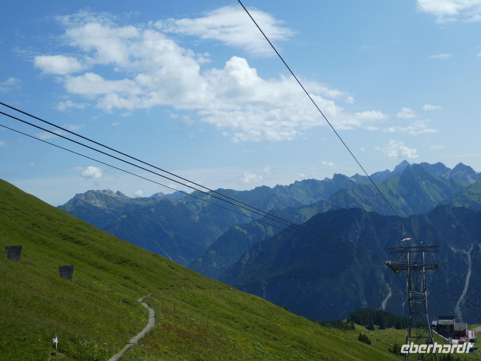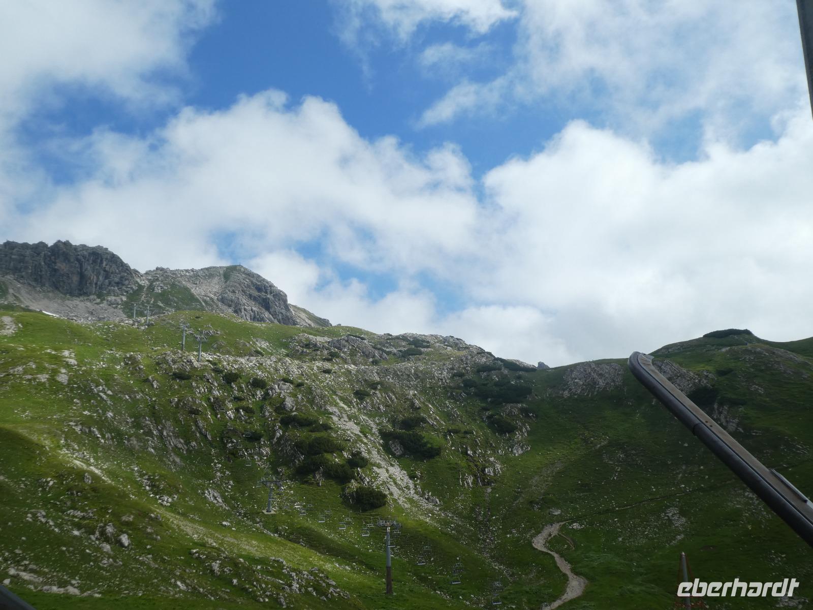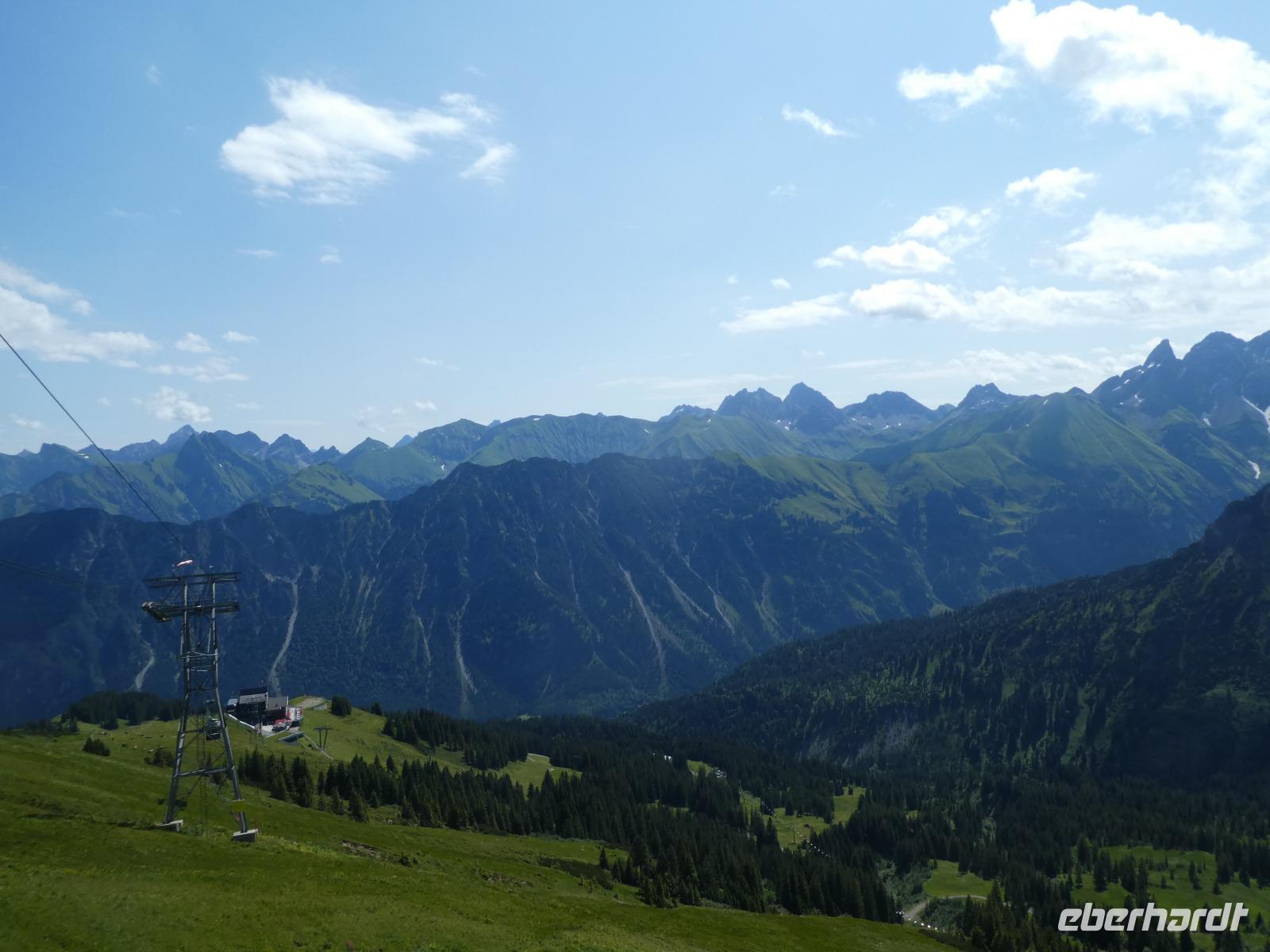 Am Morgen war in Mittelberg das Walmerdinger Horn unser Ziel. Nach etwas Wartezeit an der Gondel ging es hinauf. Auch hier ließen wir die Blicke schweifen in das Wildental und auf den Widderstein. Wer Lust hatte spazierte entlang des Alpengarten zum Gipfel oder fuhr mit dem Fahrstuhl zum Aussichtspunkt. Unser nächstes Ziel war das Söllereck. Erst dieses Jahr wurde die neue Kabinenbahn eröffnet. Vom Parkplatz erreicht man ganz bequem die Talstation. Wir schwebten nach oben und einige Gäste kehrten im Restaurant ein und genossen die süßen Köstlichkeiten wie den Kaiserschmarn. Die anderen wanderten auf dem Höhenweg nach Rietzler mit immer wieder schönen Aussichten auf die Berge des Kleinwalsertals. Im Bergstübel legten wir einen Stopp ein, um uns zu stärken. Nun ging es etwas steil bergab, bevor wir Rietzlern erreichten. Eine schöne Wanderung.