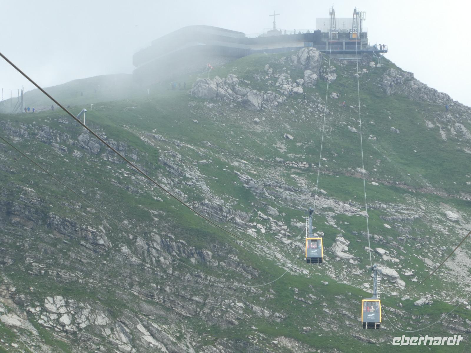 Heute sollte der schönste Tag werden die Sonne schien schon am Morgen. Also auf zum Nebelhorn. Auch die Gondeln zur Mittelstation wurden dieses Jahr neu eröffnet. So schwebten wir über die Wohnhäuser und vorbei an den Sprungschanzen. Mit der großen Gondel ging es ganz nach oben. Doch das Nebelhorn machte seinem Namen alle Ehre. Wir standen im Nebel. Doch der Nebel löste sich immer wieder kurz auf so dass wir doch einige Blicke erhaschen konnten. An der Mittelstadion schien schon wieder die Sonne und so konnte man den Gleitschirmfliegern beim Start zuschauen. Noch ein Bummel durch Obersdorf und wir fuhren in das Stillachtal zur Heini Klopfer Skiflugschanze. Nach einem Foto Stopp gaben wir den Wanderen die Möglichkeit durch die Breitachklamm zu wandern. Der Einstieg befindet sich in Tiefenbach. Seit 1905 ist sie für die Öffentlichkeit begehbar. Immer wieder eröffnen sich neue Einblicke in die Klamm. Das Wasser rauscht hindurch und an einigen Stellen wird es auch etwas feucht. Aber alle erreichten zufrieden die Walzerschanz und konnten mit dem Bus wieder ins Kleinwalsertal fahren.