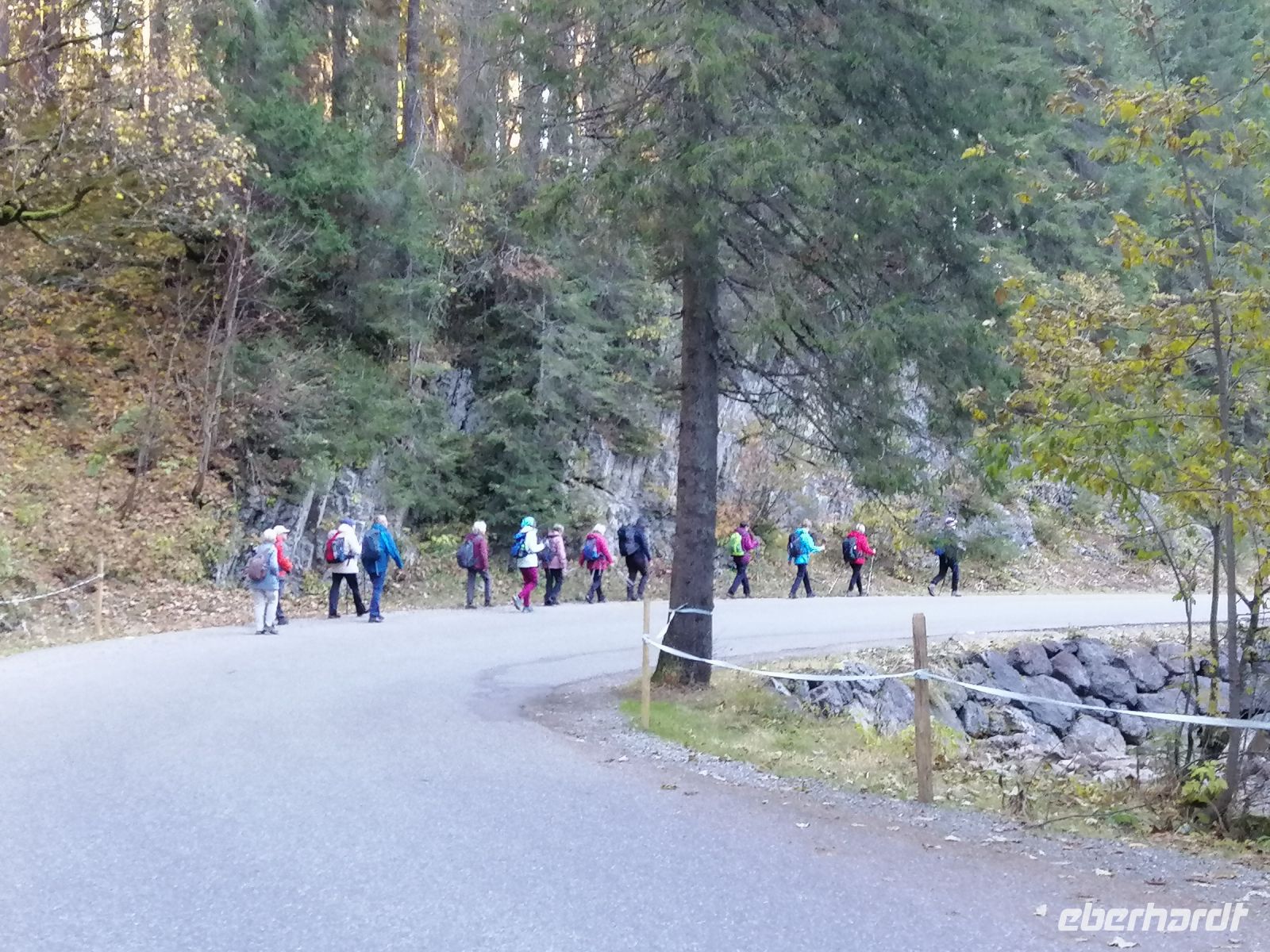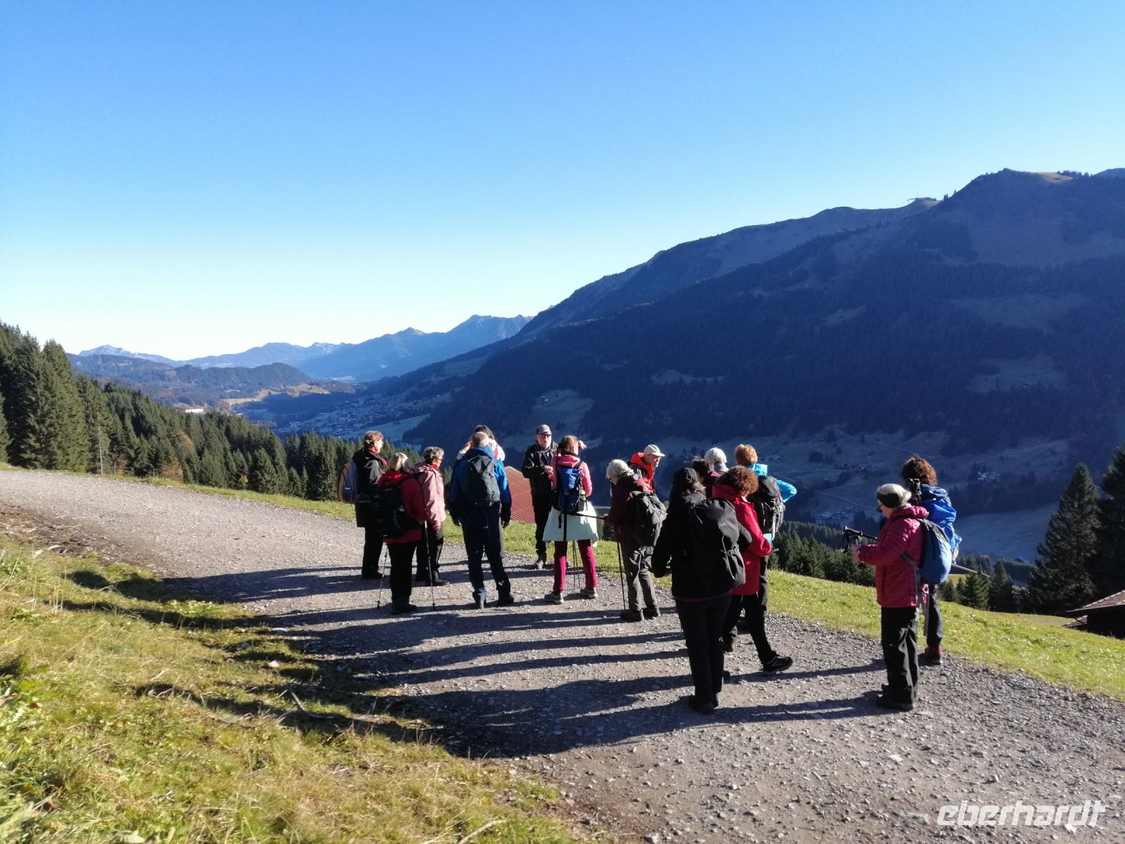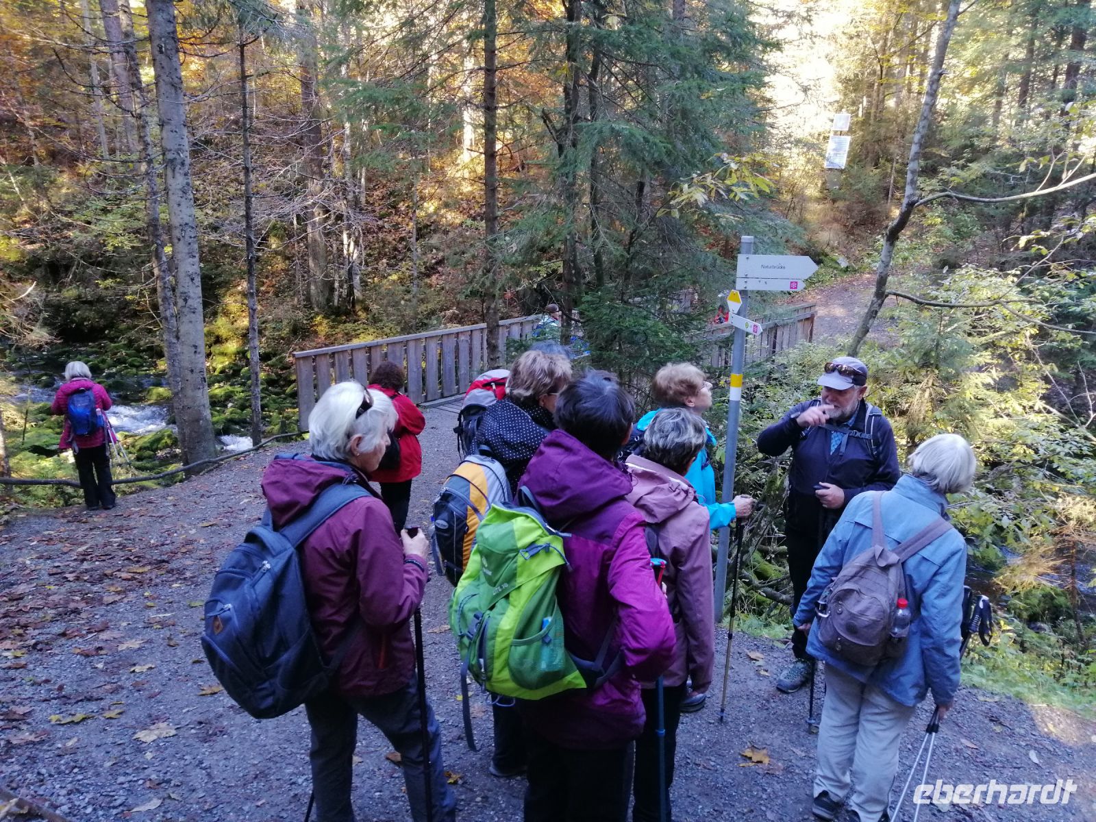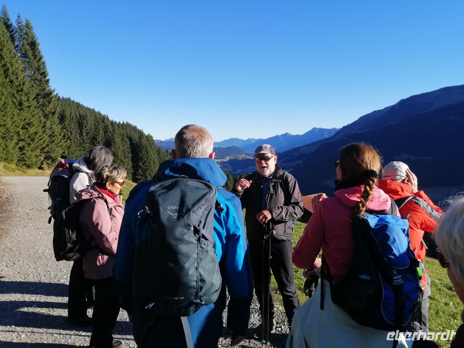 Heute freuen wir uns bei bestem Wetter auf eine Wanderung auf dem Panoramaweg durch das Schwarzwassertal Richtung Riezlern. Nach dem leckeren Frühstück trafen wir uns vor dem Hotel mit unserem Bergführer Charlie. Wir gingen zu Fuß zum Sessellift und fuhren (200 Höhenmeter) zu Sonna-Alp. Heute ist der letzte Arbeitstag dieser Seilbahn: wir haben Glück! An der Sonna-Alp zeigte uns Charlie das wunderschöne Berg-Panorama des Kleinwalsertals und erzählte über die Geschichte dieser Region. Wir bekamen Informationen nicht nur über die Einwohnerzahl von Mittelberg (ca. 5.000 Menschen) und die Bettenanzahl in der Region (12.000 Betten), sondern erfuhren wie viele Übernachtungen im Jahr hier stattfinden (1,7 Mio.), bekamen Informationen über das Steuersystem und das Bankwesen im Kleinwalsertal. Charlie informierte uns auch über die Landwirtschaft, den Tourismus und vieles mehr! Danach wanderten wir den wunderschönen Panoramaweg Richtung Schwarzwassertal. Teilweise war der Wanderweg sehr steil. Unser Bergführer empfahl uns die Wanderstöcke ohne Schlaufen zu halten, um Verletzungen zu vermeiden. Eine sehr gute Empfehlung! Unterwegs schauten wir uns verschiedene Sehenswürdigkeiten an: eine Schlucht im Schwarzwassertal mit beeindruckenden Kessellöchern, eine Naturbrücke aus Kalkstein: ein über das Bachbett gespannter Brückenbogen mit einer Spannweite von 5 m. Charlie erläuterte uns die Bedeutung der Wegmarkierungen in Österreich. Viele Wanderwege sind nicht nur im Sommer oder Herbst begehbar, sondern werden auch im Winter präpariert und geräumt. Obwohl wir sehr schönes Wetter hatten, war es im Schatten des Waldes teilweise sehr kühl. Nach einer gemütlichen Picknick-Pause, erreichte unsere sportliche Wandergruppe Riezlern gegen Mittag. In einem urigen Kaffee, direkt gegenüber der Kanzelwandbahn, hatten wir eine Bier-, Kaffee- und Kuchen-Pause. Da das Wetter sehr schön war, beschloss die Gruppe mit der Kanzelwandbahn hochzufahren und das wunderschöne Bergpanorama auf der Kanzelwand zu genießen. Oben angekommen wurden wir mit fantastischen Aussichten belohnt. Der wunderschöne Tag endete gegen 16 Uhr im Hotel. Es gab noch genug Zeit zum Ausruhen oder für die Sauna. Bei unserem Abendessen wurden wir mit amerikanischen Spezialitäten verwöhnt.