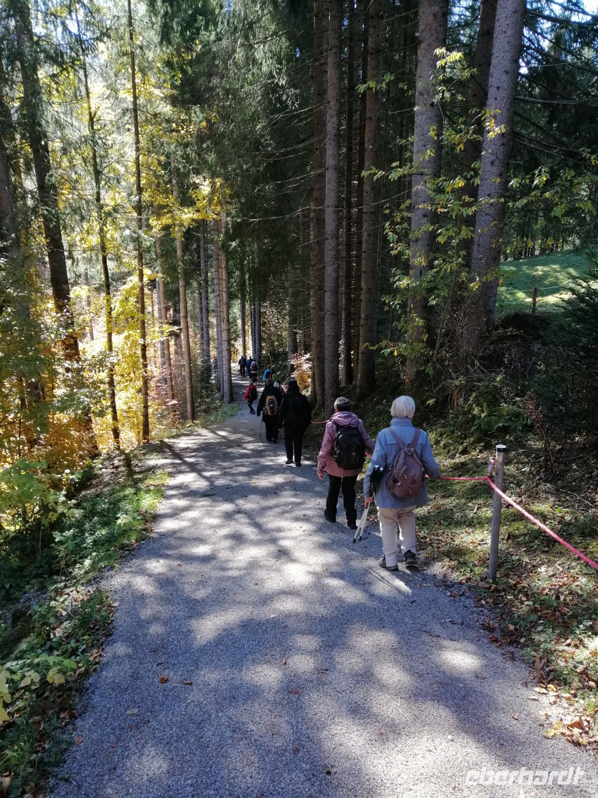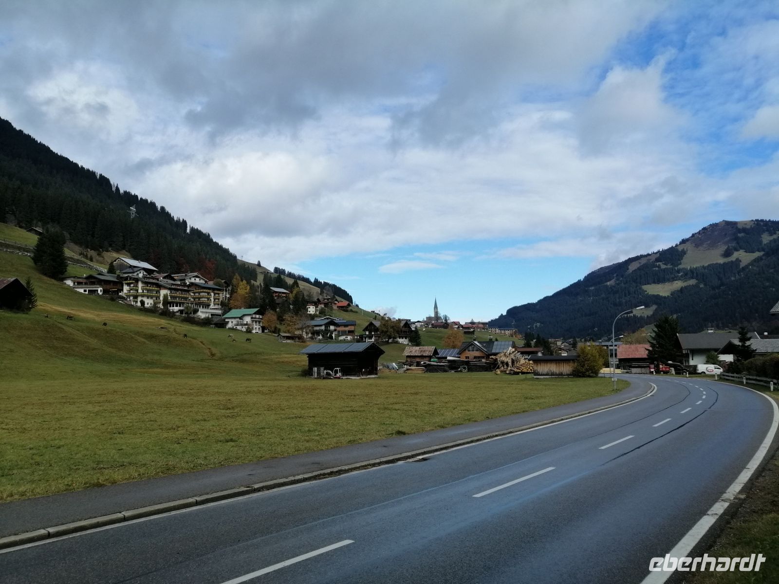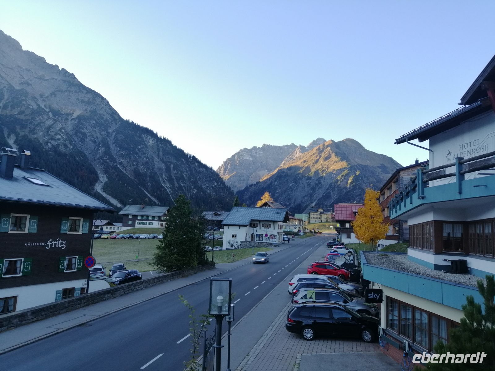 Heute freuen wir uns bei bestem Wetter auf eine Wanderung auf dem Panoramaweg durch das Schwarzwassertal Richtung Riezlern. Nach dem leckeren Frühstück trafen wir uns vor dem Hotel mit unserem Bergführer Charlie. Wir gingen zu Fuß zum Sessellift und fuhren (200 Höhenmeter) zu Sonna-Alp. Heute ist der letzte Arbeitstag dieser Seilbahn: wir haben Glück! An der Sonna-Alp zeigte uns Charlie das wunderschöne Berg-Panorama des Kleinwalsertals und erzählte über die Geschichte dieser Region. Wir bekamen Informationen nicht nur über die Einwohnerzahl von Mittelberg (ca. 5.000 Menschen) und die Bettenanzahl in der Region (12.000 Betten), sondern erfuhren wie viele Übernachtungen im Jahr hier stattfinden (1,7 Mio.), bekamen Informationen über das Steuersystem und das Bankwesen im Kleinwalsertal. Charlie informierte uns auch über die Landwirtschaft, den Tourismus und vieles mehr! Danach wanderten wir den wunderschönen Panoramaweg Richtung Schwarzwassertal. Teilweise war der Wanderweg sehr steil. Unser Bergführer empfahl uns die Wanderstöcke ohne Schlaufen zu halten, um Verletzungen zu vermeiden. Eine sehr gute Empfehlung! Unterwegs schauten wir uns verschiedene Sehenswürdigkeiten an: eine Schlucht im Schwarzwassertal mit beeindruckenden Kessellöchern, eine Naturbrücke aus Kalkstein: ein über das Bachbett gespannter Brückenbogen mit einer Spannweite von 5 m. Charlie erläuterte uns die Bedeutung der Wegmarkierungen in Österreich. Viele Wanderwege sind nicht nur im Sommer oder Herbst begehbar, sondern werden auch im Winter präpariert und geräumt. Obwohl wir sehr schönes Wetter hatten, war es im Schatten des Waldes teilweise sehr kühl. Nach einer gemütlichen Picknick-Pause, erreichte unsere sportliche Wandergruppe Riezlern gegen Mittag. In einem urigen Kaffee, direkt gegenüber der Kanzelwandbahn, hatten wir eine Bier-, Kaffee- und Kuchen-Pause. Da das Wetter sehr schön war, beschloss die Gruppe mit der Kanzelwandbahn hochzufahren und das wunderschöne Bergpanorama auf der Kanzelwand zu genießen. Oben angekommen wurden wir mit fantastischen Aussichten belohnt. Der wunderschöne Tag endete gegen 16 Uhr im Hotel. Es gab noch genug Zeit zum Ausruhen oder für die Sauna. Bei unserem Abendessen wurden wir mit amerikanischen Spezialitäten verwöhnt.