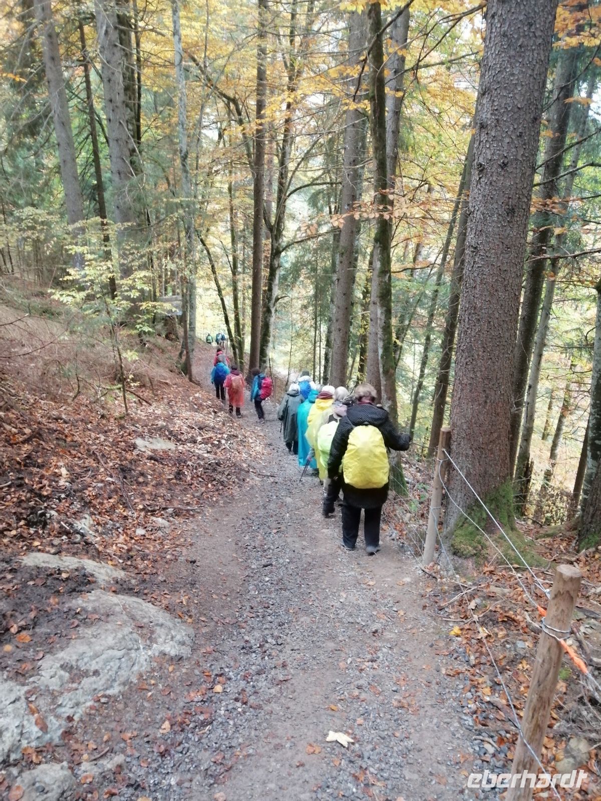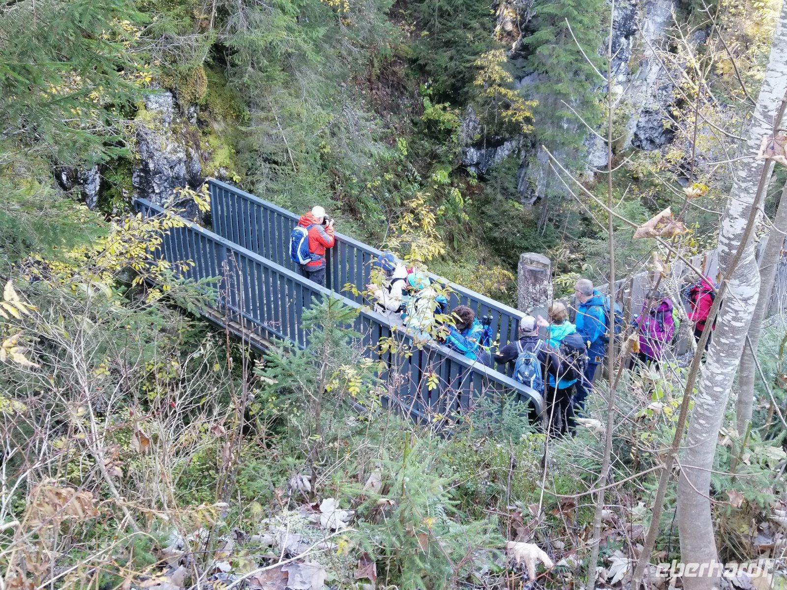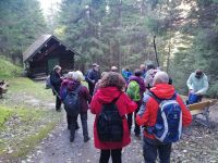 Heute haben wir zwei besondere Höhepunkte in unserem Wander-Kalender: Besichtigung der Breitachklamm und die Wanderung durch das Gemsteltal! Und obwohl es heute draußen ein bisschen feucht ist, halten wir an unseren Wanderzielen fest und fahren mit dem Walserbus direkt vom Hotel ab. Unsere Wanderung zur Breitachklamm beginnt direkt an der deutsch-österreichischen Grenze: an der Walserschanze. Hier erzählte uns Charlie über die Funktion dieser Schanz-Anlage, die ab 1632 zur Verteidigung gegen Schweden und Franzosen diente. Der anspruchsvolle Wanderweg beschenkte uns mit faszinierenden Blicken in die Breitachklamm von oben! Seit 1905 ist die Breitachklamm begehbar. Sie wurde bereits von 24 Mio. Besuchern durchwandert. Charlie informierte uns über das Hochwasser im August 2005 und über die dadurch entstandenen Schäden. Fast ein Jahr lang war die Klamm für die Besucher danach gesperrt. Mit großer Begeisterung und Bewunderung erkundeten wir dieses Naturwunder! Auch das Profil des Indianerkopfs finden wir hier:-) Anschließend fuhren wir mit dem Walserbus bis zur Haltestelle "Gemse" und starteten unsere Wanderung ins Gemsteltal. Das Wetter spielte inzwischen mit und der leichte Anstieg ins Tal bereitete uns keine Probleme. Wir wanderten bis zum Ende des Tals und kehrten in die Obere Gemstelhütte (1.692 m) ein. Hier wurden wir ganz herzlich von Mathias und Sabine Fritz empfangen! Es gab verschiedene ganz leckere Kuchen, besonders gut hat allen der Apfelstrudel geschmeckt! Außerdem hatte Mathias seine Fernrohre auf Steinböcke und Gemsen gerichtet und wir konnten die grasenden Tiere hoch auf den Hängen beobachten! Mathias ist ein Jäger, der ungern schießt! Nach der gemütlichen und stärkenden Pause setzten wir unsere Wanderung fort und stiegen den oberen Weg wieder ins Breitachbachtal ab. Gegen 16 Uhr im Hotel angekommen, hatten wir noch ausreichend Zeit für die Sauna oder für einen Spaziergang durch Mittelberg. Heute Abend, am Nationalfeiertag, wurden wir natürlich mit österreichischen Spezialitäten verwöhnt!