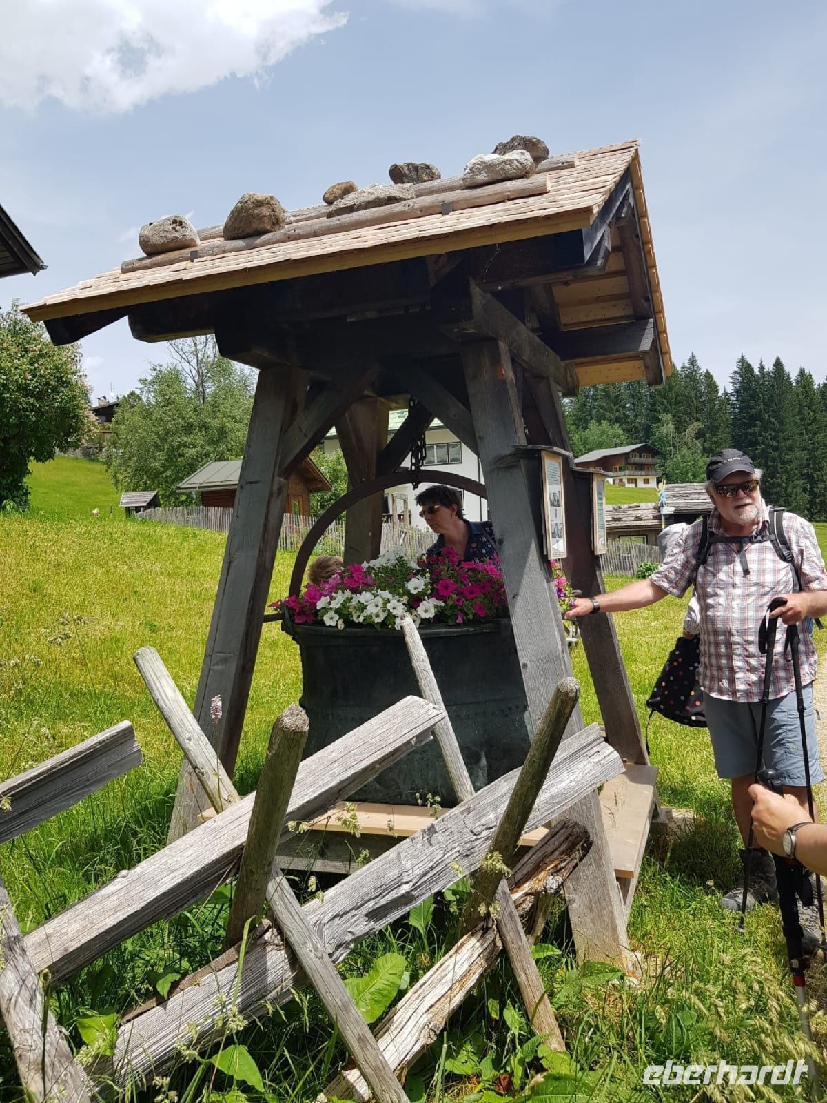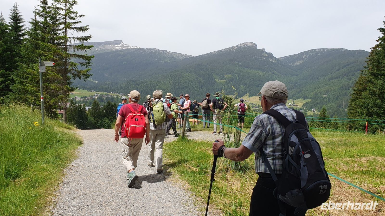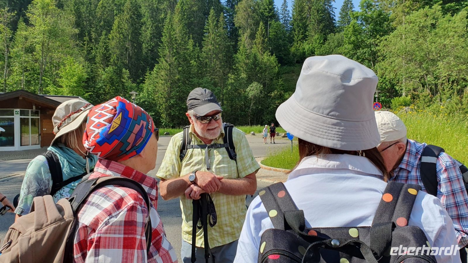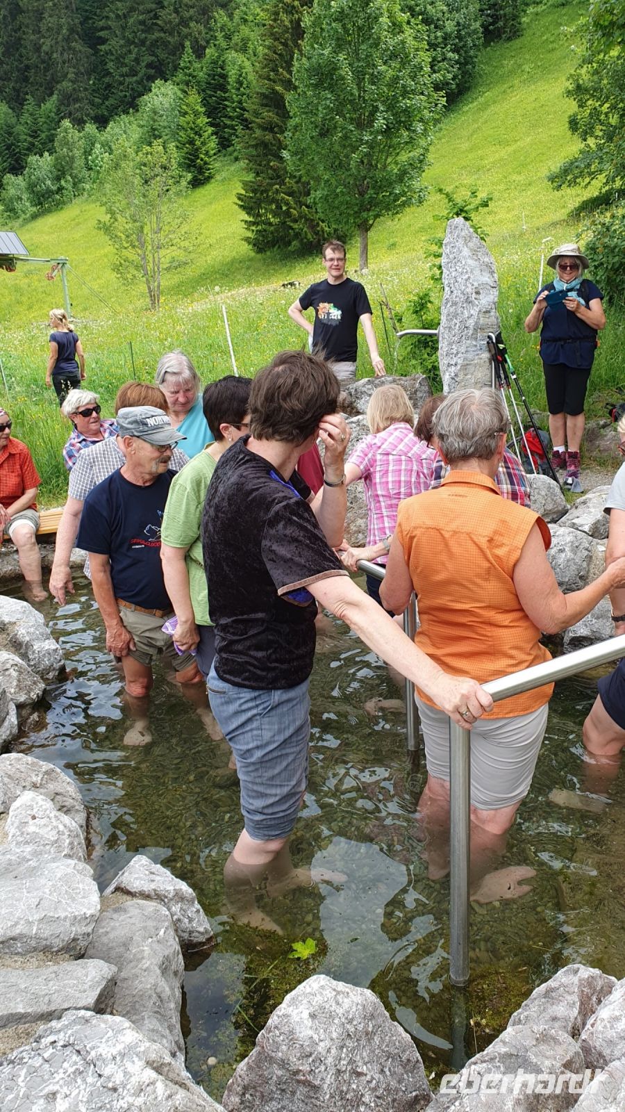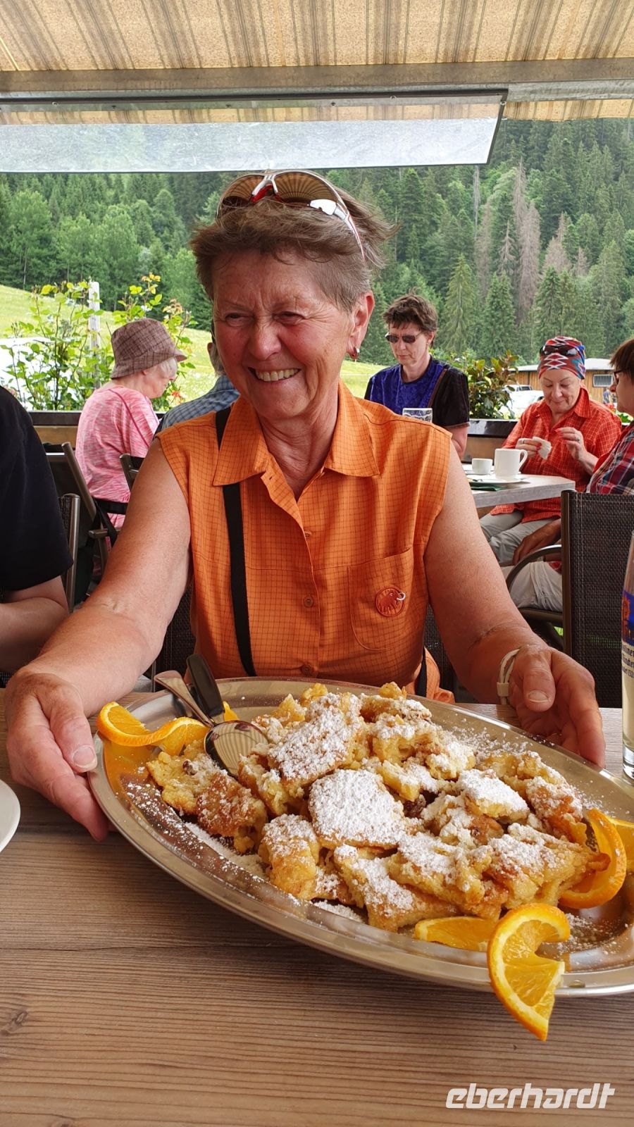 Wir trafen uns auf der Terrasse unseres Hotels und wanderten direkt hinter dem Hotel bergan, durch den Wald und auf dem Panoramaweg nach Hirschegg zur Talstation des Heuberg Sessellifts. Das Terrain oben an der Bergstation kannten wir schon vom Vortag. Aber wir nahmen heute den Weg ins Schöntal, kamen an einer Fortsthütte vorbei und querten schliesslich das Schwarzbachtal. Weiter gings zum Herzsee, der eigens zur Schneeproduktion für die Skipisten am Ifen angelegt wurde. Noch ein kurzes Stück und wir erreichten die Auenhütte, wo wir zu Mittag einkehrten. Besonders lustig war das "Picken" des Kaiserschmarrns von einem Teller für 2 Personen und der Kaiserschmarrn schmeckte vorzüglich. Nun hatten sich alle gestärkt für den weiteren Abstieg immer entlang des Schwarzbachtales. Der nächste Höhepunkt waren die Kessellöcher. Dafür gingen wir zunächst steil bergan und dann über Stufen hinunter zu den Kessellöchern. Der Weg war wunderschön und abwechslungsreich, führte meist im Schatten hoher Bäume und so war die Nachmittagshitze gut zu ertragen. Wir erreichten die Naturbrücke und mussten dafür zunächst steil bergab und drüben auf einer Leiter wieder steil bergan gehen. Es folgte ein Weg entlang des Wiesenrandes und dort zeigte uns Charlie einen echten "Jägerzaun". Wieder im Wald führte unser Weg steil bergab, vorbei an einem großen Wasserfall und kurz vor Riezlern über eine Hängebrücke. Gegen 15 Uhr kamen wir im Ortszentrum von Riezlern an und dort endete unsere gemeinsame Wanderung.