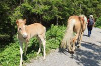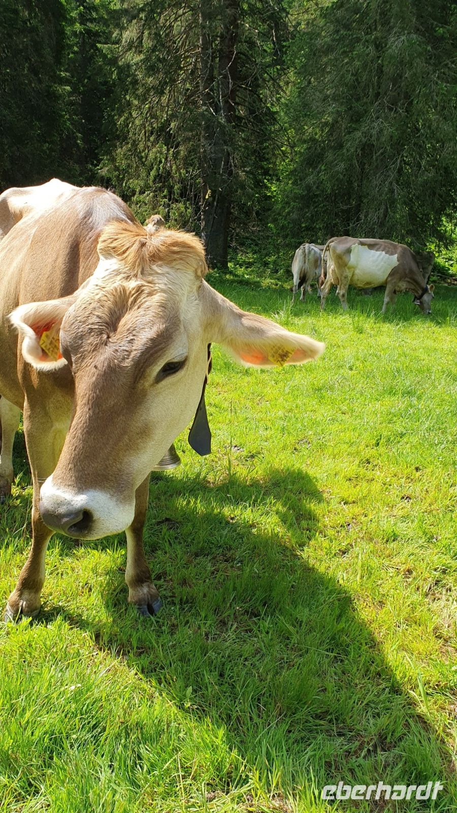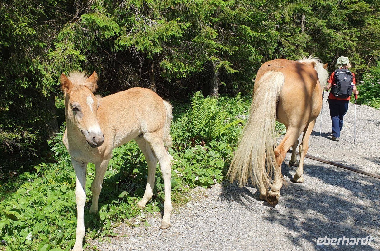 Nach einem ausgezeichneten Frühstück im Hotel lernten wir unseren Wanderführer Charlie kennen und spazierten anschliessend hinunter zur Bushaltestelle an der Breitachbrücke. Der Bus kam verspätet und völlig überfüllt an, öffnete alle Türen und wir fanden alle Platz im Bus. Der Busfahrer hatte viel Spass bei der Arbeit und unterhielt uns Fahrgäste vortrefflich. Manchmal fragte er auch, ob wir die an der Haltestelle wartenden Wanderer noch mitnehmen sollen usw. Nach 20 minütiger Fahrt kamen wir an der Endhaltestelle in Baad an und dort begann auch unsere erste Wanderung. Im Bärgunttal ging es immer bergan mit Blick zum grossen Widderstein bis zur Bärguntalm. Dort hatte die Wirtin Sabine das Sagen und ihr berühmter Käsekuchen und vieles mehr waren schon zum Verzehr fertig. Wir stärkten uns und wanderten dann auf der anderen Talseite auf einem schönen Panoramaweg wieder hinunter nach Baad. Unterwegs begegneten uns Pferde mit Jungtieren und die waren recht zutraulich.