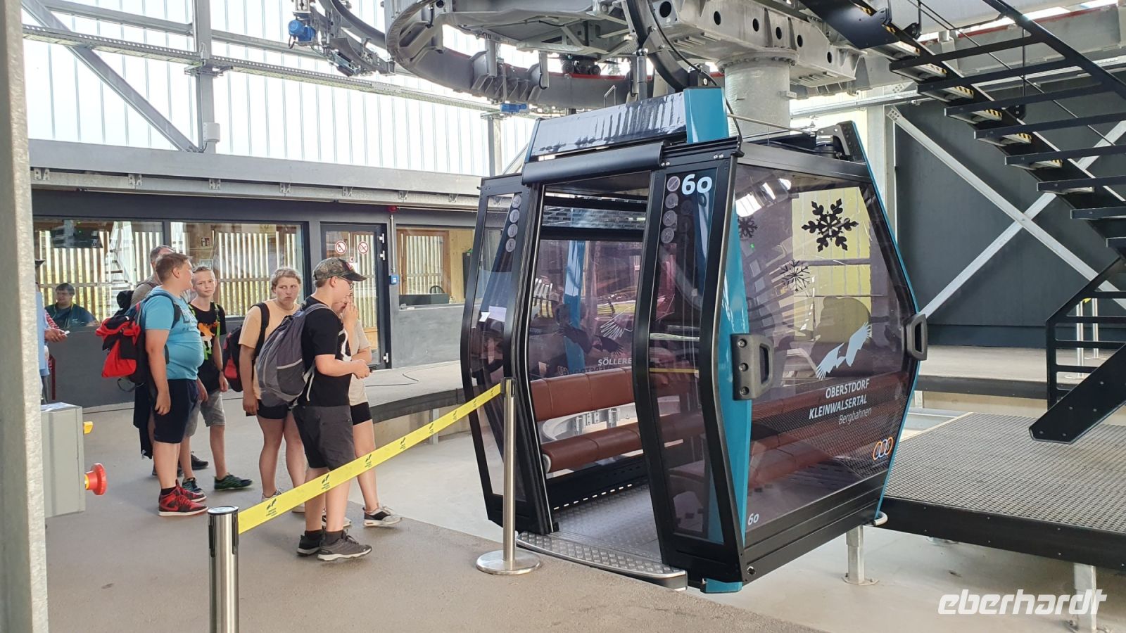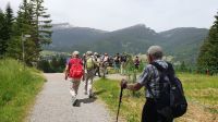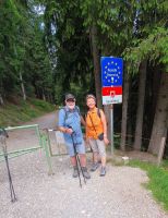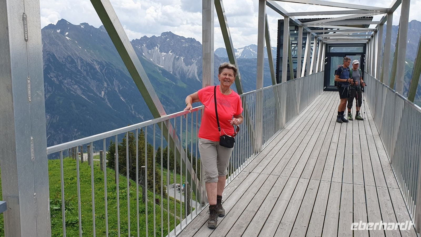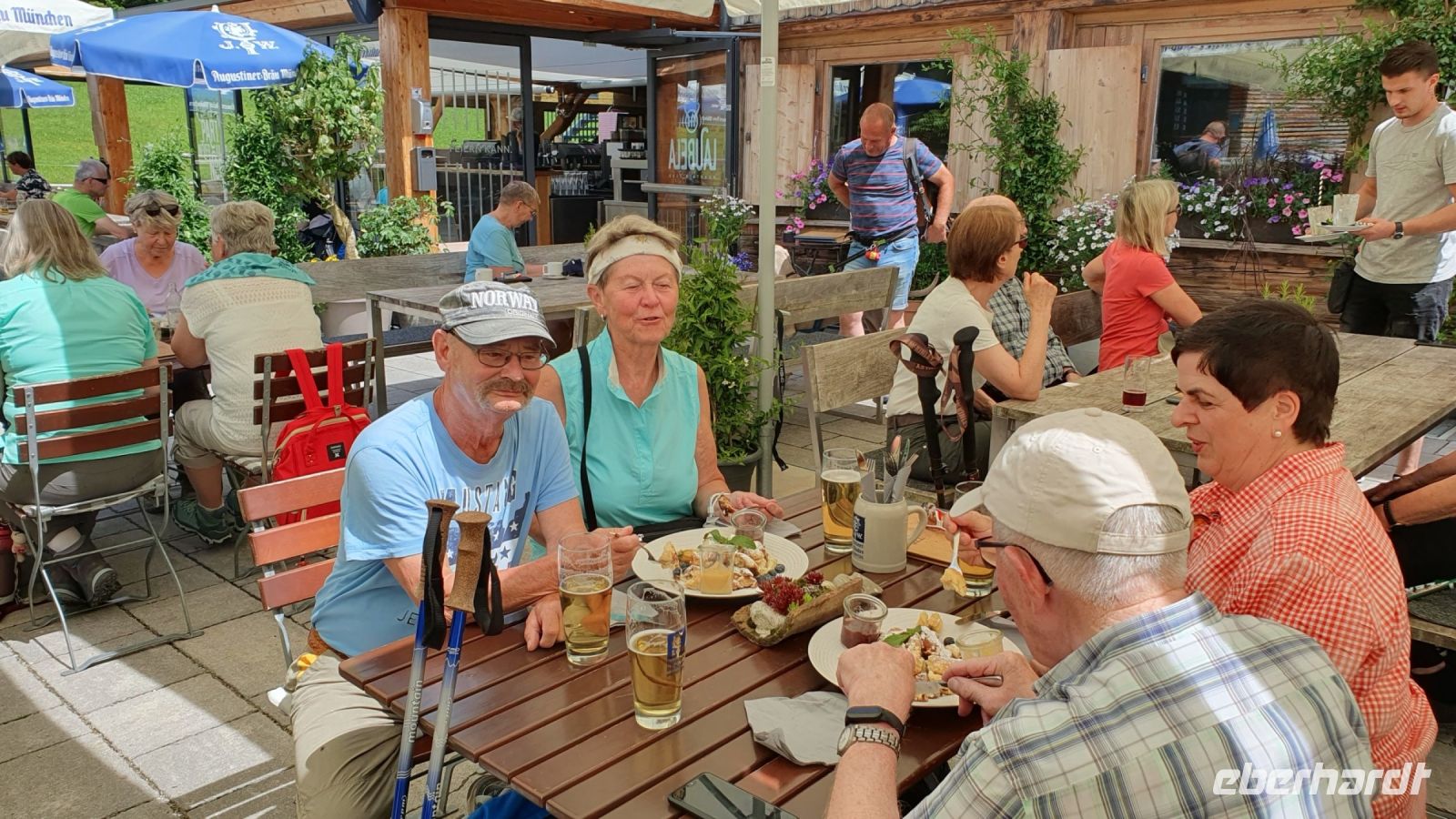 Noch einmal nahmen wir den Bus hinaus aus dem Kleinwalsertal, diesmal aber bis zur Talstation der Söllereckbahn in Deutschland. Die neue Kabinenseilbahn startet jetzt schon direkt unten bei der Strasse und macht dann einen 45 Grad Richtungswechsel hinauf zur Bergstation. Von dort wanderten wir bis zur Alpe Schrattenwang und dann immer leicht bergab auf der "Seniorenautobahn" nach Riezlern. Wir passierten den alten Schlagbaum an der Grenze D - A. Unterwegs machten wir Pause, um uns bei Charlie für die wundervolle Betreuung auf unseren Wanderungen zu bedanken und dazu spendierte ich einen Zirbenschnaps zum Probieren und etwas Süsses . Bald darauf erreichten wir das Bergstüberl und dort gab es zum Abschluss Kaiserschmarren für alle und für 2 Damen eine Suppe. Der Kaiserschmarren wurde pro Tisch auf einer großen Platte serviert und wir durften "Picken" mit dem Luxus, daß diesmal jeder sogar einen Teller dazu bekam. Gut gelaunt wanderten wir weiter zur Steffi Schuster Kneipp Anlage, um unsere Füsse zu kühlen. Nachher ging der Weg steil bergab hinunter nach Riezlern zur Talstation der Kanzelwandbahn und von da schwebten wir hinauf zur Kanzelwand.
