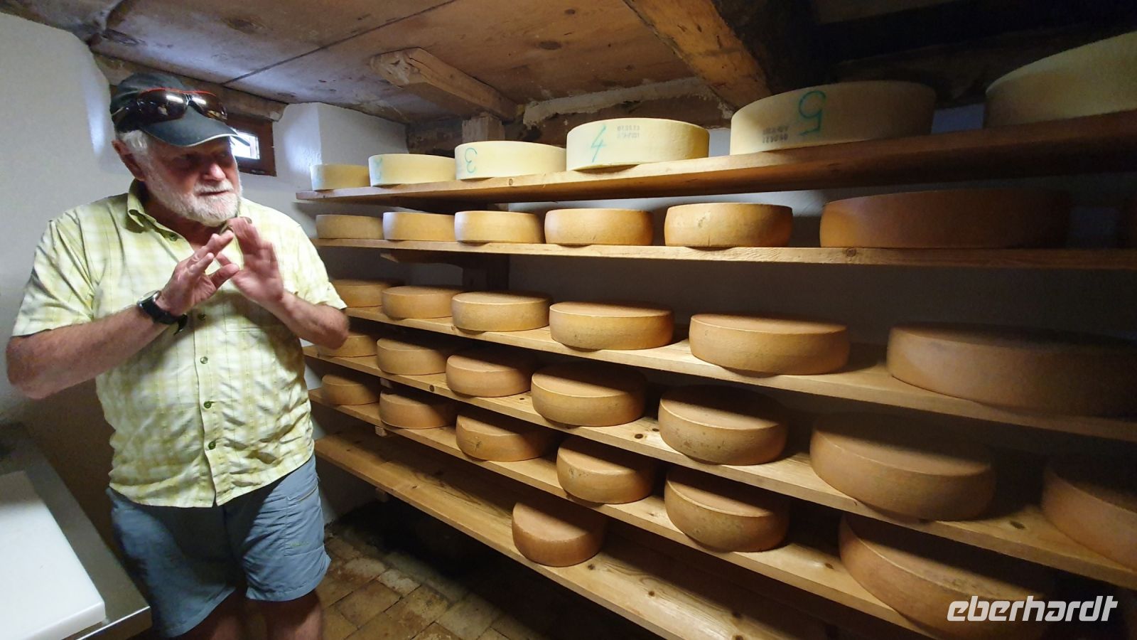 Von Baad nutzten wir wieder den Bus zurück nach Mittelberg bis zur Talstation der Walmedinger Horn Bahn. Wir schwebten fast lautlos hinauf auf 1940 m Höhe und wanderten dann noch 50 Höhenmeter bis zum Gipfelkreuz. Nun gab es verschiedene Optionen. 3 Damen fuhren mit dem Lift wieder zurück nach Mittelberg in der Hoffnung, für die kaputten Wanderschuhe Ersatz zu finden. Alle anderen wanderten steil bergab in Serpentinen bis zur Sturzalpe und kehrten dort auf eine Nachmittagsjause ein. Die Sturzalpe liegt aussichtsreich am Talhang und besonders die Käseteller hatten es uns angetan. Danach konnten wir den Käsekeller besichtigen mit den vielen großen runden Käselaibern. Auf einem wunderschönen Panoramaweg oben am Hang wanderten wir weiter bis zur Bergstation des Zafernalifts und dort nahmen Charlie und einige Gäste den Sessellift runter ins Tal und den Bus zurück zum Hotel. Die ganz Mutigen wanderten mit mir weiter bis zu unserem Hotel immer bergab. Das stetige Bergabgehen spürten wir abends in den Oberschenkeln und Waden !