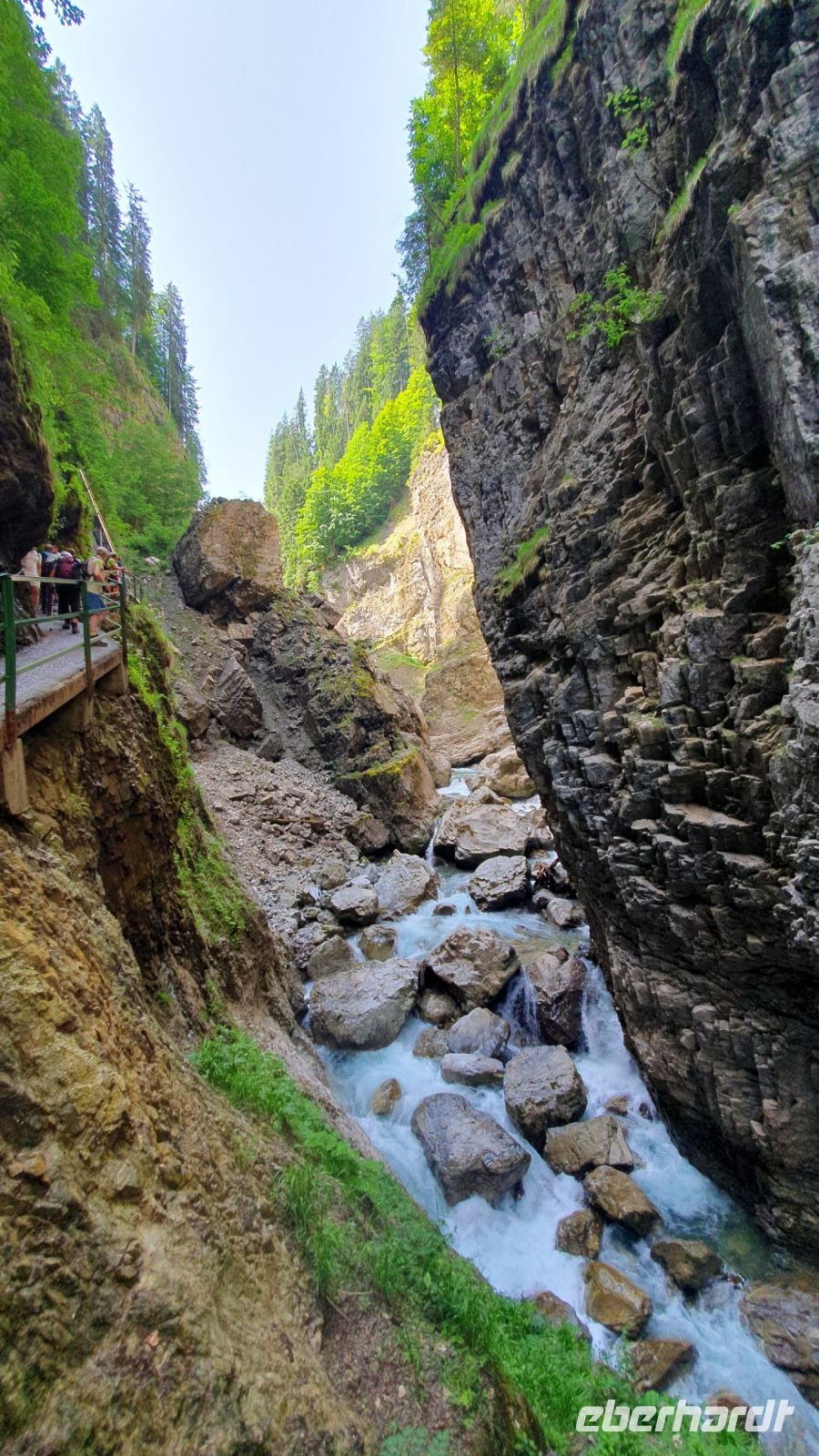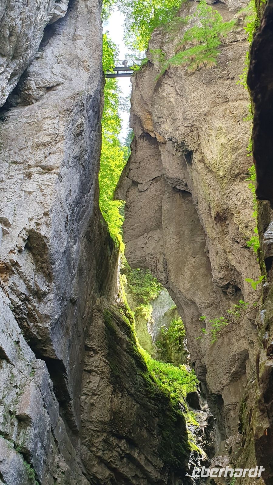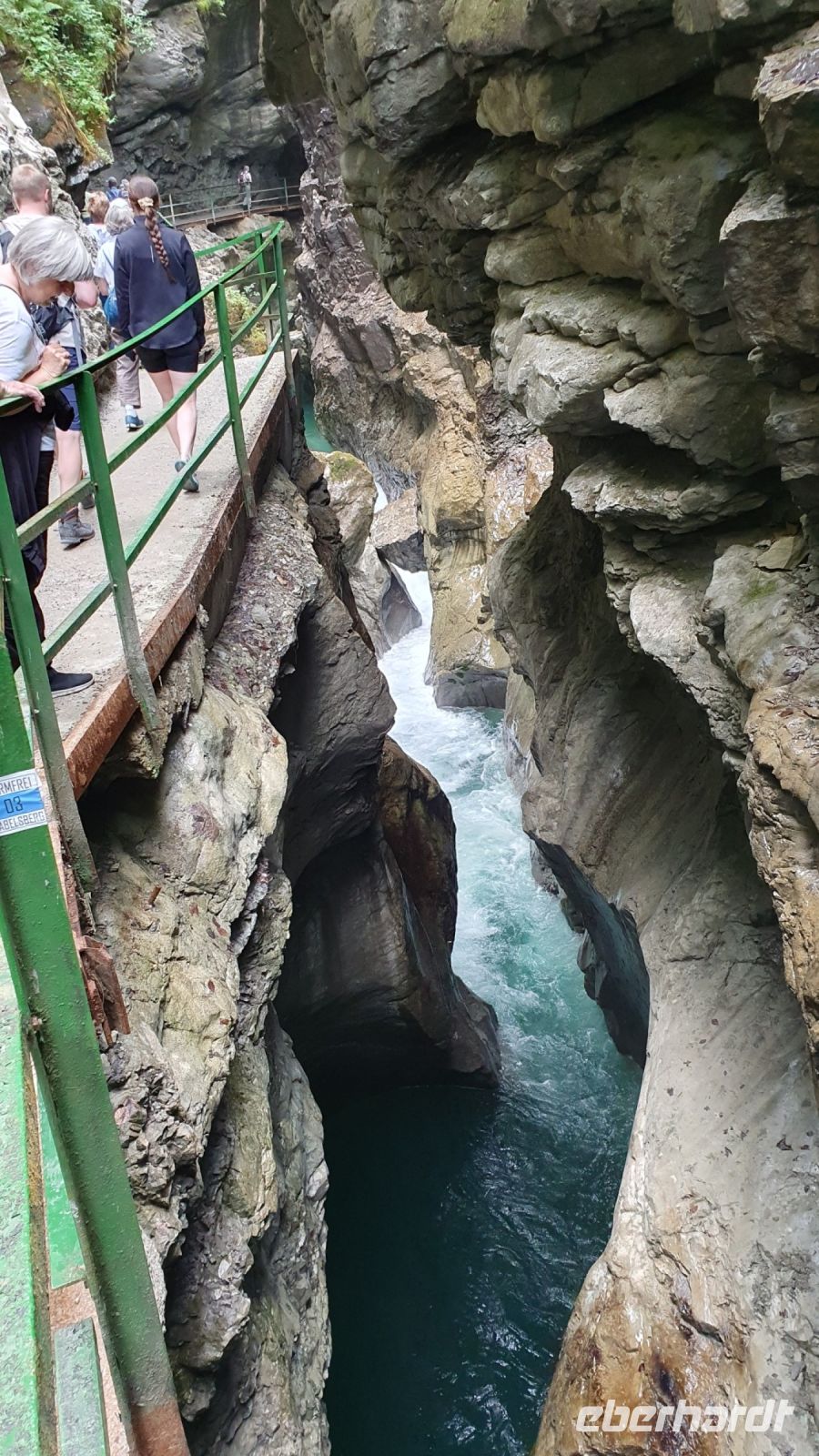 Heute morgen fuhren wir zunächst mit dem Bus raus aus dem Kleinwalsertal bis zur Haltestelle Walserschanze direkt an der Grenze. Zu Fuss ging es dann ca. 200 Meter entlang der Strasse in Deutschland und anschliessend bergab Richtung Breitachklamm auf dem Zwingsteig. Wir überquerten auf einer hohen Brücke die Breitachklamm und stiegen auf der anderen Seite im Wald auf einem schönen Serpentinenweg hinunter zum Eingang in die Klamm. Mit unseren online Tickets gingen wir an der langen Warteschlange vorbei und in der Breitachklamm von nun an immer bergauf, dem Wasser entgegen. Es gab unzählige Fotomotive und so liessen wir uns Zeit beim Durchwandern der Klamm. Anfangs war die Klamm noch breit, aber später wurde sie sehr schmal und der Weg führte oft unter den Felsen hindurch. Wir kamen an den Hochwassermarken vorbei und wenig später in das Gebiet des Felssturzes von 1995. Danach war der obere Ausgang erreicht und nun wanderten wir im oberen Teil der Breitachklamm bis zu der Stelle, wo ein Wanderweg wieder hinauf zur Walserschanze führte.