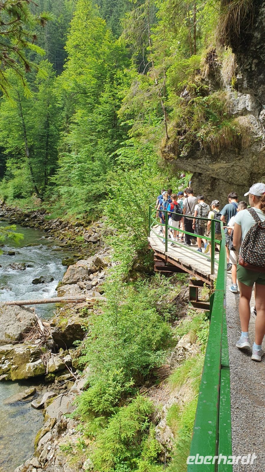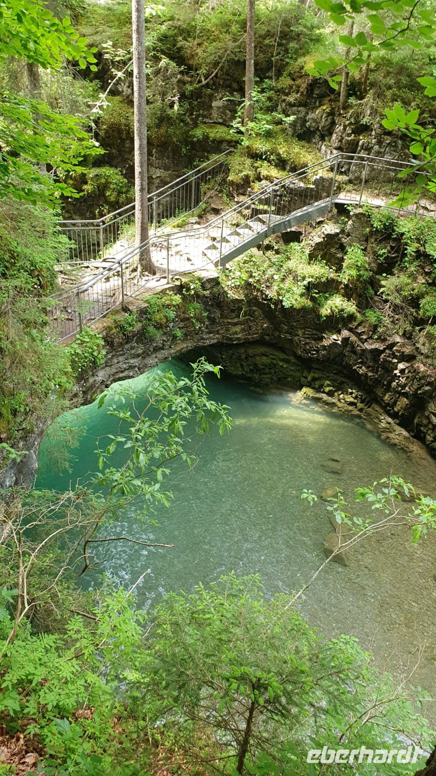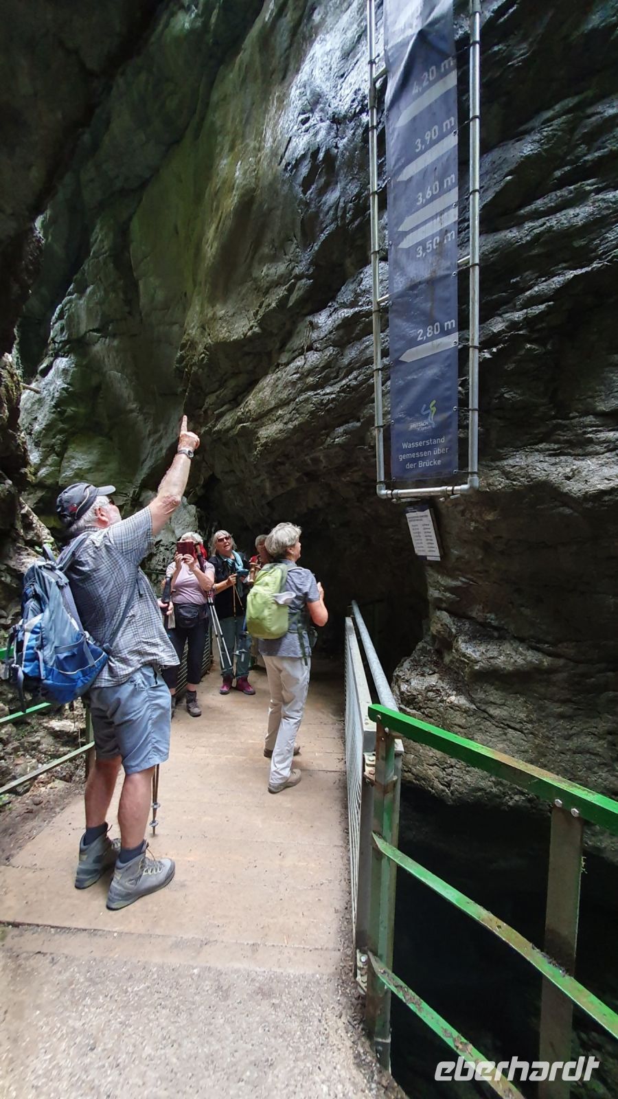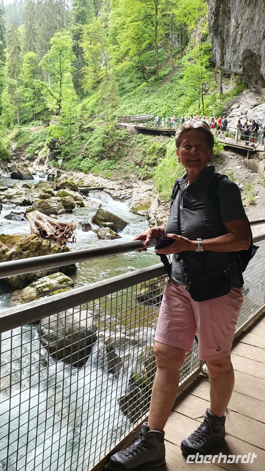 Heute morgen fuhren wir zunächst mit dem Bus raus aus dem Kleinwalsertal bis zur Haltestelle Walserschanze direkt an der Grenze. Zu Fuss ging es dann ca. 200 Meter entlang der Strasse in Deutschland und anschliessend bergab Richtung Breitachklamm auf dem Zwingsteig. Wir überquerten auf einer hohen Brücke die Breitachklamm und stiegen auf der anderen Seite im Wald auf einem schönen Serpentinenweg hinunter zum Eingang in die Klamm. Mit unseren online Tickets gingen wir an der langen Warteschlange vorbei und in der Breitachklamm von nun an immer bergauf, dem Wasser entgegen. Es gab unzählige Fotomotive und so liessen wir uns Zeit beim Durchwandern der Klamm. Anfangs war die Klamm noch breit, aber später wurde sie sehr schmal und der Weg führte oft unter den Felsen hindurch. Wir kamen an den Hochwassermarken vorbei und wenig später in das Gebiet des Felssturzes von 1995. Danach war der obere Ausgang erreicht und nun wanderten wir im oberen Teil der Breitachklamm bis zu der Stelle, wo ein Wanderweg wieder hinauf zur Walserschanze führte.