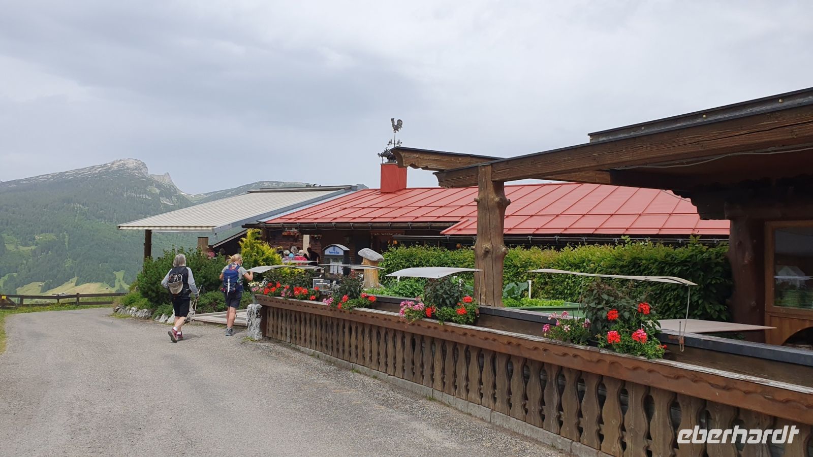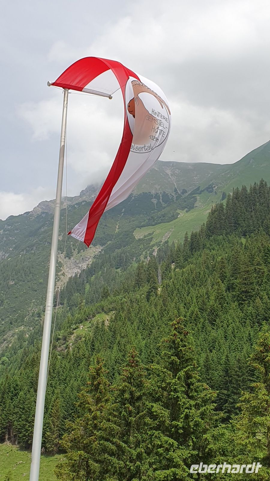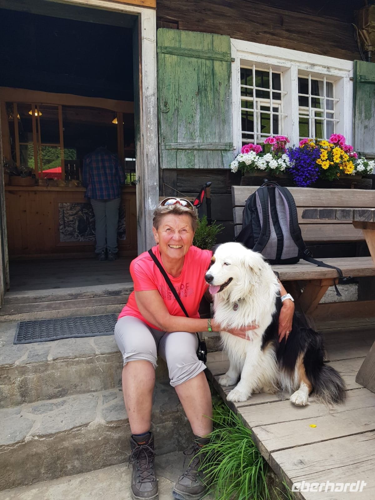 Ab der Haltestelle Walserschanze nahmen wir gegen 12 Uhr den Bus wieder hinein ins Kleinwalsertal bis zur Haltestelle Gemse hinter Mittelberg. Wir kamen an einem alten Walserhaus vorbei, welches heute ein Baudenkmal ist und noch bewohnt wird. Besonders interessant waren die Fenster, in der Mitte mit einem "Zwischenfenster" ausgestattet, welches bei Wind gut zu öffnene ist. Im Winter werden von außen zum Schutz noch Doppelfenster eingehangen, so wie wir es auch von uns in Sachsen kannten früher. Im Tal der Gemstel wanderten wir bergan bis zur hinteren Gemstelalm, mit dem wohl schönsten Almenwirt im Kleinwalsertal. Es war sehr unterhaltsam, bei ihm in der Almhütte die Speisen und Getränke zu holen und das Angebot war wieder sehr reichlich. Über dem Widderstein hatte sich eine große schwarze Wolke festgesetzt und so blieben wir nicht all zu lange sitzen, sondern traten den Rückweg an auf der anderen Talseite.