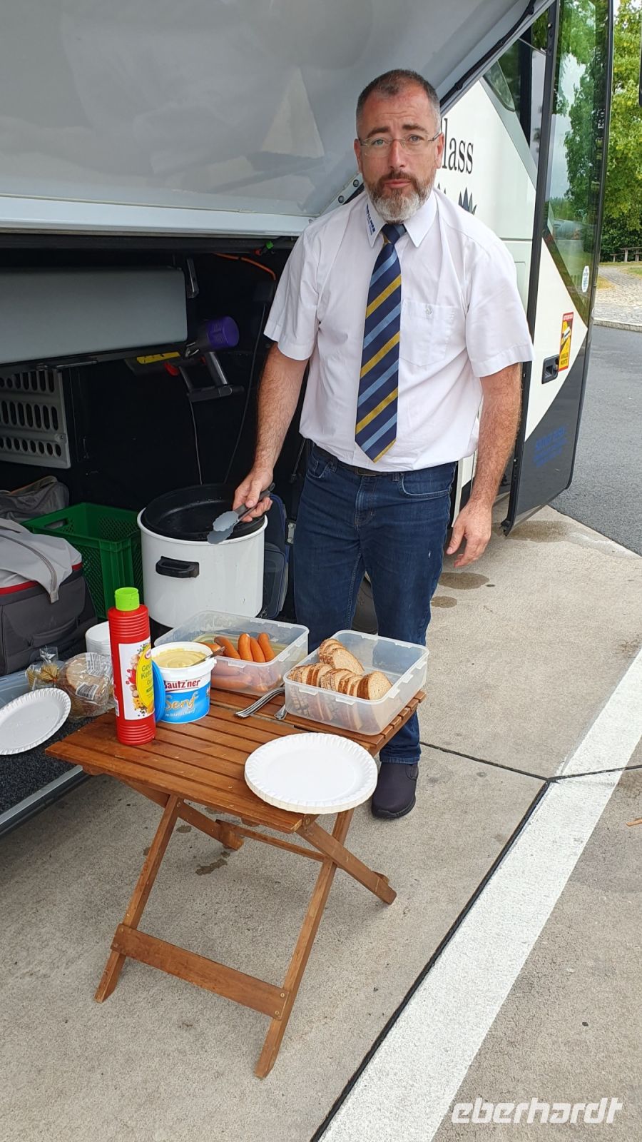 Gegen 8.30 Uhr waren alle Koffer verladen und wir starteten mit einem grossen Bus zur Heimreise. Wir kamen gut voran, machten Pausen an der Raststätte Lonetal und Mittagspause an der Raststätte Fränkische Schweiz. Und da überraschte uns Fahrer Philipp zu Mittag mit einem grünen Bohneneintopf und der war so richtig lecker. Auch die Würste haben gemundet und nun gings auf zur letzten Etappe. An verschiedenen Ausstiegsstellen verliessen uns die Gäste nach und nach und in Chemnitz war die Busfahrt zu Ende. Die Gäste nach Dresden fuhren mit einem Kleinbus weiter.