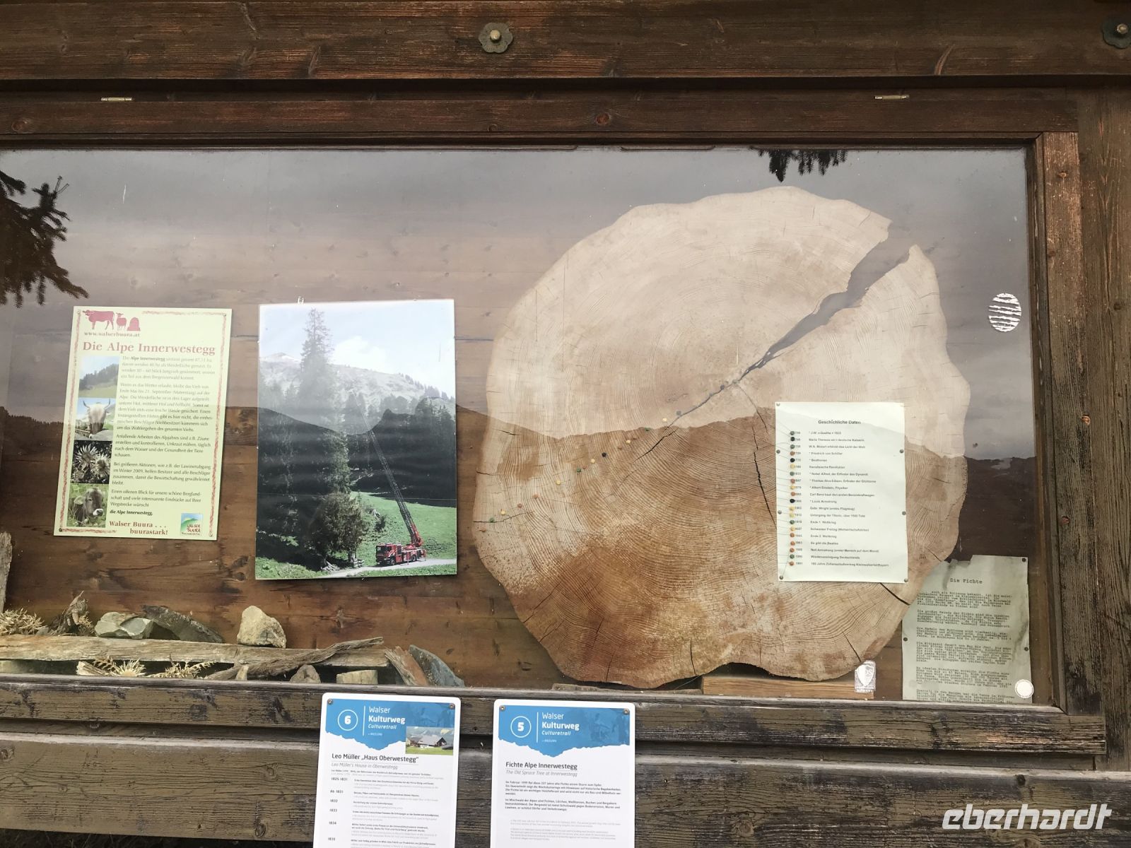 In einem Schaukasten bewunderten wir eine Fichtenholzscheibe, auf der sind die Jahresringe gekennzeichnet - diese Fichte muss über 200 Jahre alt gewesen sein.