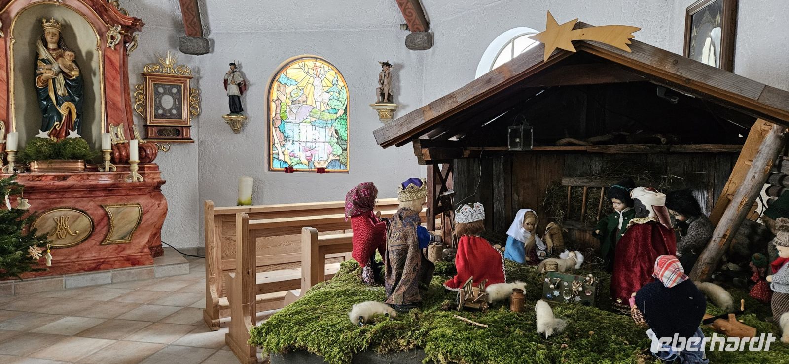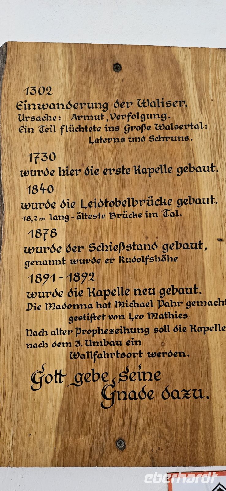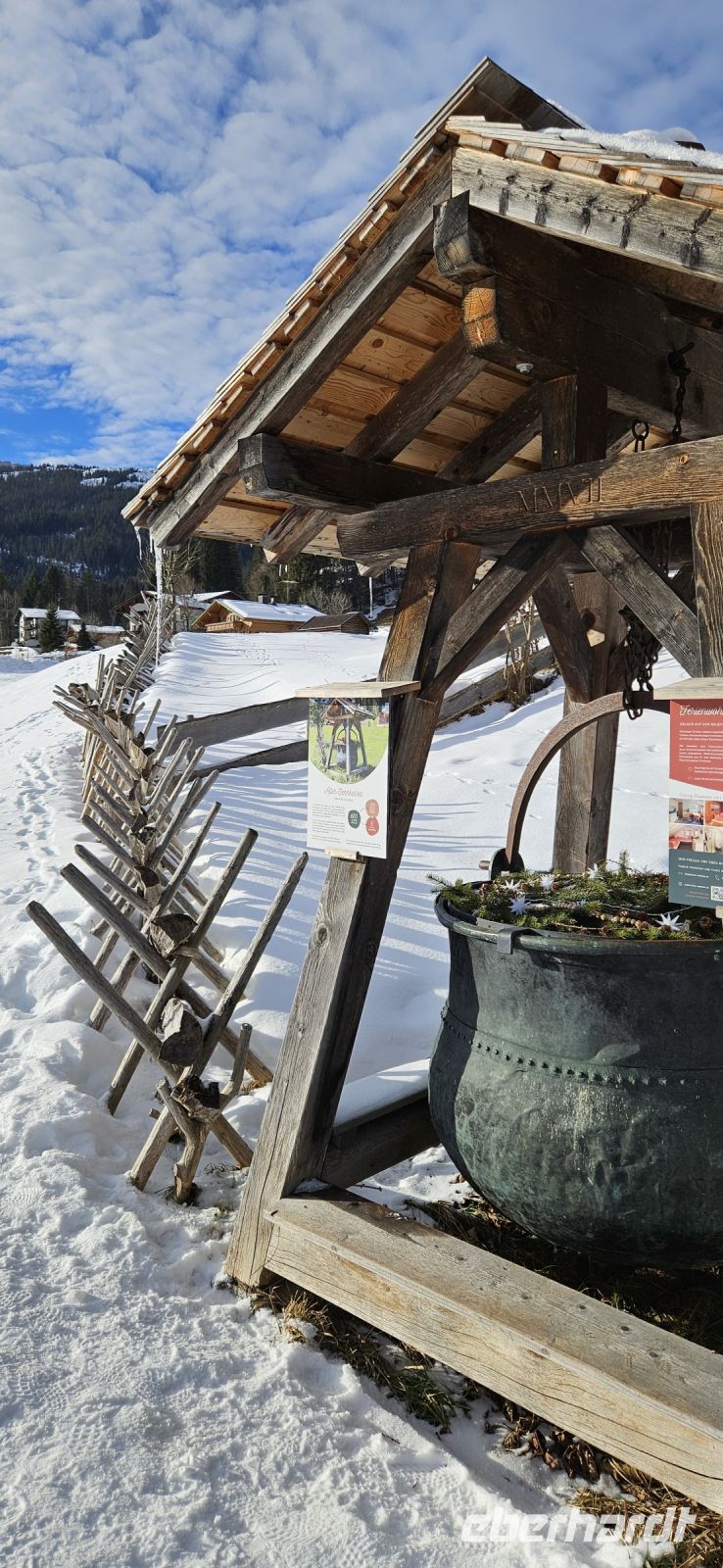 Mit dem Bus Nr.5 fuhren wir zur Talstation der Ifenseilbahn und schwebten hinauf auf 2000 m Höhe. Ein Traumwetter mit Sonnenschein, viel Schnee und fast windstill begleitete uns auf der Wanderung über den Gottesacker. Der Winterwanderweg war vorbildlich präpariert und führte auf einer Strecke von ca. 5 km im ständigen Auf und Ab über das Hochplateau. Die Sicht war grandios und wir konnten sogar die Zugspitze entdecken und bis zum Bodensee, der mit Wölkchen bedeckt war, schauen. Unterwegs gab es einen Zirbenschnaps zur Belohnung. Gegen Mittag fuhren wir mit der Ifenbahn wieder hinunter und an der Talstation kehrten wir in der urigen Auenhütte zum Mittagessen ein. Über Wäldle und Au wanderten wir zurück zum Hotel und hatten immer noch eine gute Sicht auf die umliegenden Gipfel. Unterwegs kamen wir an der kleinen Bruder Klaus Kapelle vorbei und an einem grossen Kupferkessel, der einst auf einer Almsennerei seinen Dienst tat.